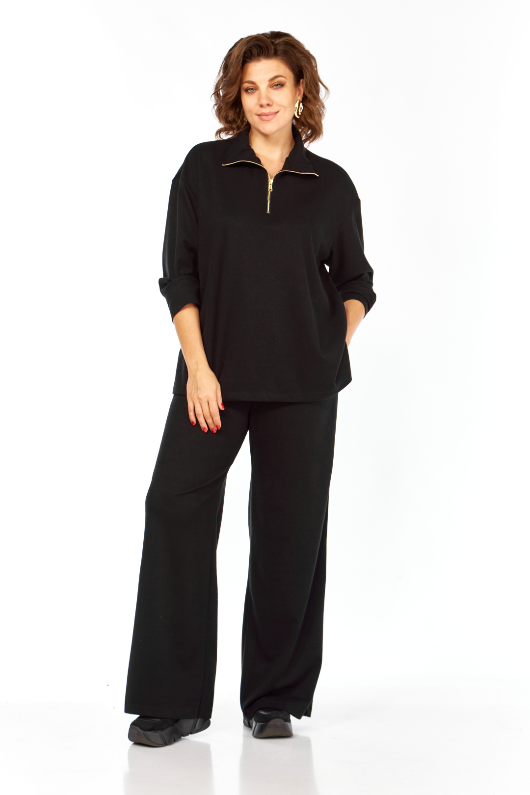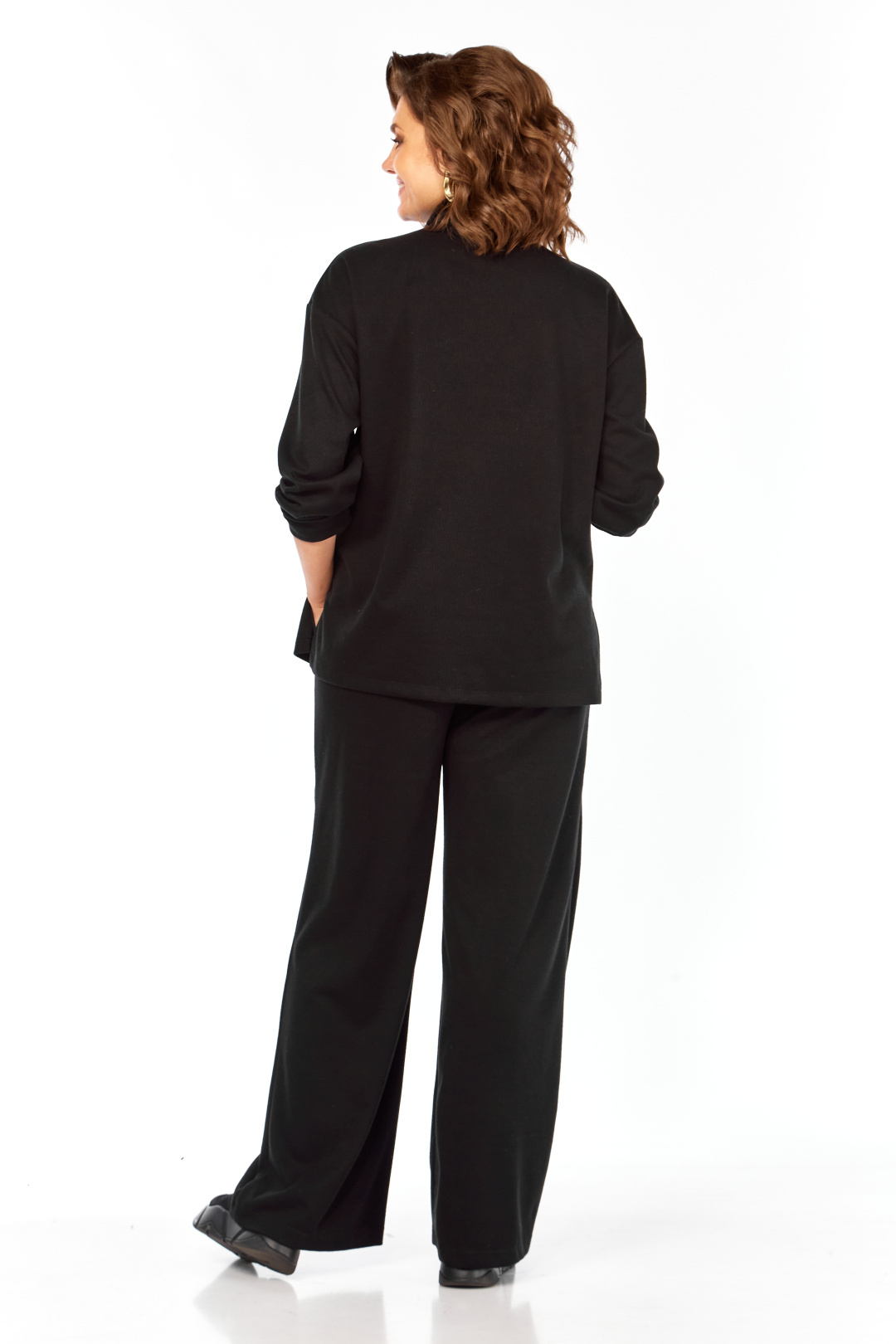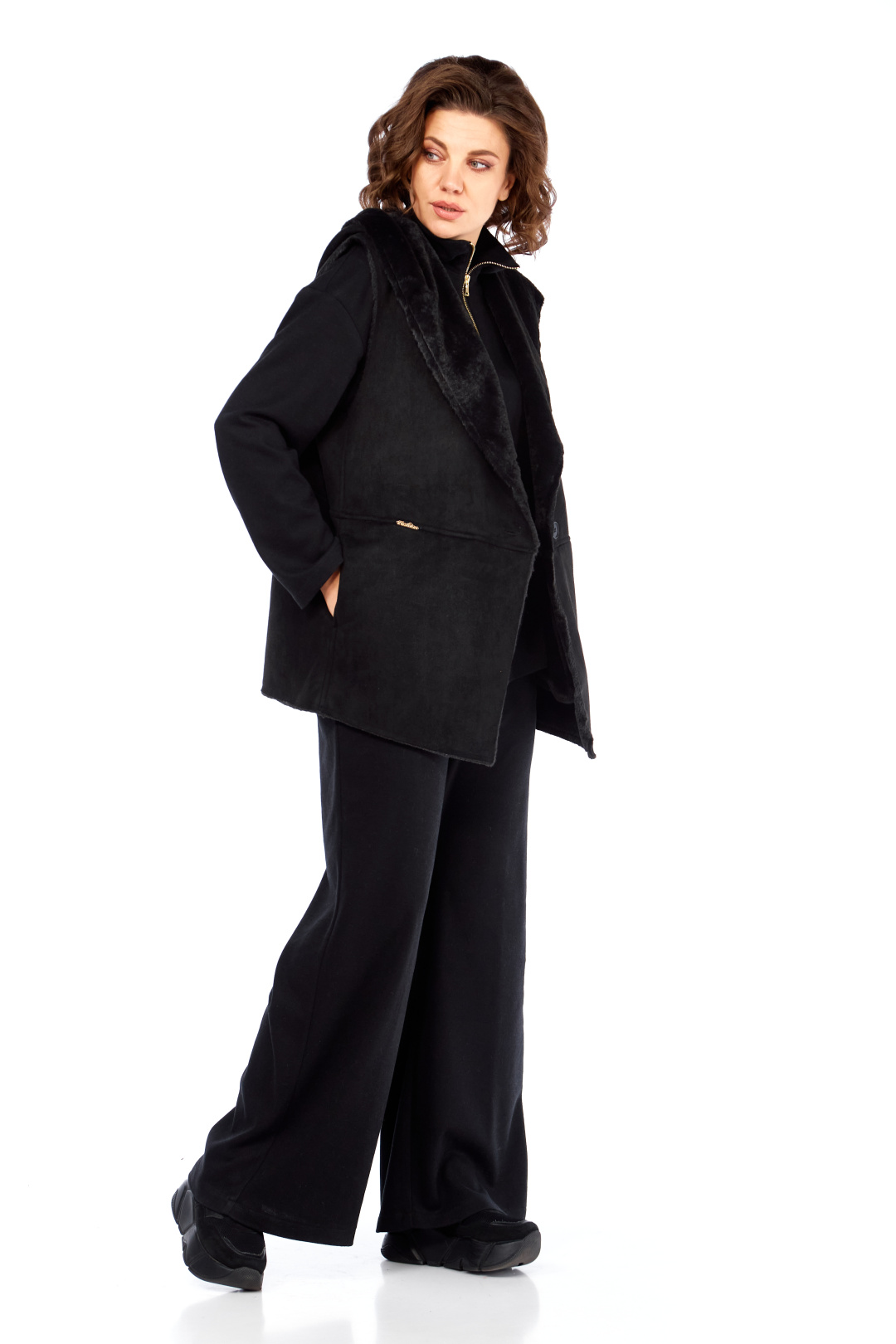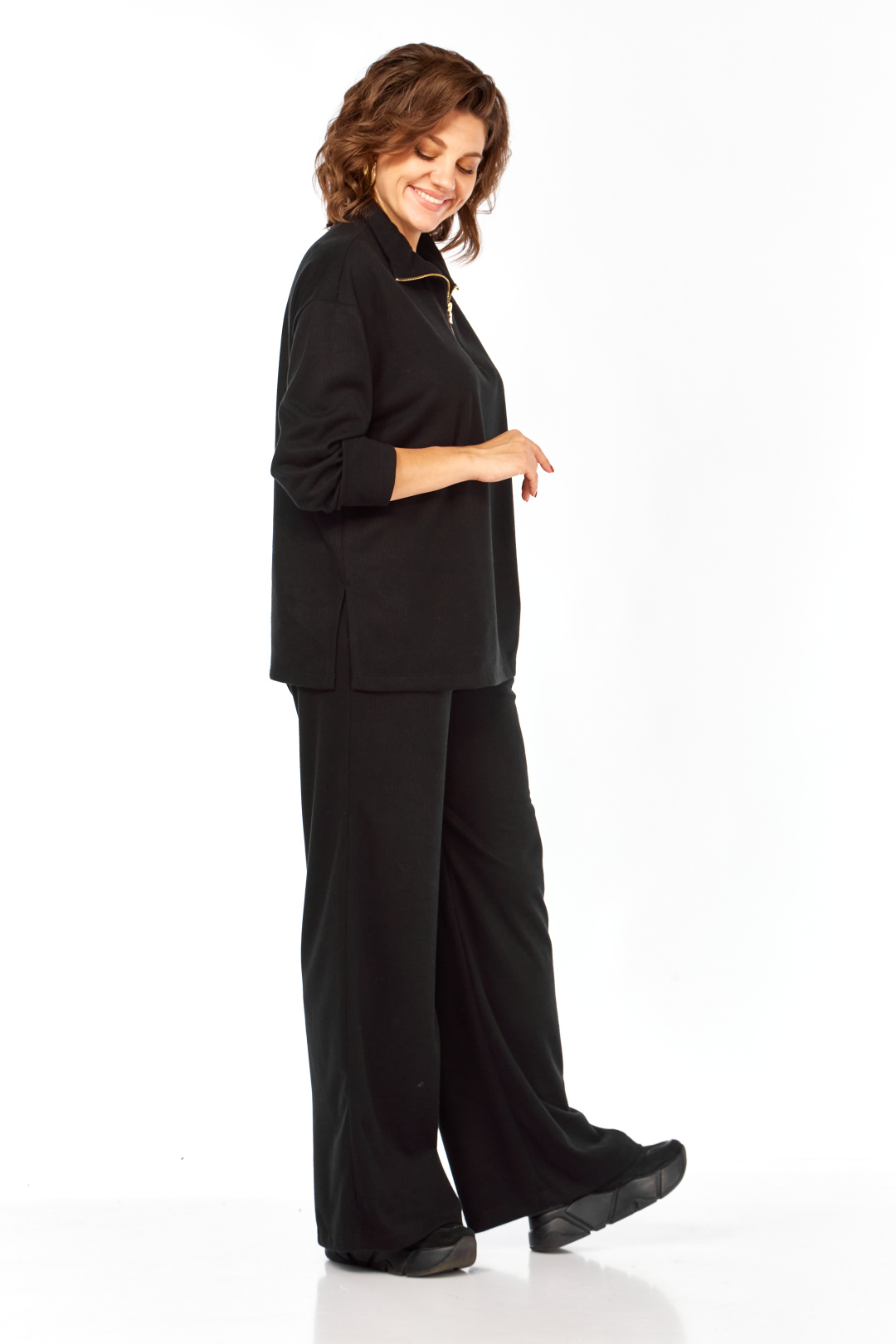 Комплект брючный состоит из кофты, жилетки и брюк. Кофта полуприлегающего силуэта со спущенным плечом, рукав втачной, одношовный. Воротник стойка с застежкой на тесьму-молнию. По боковым швам разрезы. Брюки расширенные книзу, верхний срез обработан поясом с резинкой. В боковых швах карманы. Жилетка свободного кроя со смещенной застежкой на петлю и пуговицу. По спинке горизонтальный рельефный шов на перед, в котором обработаны карманы. Цельнокроенный капюшон с центральной частью. В качестве отделки используется фурнитура.