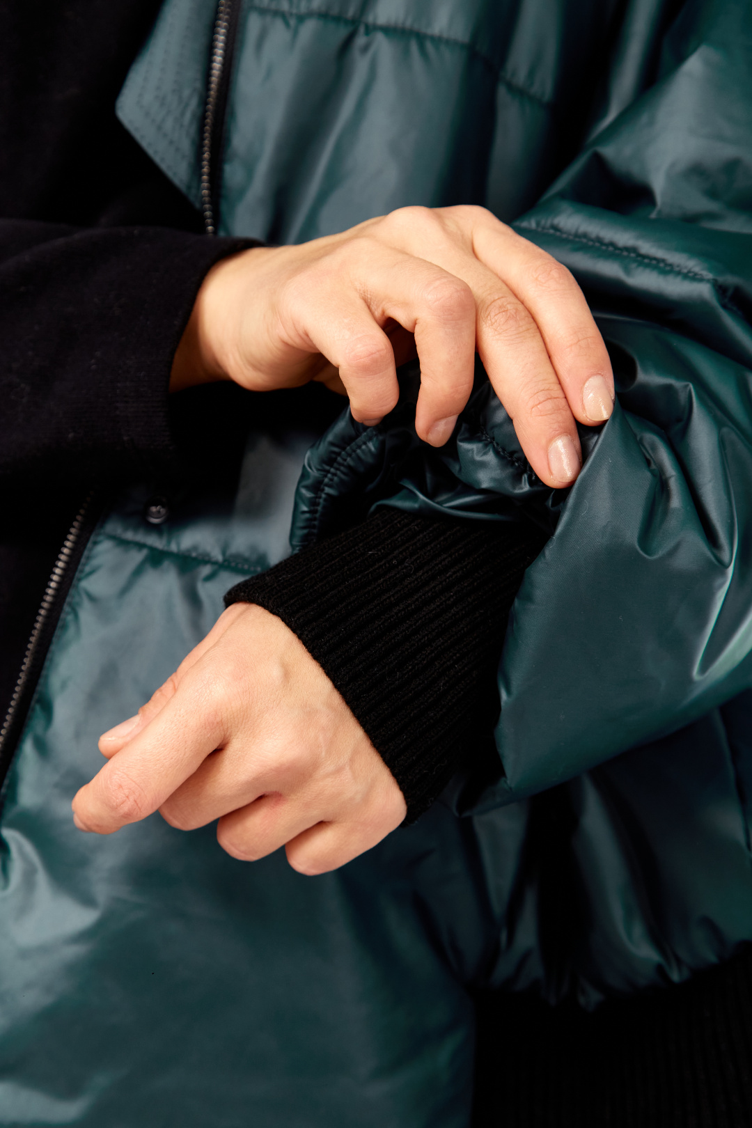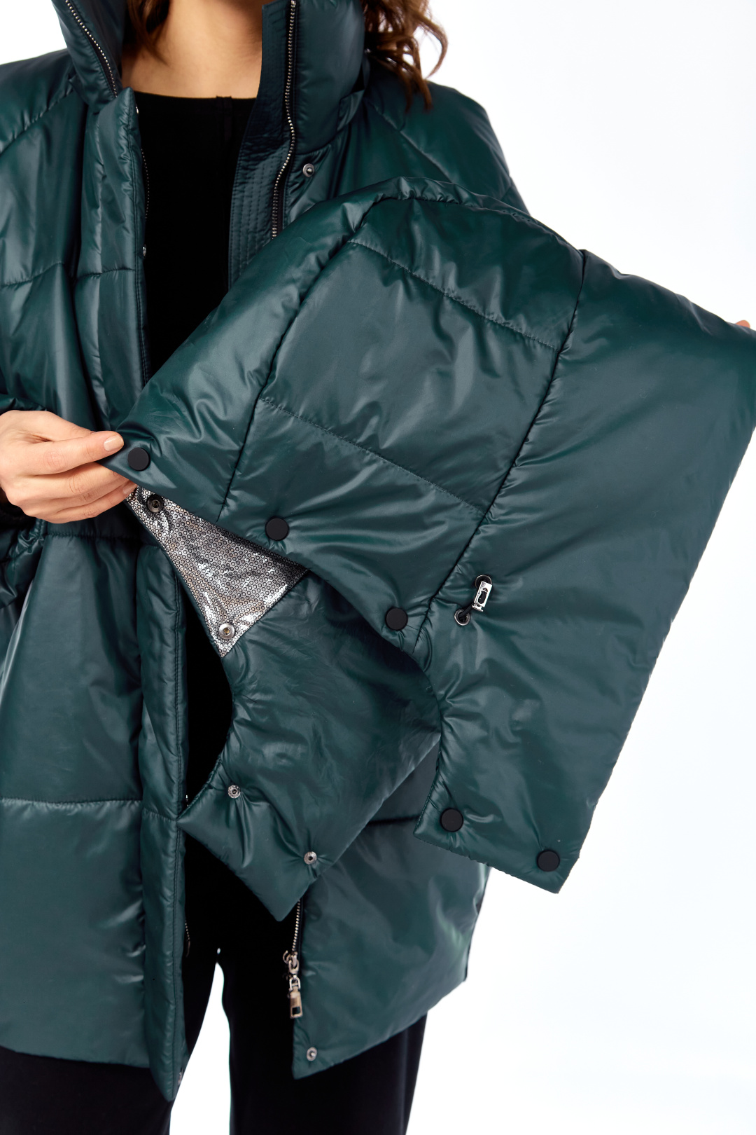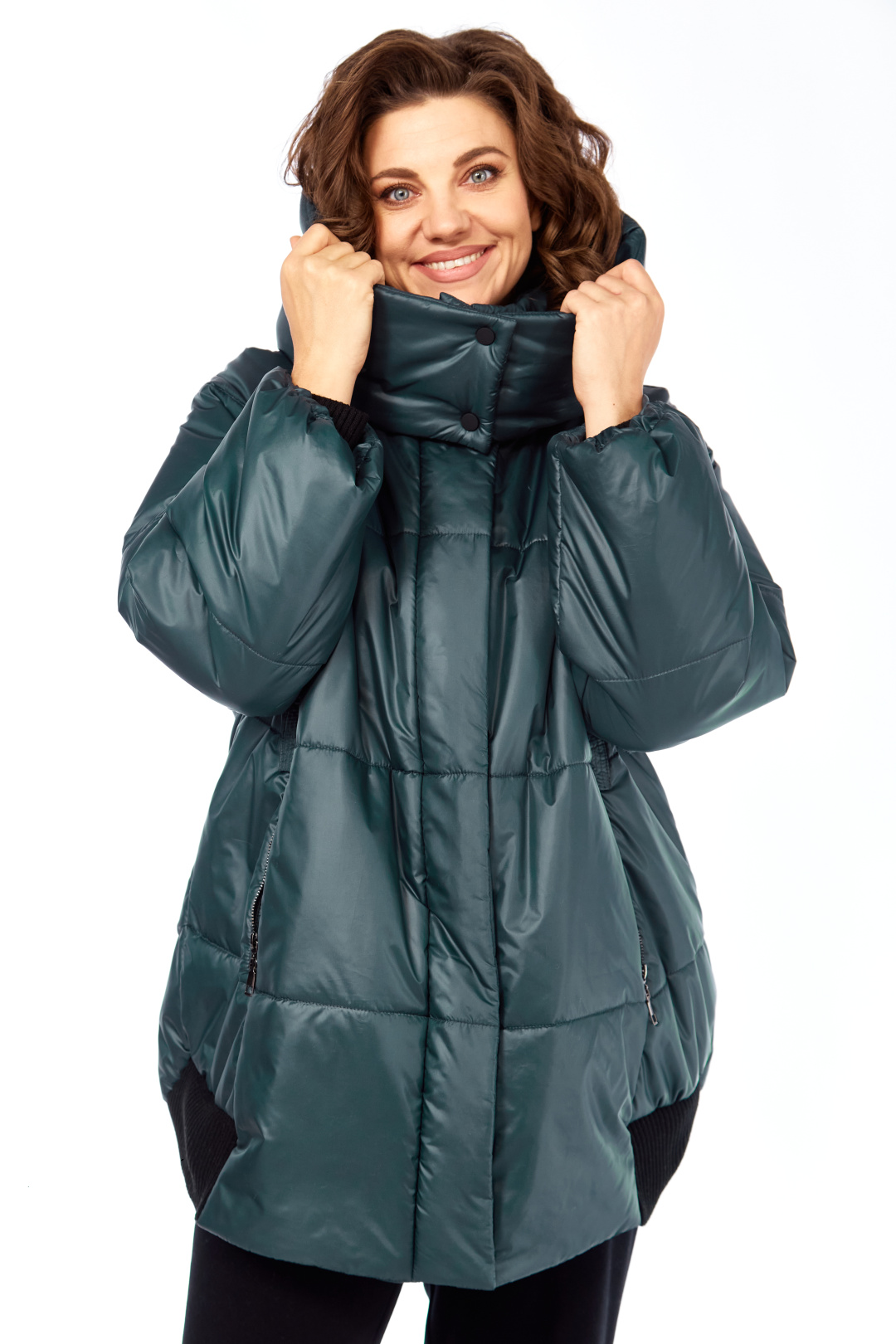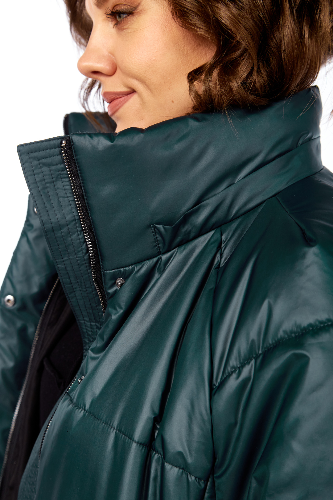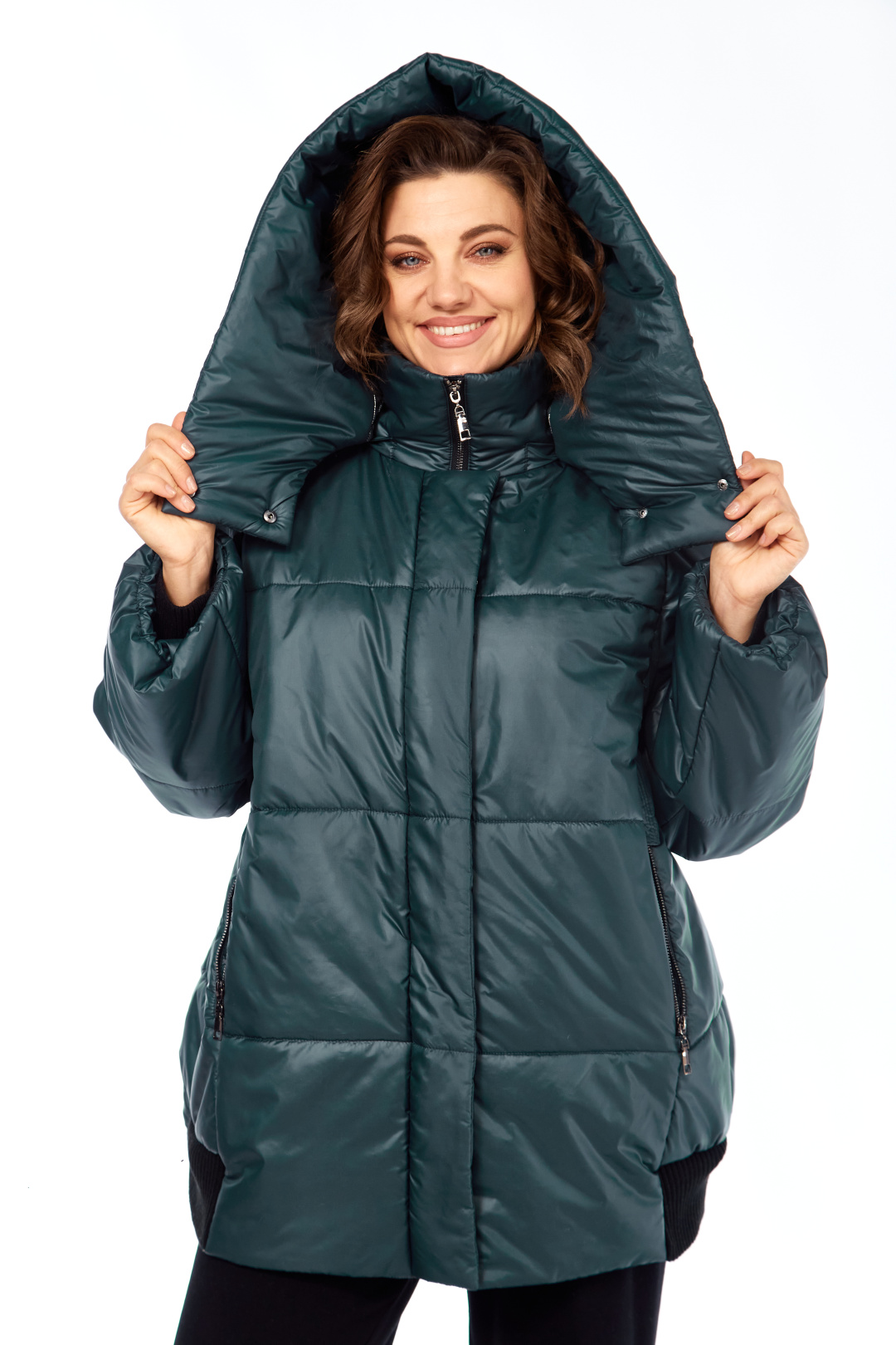 Куртка женская, прямого силуэта с рукавом реглан. Застежка центральная на тесьму молнию и планку с кнопками. По спинке рельефные швы. По переду рельефные швы, в швах карманы с молнией и отделочной деталью, по низу боковых швов-довяз. Рукав реглан с вытачкой и манжетом(довяз)- по низу. Воротник стойка. Капюшон с центральной частью, с отделочной деталью по отлету (застежка на кнопки)-съемный, фиксируется с помощью кнопок. На центральной части под молнией -ветровик. В качестве отделки используется фурнитура и детали. Температурный режим до -10 градусов. Длина по спинке 85 см, длина рукава 72 см.