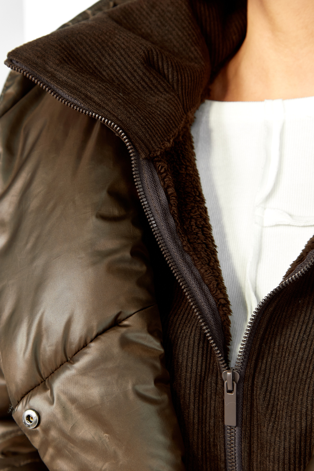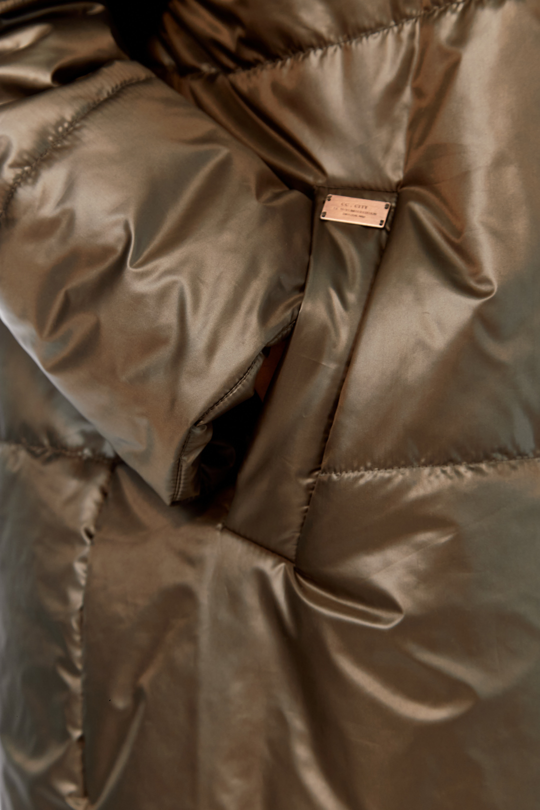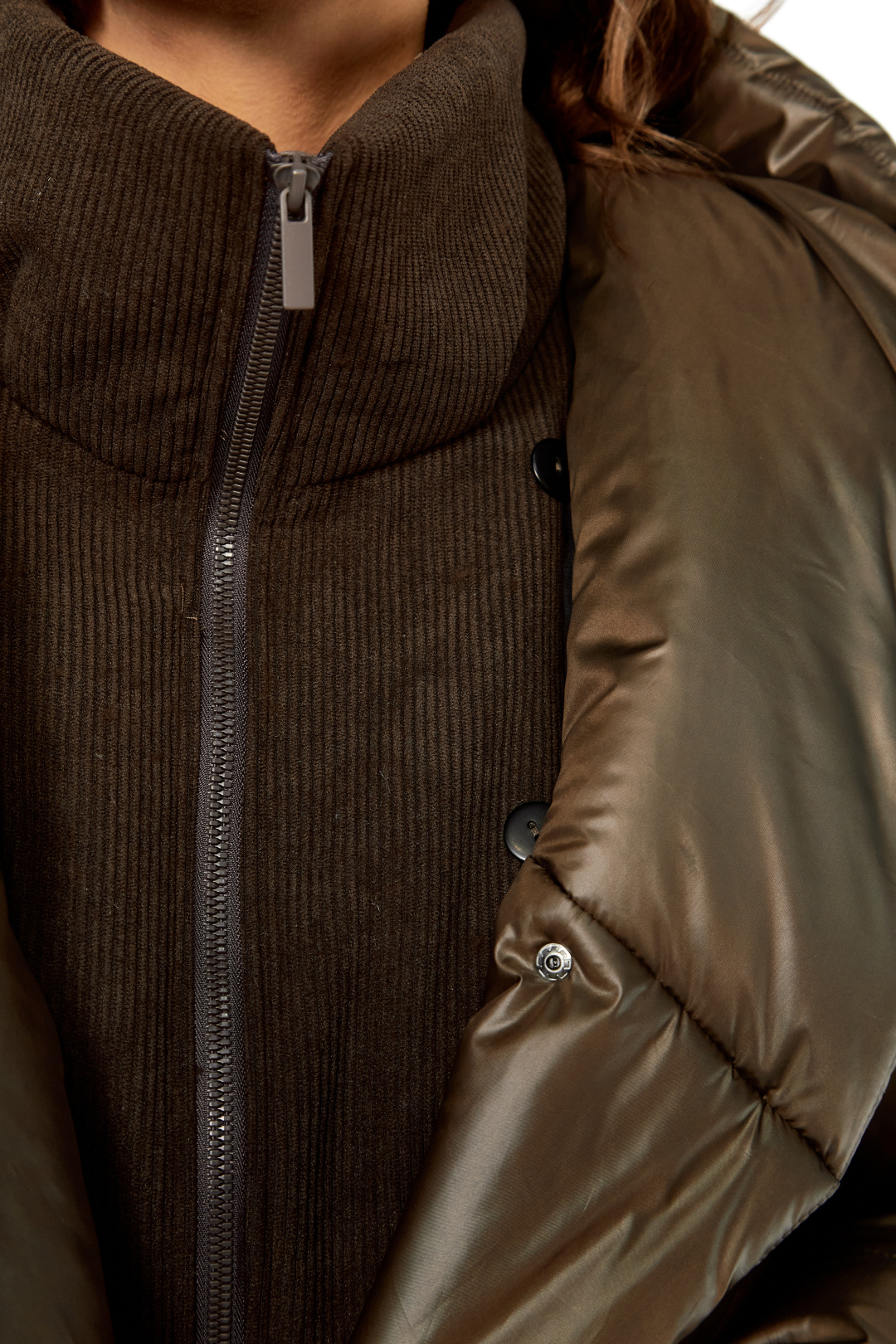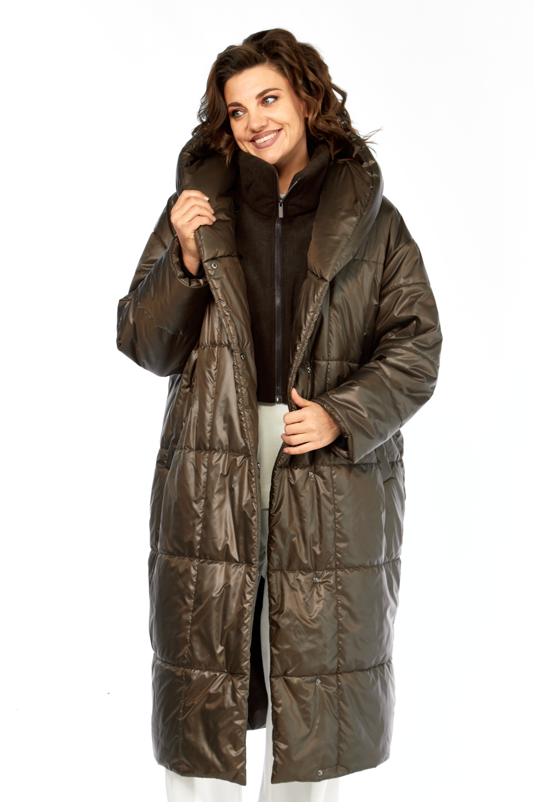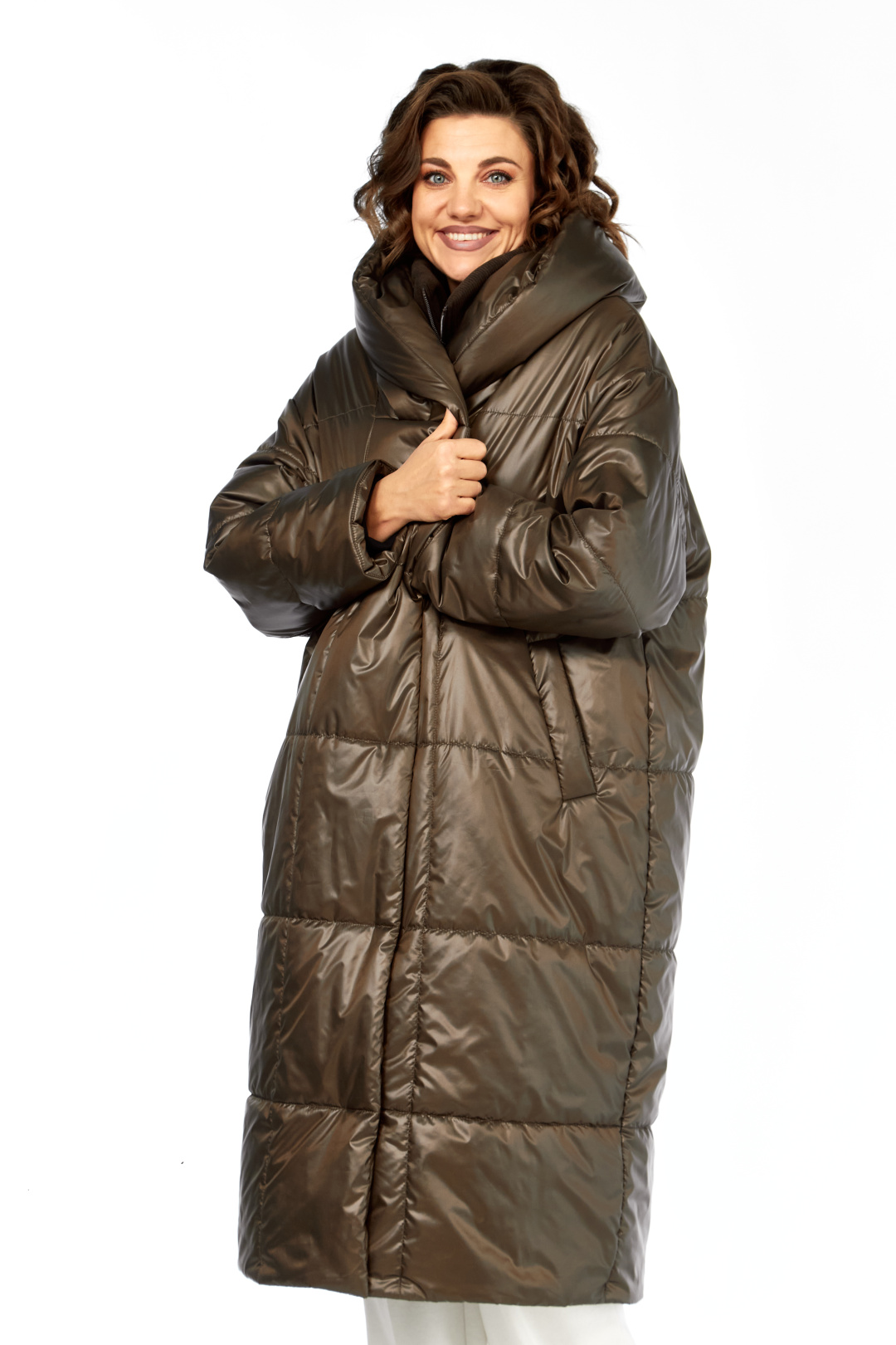 Пальто женскоеполуприлегающего силуэта со смещенной застежкой на кнопки. По переду прорезные карманы с листочкой. Рукав втачной одношовный с притачным манжетом по низу из отделочной ткани (довяз). Капюшон с объемный отделочной деталью по отлету, по горловине переда заложены складки. В качестве отделки используется манишка съемная с застежкой на тесьму-молнию (из отделочной ткани) фиксируется с помощью пуговиц и навесных петель-резинок на изделии. Используется утеплитель синтепон 200. Подходит под температурный режим до -10 градусов. Длина по спинке 116 см, длина рукава 54 см.