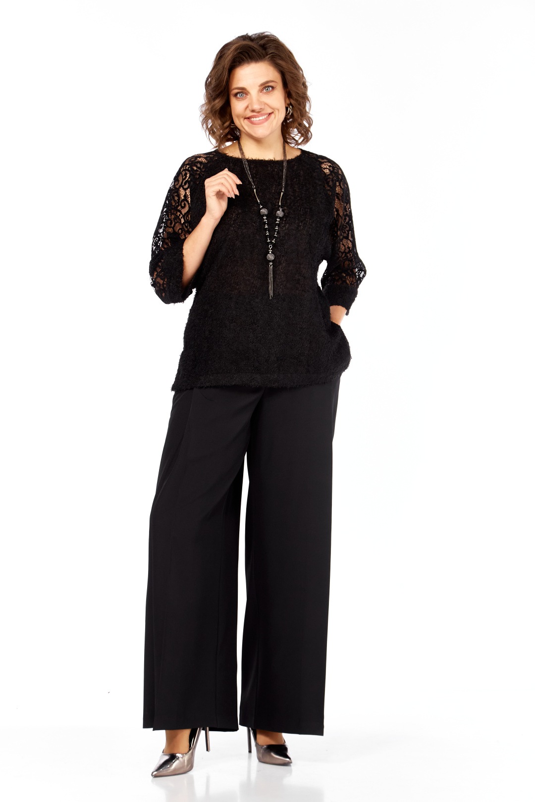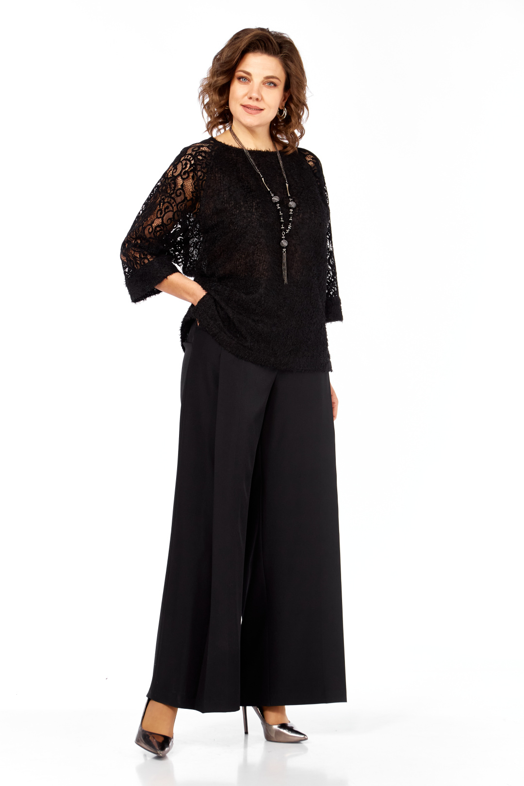 Комплект женский брючный 2-х предметный. Праздничная элегантная блузка полуприлегающего силуэта, выглядит эффектно, прекрасно подойдет для вечерних мероприятий. Горловина аккуратной округлой формы. Рукав выполнен из мягкого кружева, что придает дополнительный шарм, длина 7/8. В боковых швах предусмотрены разрезы. Невероятно комфортные, элегантные брюки-палаццо, образ в котором будет привлекать к себе внимание окружающих. Идеально подходит как для офиса, так и для вечернего выхода. Брюки свободные. По переду заложены складки, в боковых швах расположены боковые карманы, застежка-молния. Пояс притачной, сзади на резинке, это обеспечивает комфортную посадку. Широкий крой палаццо добавляет образу легкость и непринужденность, стрелки визуально удлиняют силуэт.