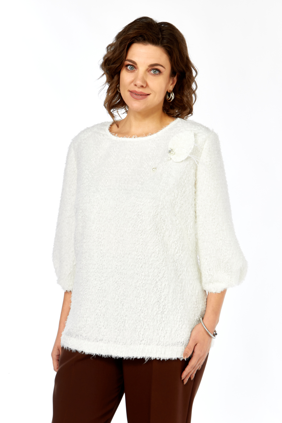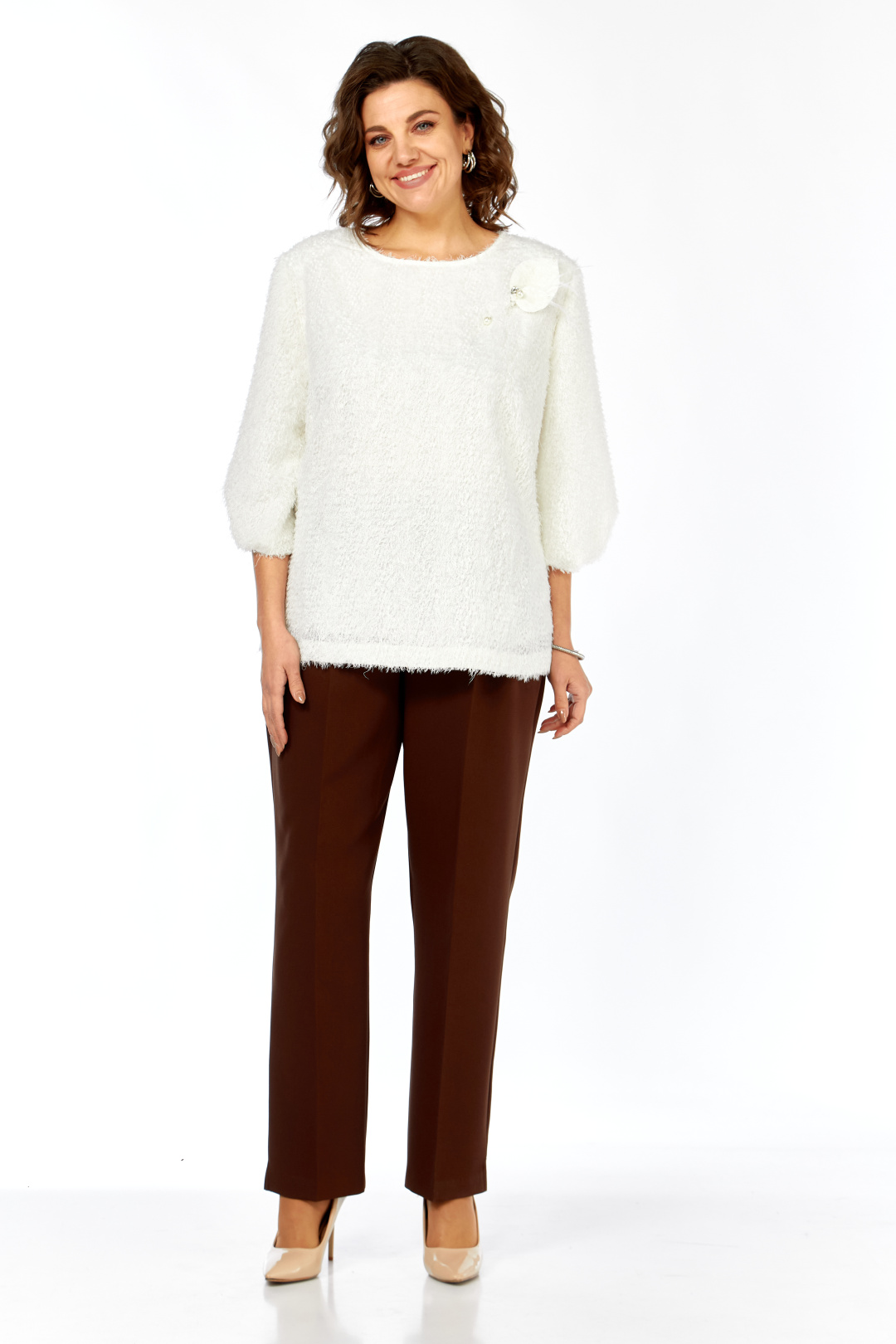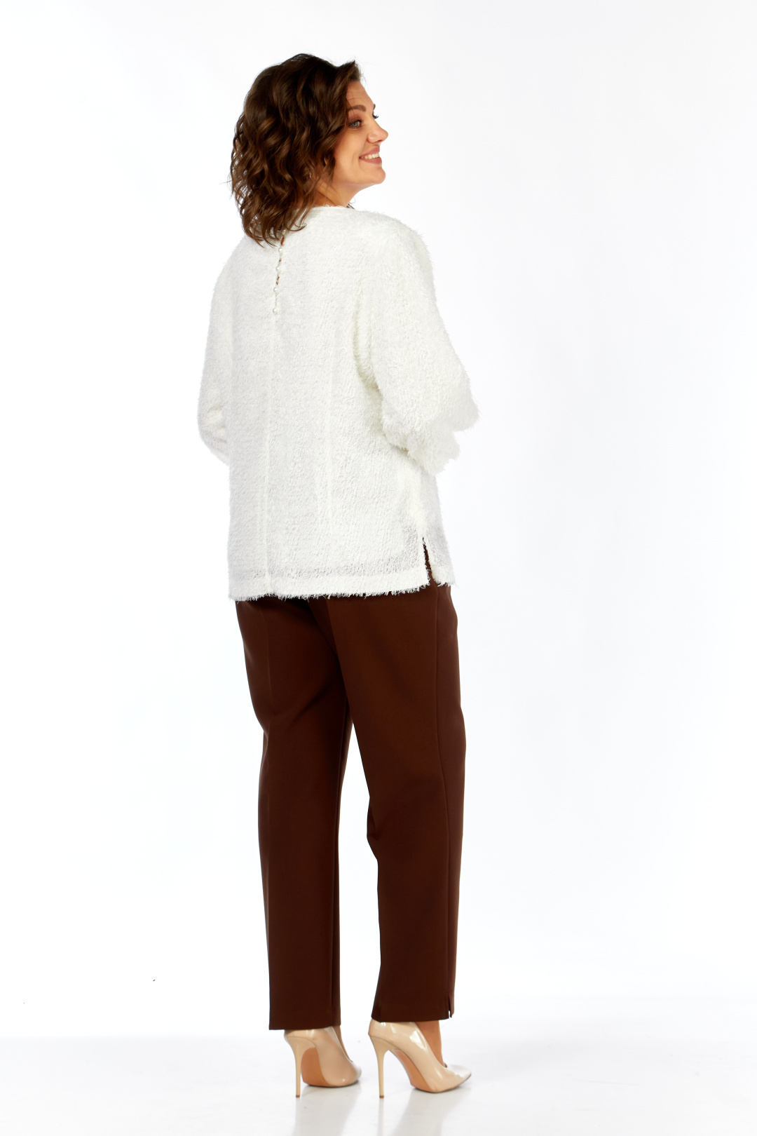 Комплект женский брючный 2-х предметный. Праздничная элегантная блузка полуприлегающего силуэта, выглядит эффектно, прекрасно подойдет для мероприятий. Горловина аккуратной округлой формы. Рукав втачной, свободный с фантазийным решение, длина 7/8. Декоративным элементом является съемная дизайнерская брошь. Средний шов спинки вверху переходит в застежку на 6 навесных петель, пуговиц. В боковых швах предусмотрены разрезы. Брюки классические с заутюженными стрелками, слегка зауженные к низу, оформлены притачным поясом, частично на резинке. Застежка спереди брюк на молнию и петлю-пуговицу.