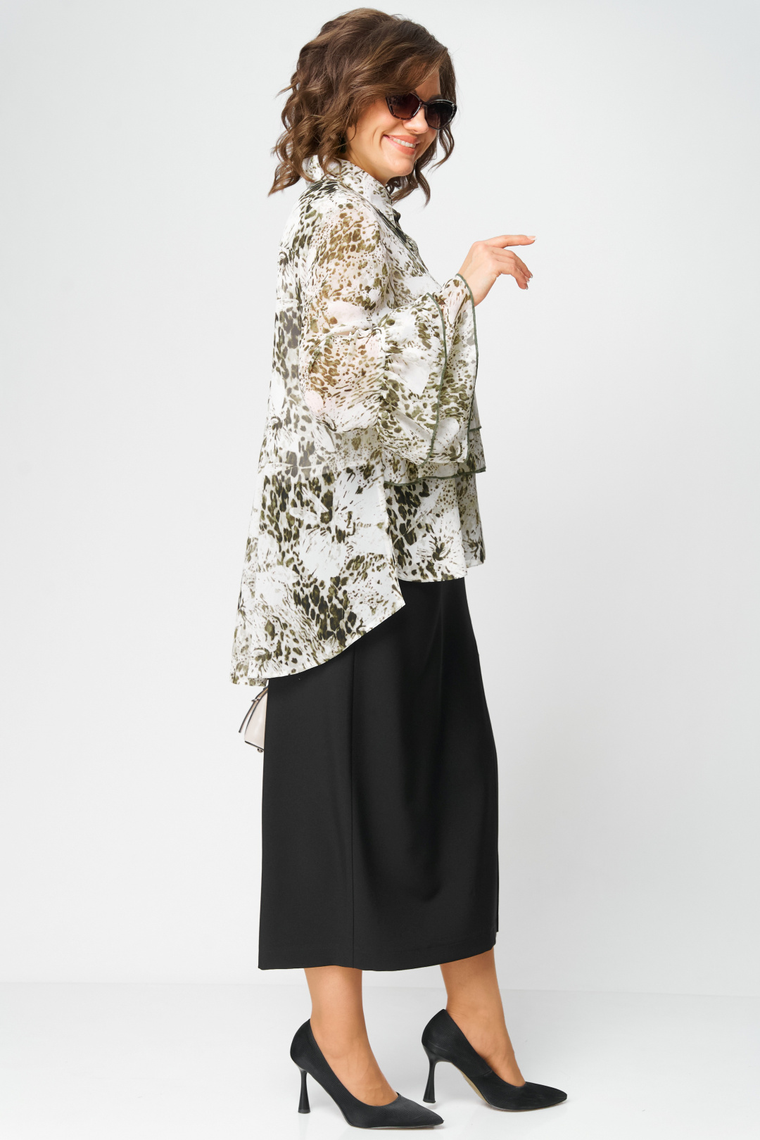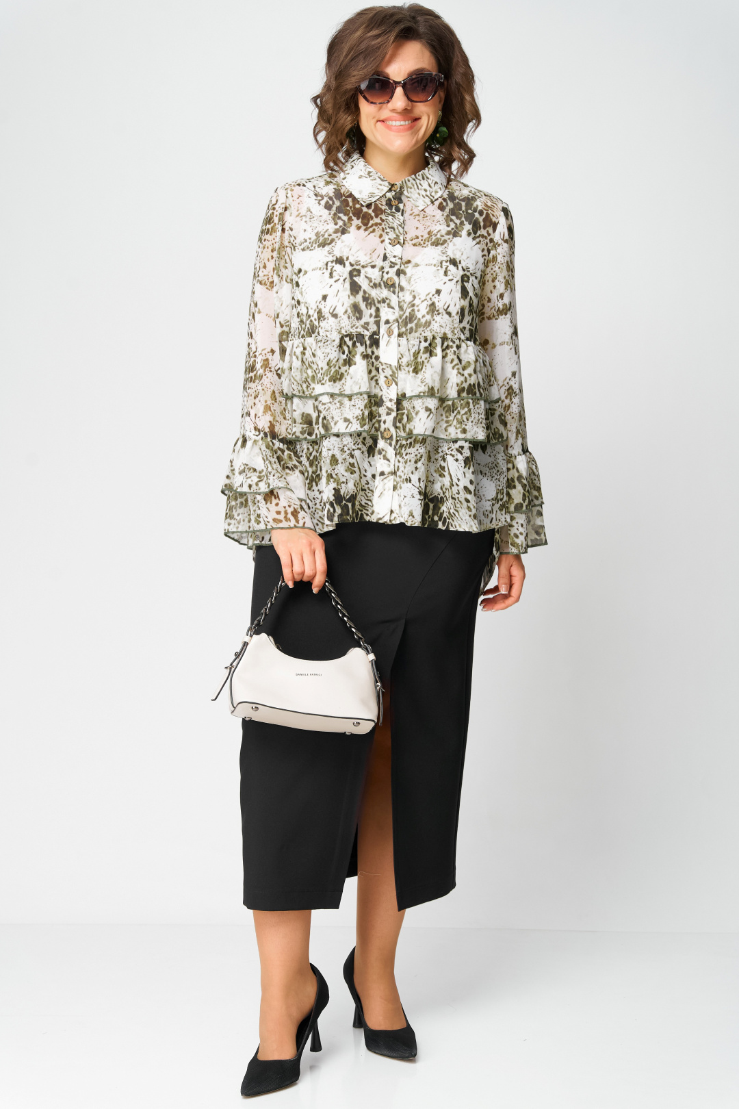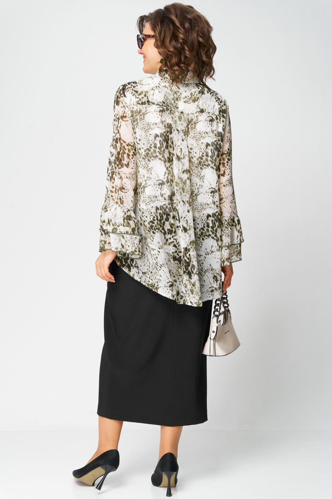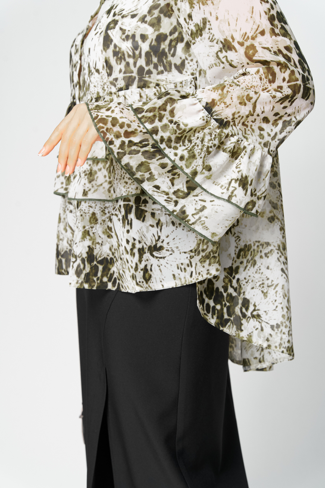 Блуза женская шикарная нарядно - повседневнаая полуприлегающего силуэта на подклдке, выполнена из красивого шифона с принтом. Вырез горловины воротник на стойке рубашечного типа, рукав втачной по низу с притачными воланми. Застежка доверху на обметанные петли и пуговицы, низ блузы фигурный (по спинке длиннее). По переду блузы притачные воланы, в боковых швах обработаны разрезы. Декором блузы служит принт амой ткани и отделочные элементы в виде воланов.