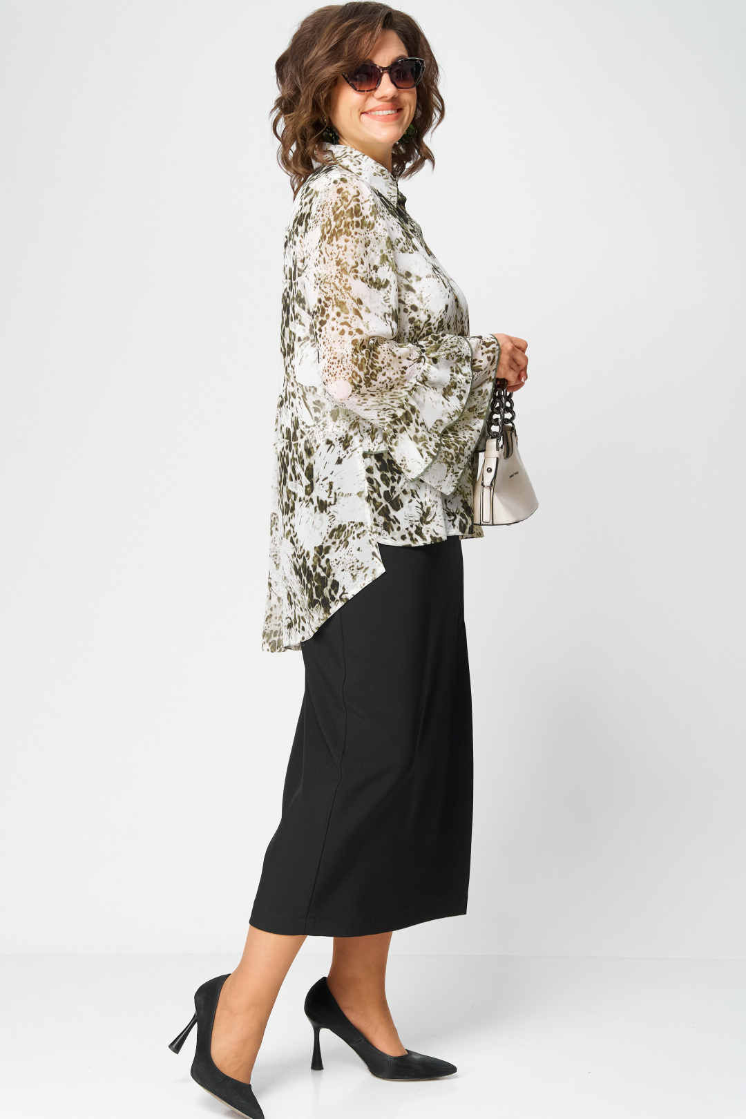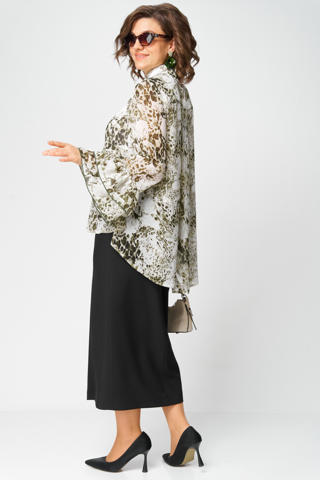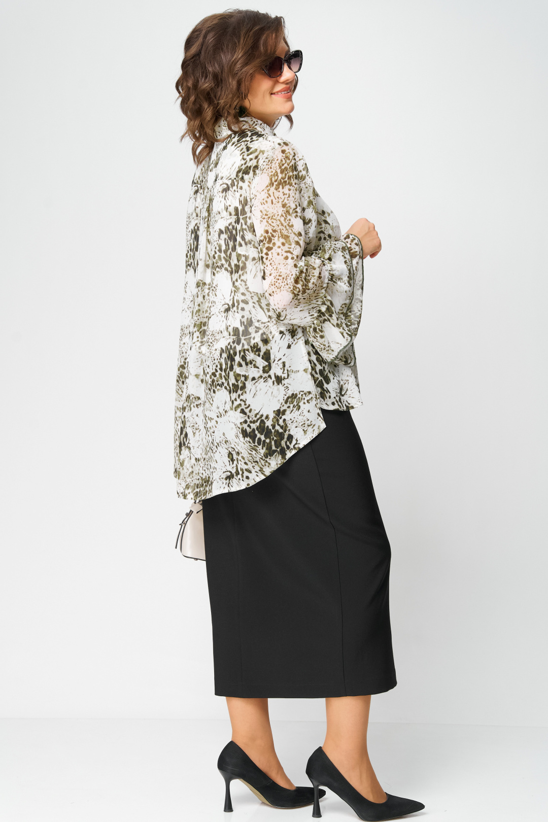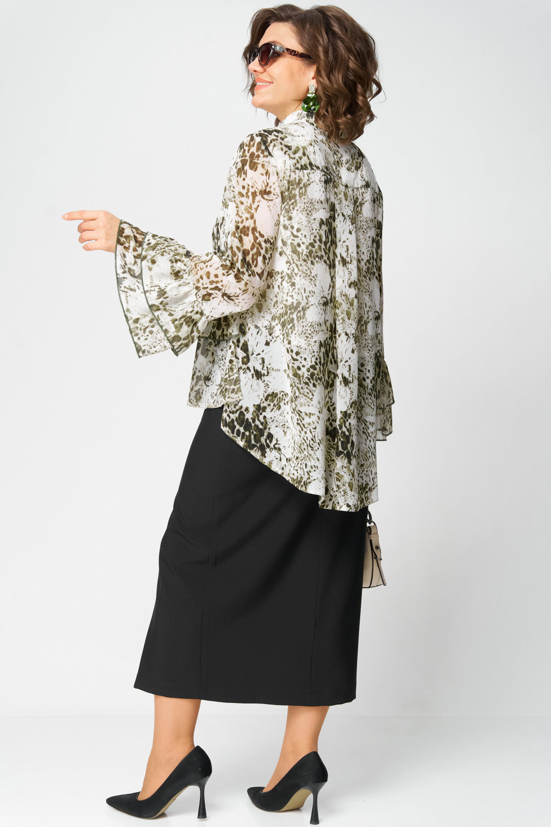 Блуза женская шикарная нарядно - повседневнаая полуприлегающего силуэта на подклдке, выполнена из красивого шифона с принтом. Вырез горловины воротник на стойке рубашечного типа, рукав втачной по низу с притачными воланми. Застежка доверху на обметанные петли и пуговицы, низ блузы фигурный (по спинке длиннее). По переду блузы притачные воланы, в боковых швах обработаны разрезы. Декором блузы служит принт амой ткани и отделочные элементы в виде воланов.