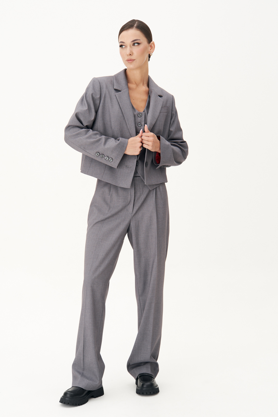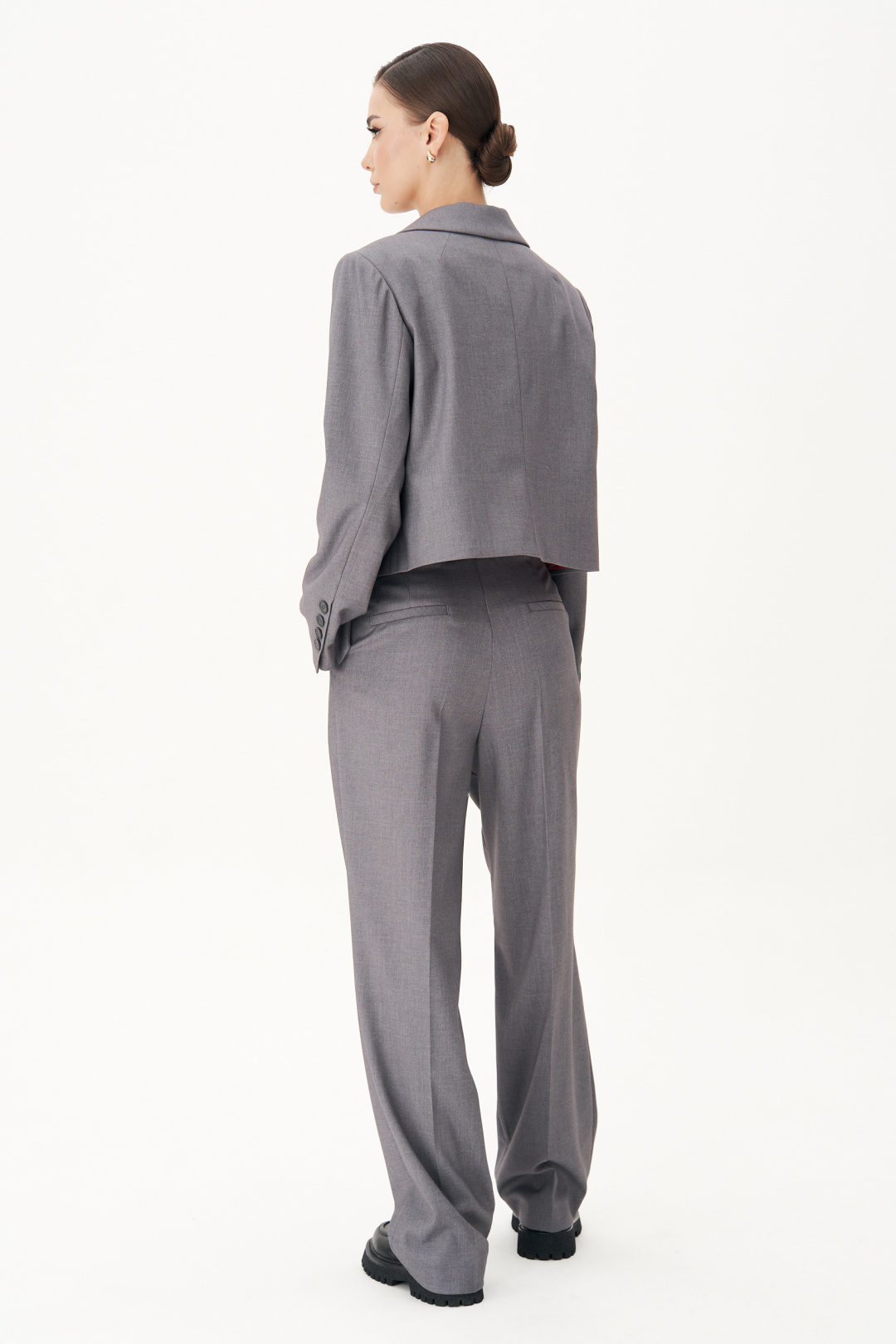 Брюки классического кроя с высокой посадкой на притачном поясе со шлёвками. Застежка брючная на потайной крючок и молнию. Передние половинки брюк с мягкой складкой-защипом и наклонными боковыми карманами. Задние половинки брюк с талиевыми вытачками и прорезными карманами с листочками.