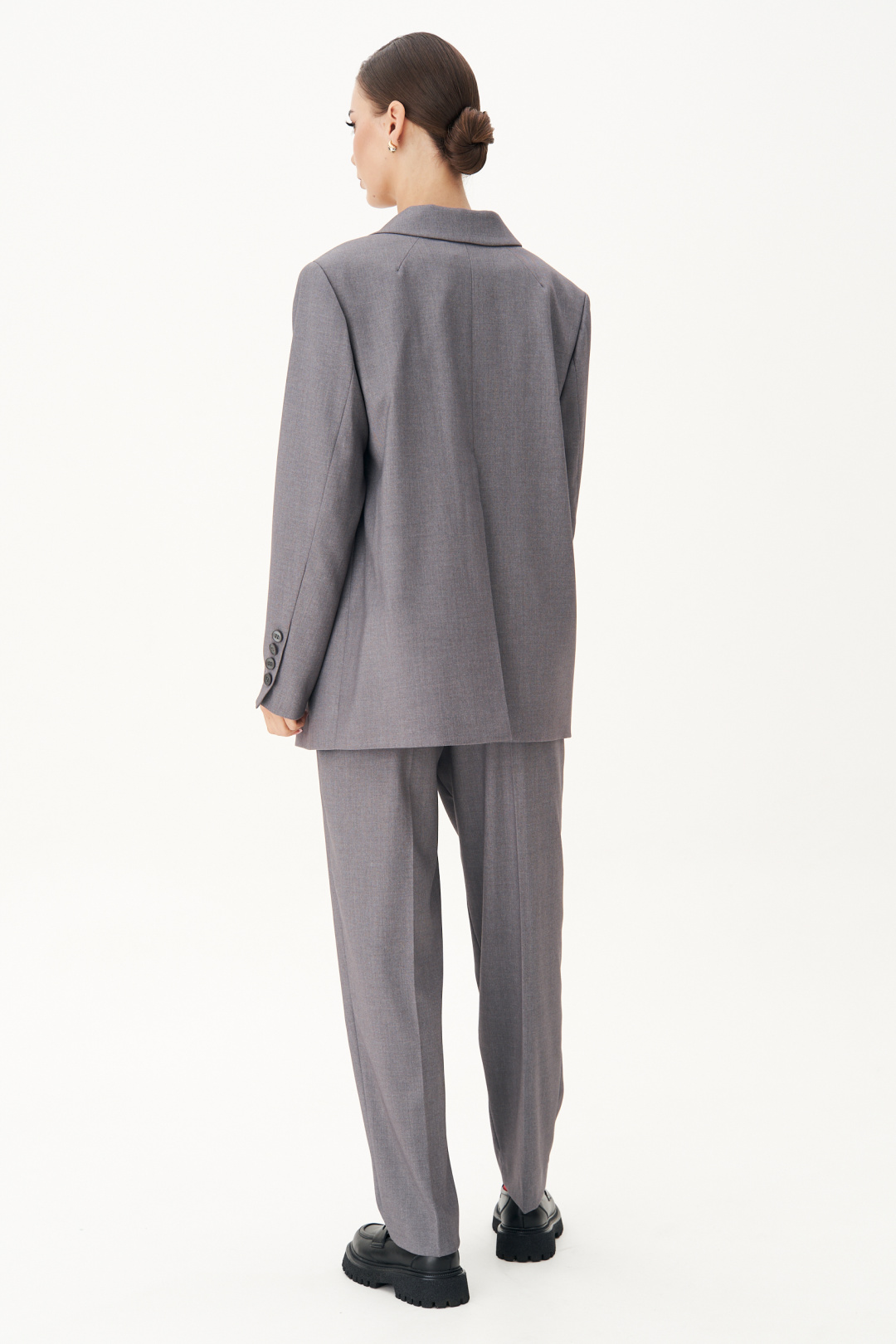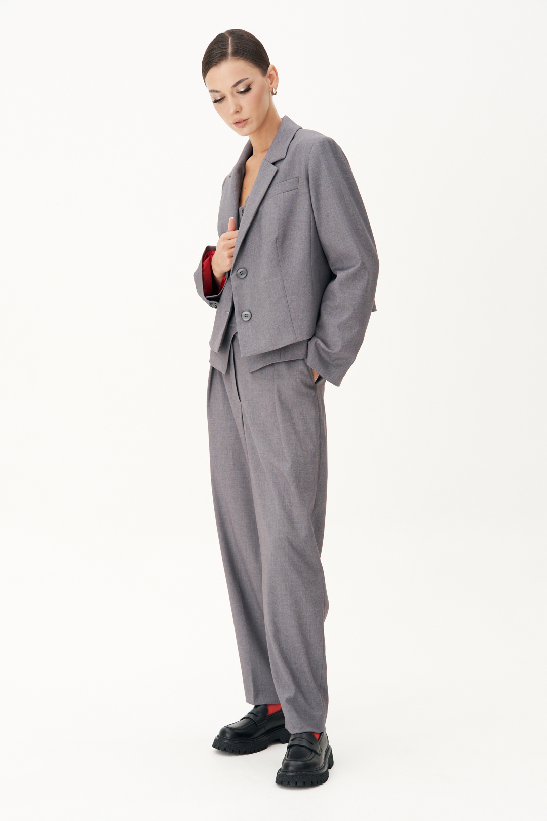 Брюки классического покроя с высокой посадкой на притачном поясе со шлёвками, зауженные. Застежка брючная на потайной крючок и молнию. Передние половинки брюк с мягкими складками защипами и наклонными боковыми карманами. Задние половинки брюк с вытачками и прорезными карманами с листочками.