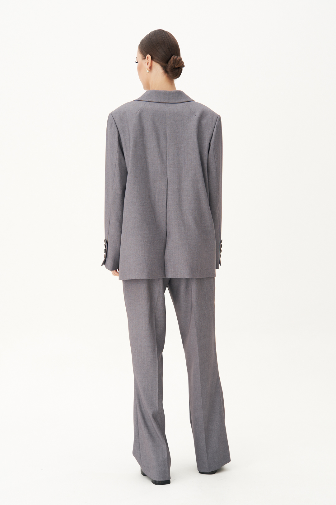 Брюки-клёш с высокой посадкой, на притачном поясе со шлёвками. Застежка брючная на потайной крючок и молнию. Передние половинки брюк с наклонными боковыми карманами. Задние половинки брюк с вытачкой и прорезными карманами с листочками.
