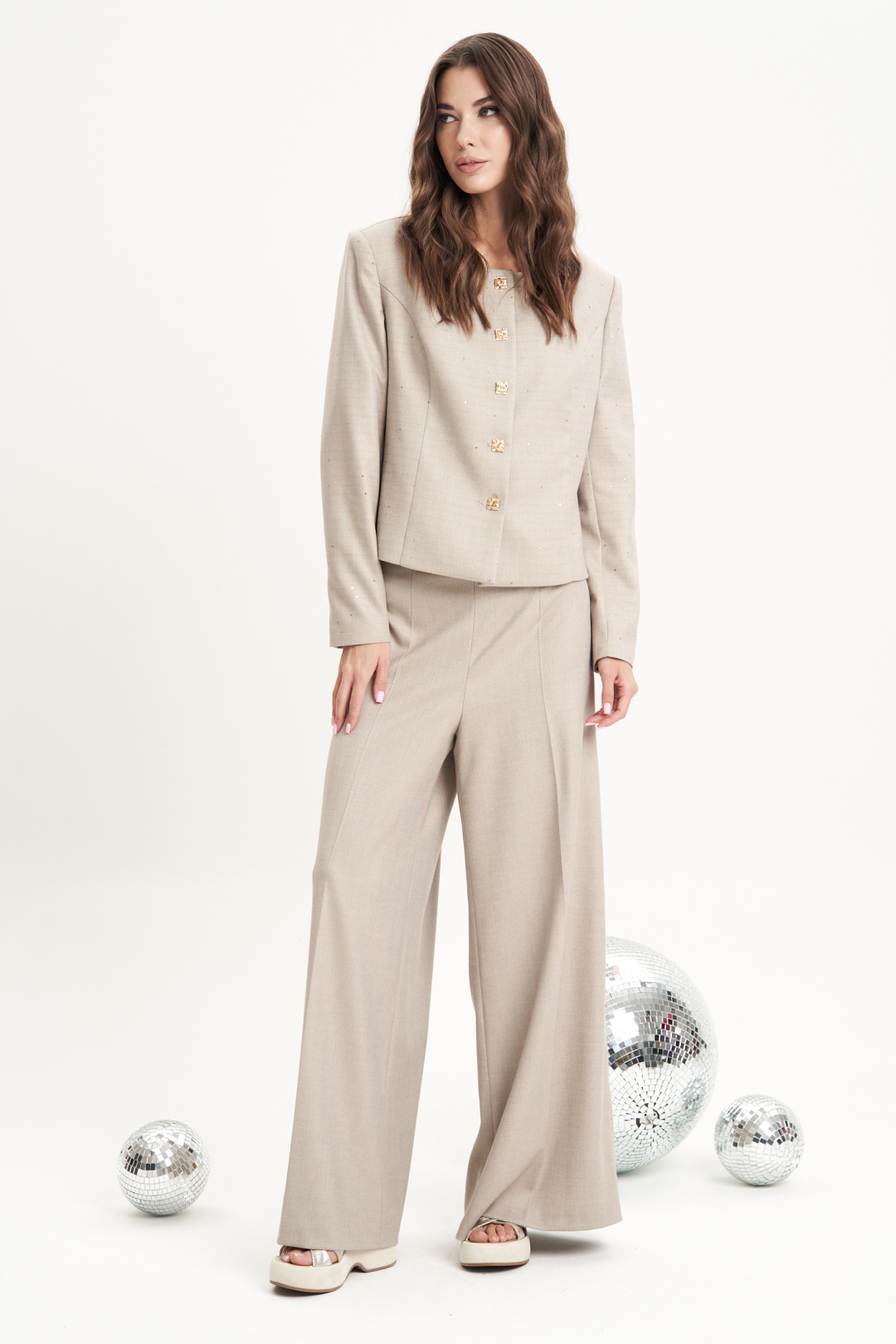 Жакет из необычного по текстуре материала с вкраплением пайетки, брюки из полотна без пайетки. Полуприлегающий силуэт пиджака с центральной застёжкой, круглым вырезом горловины и втачным покроем. Полочка с фигурным рельефом, спинка с фигурным рельефом, центральным швом и плечевыми вытачками. Рукав двухшовный.