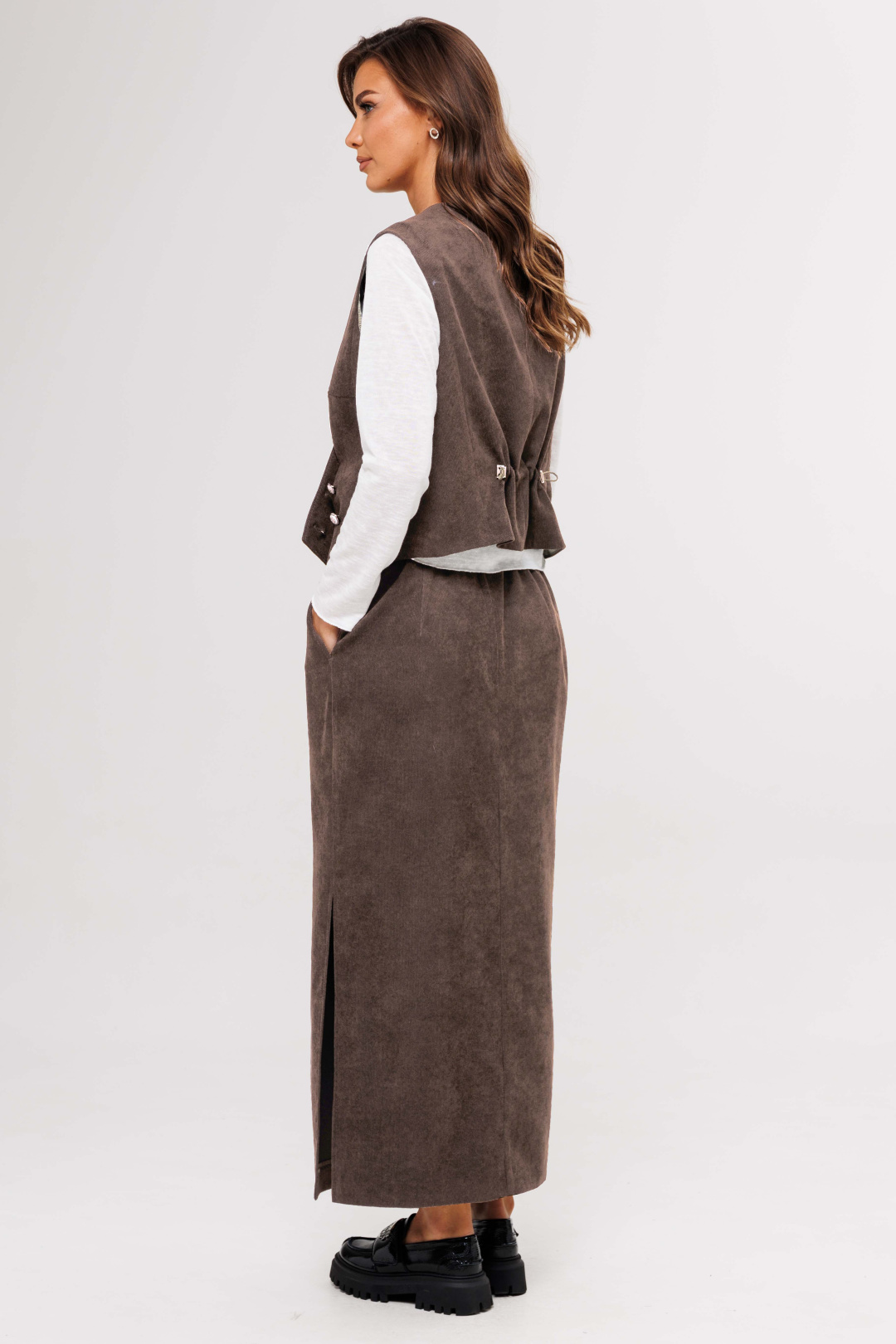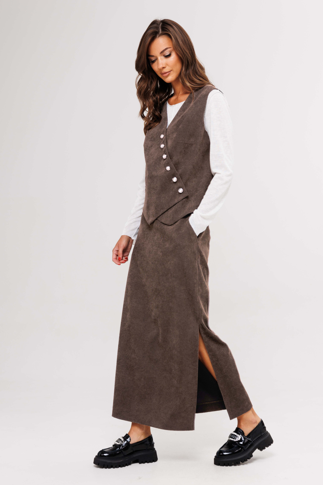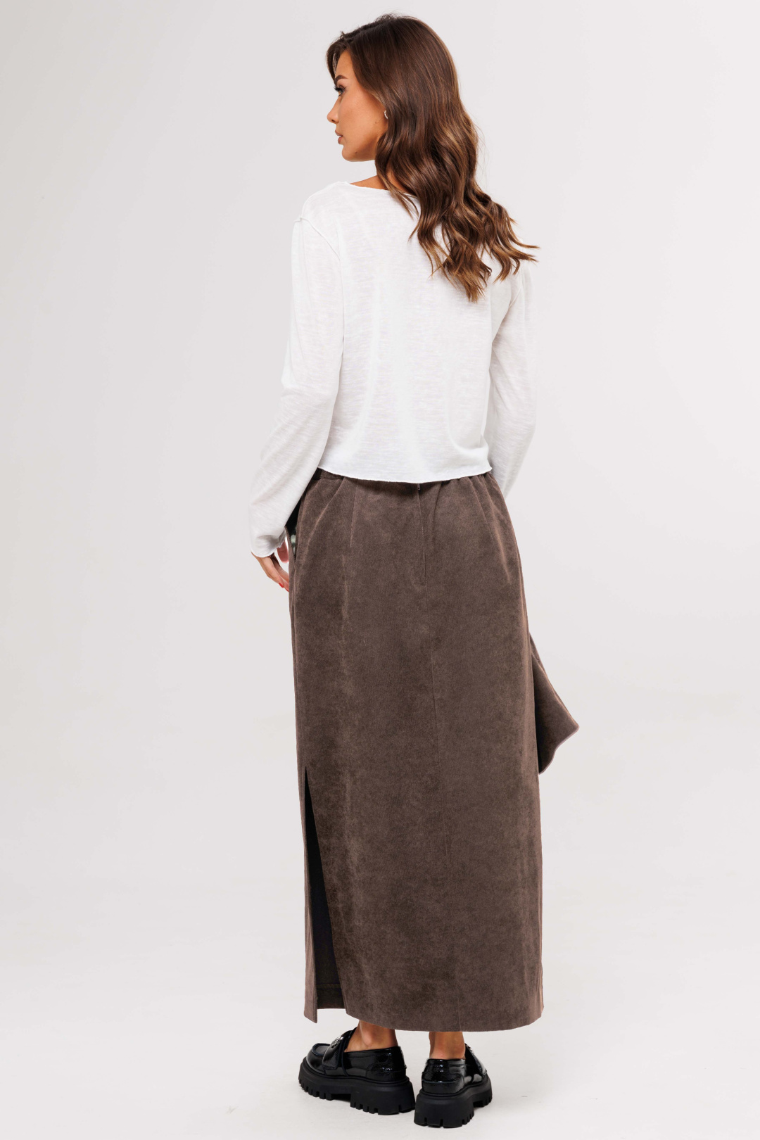 Юбка прямая с застёжкой и боковыми карманами по переднему полотнищу, и разрезом сбоку, из текстильного трикотажного полотна эффекта "вельвет". Пояс эластичный в области спинки.