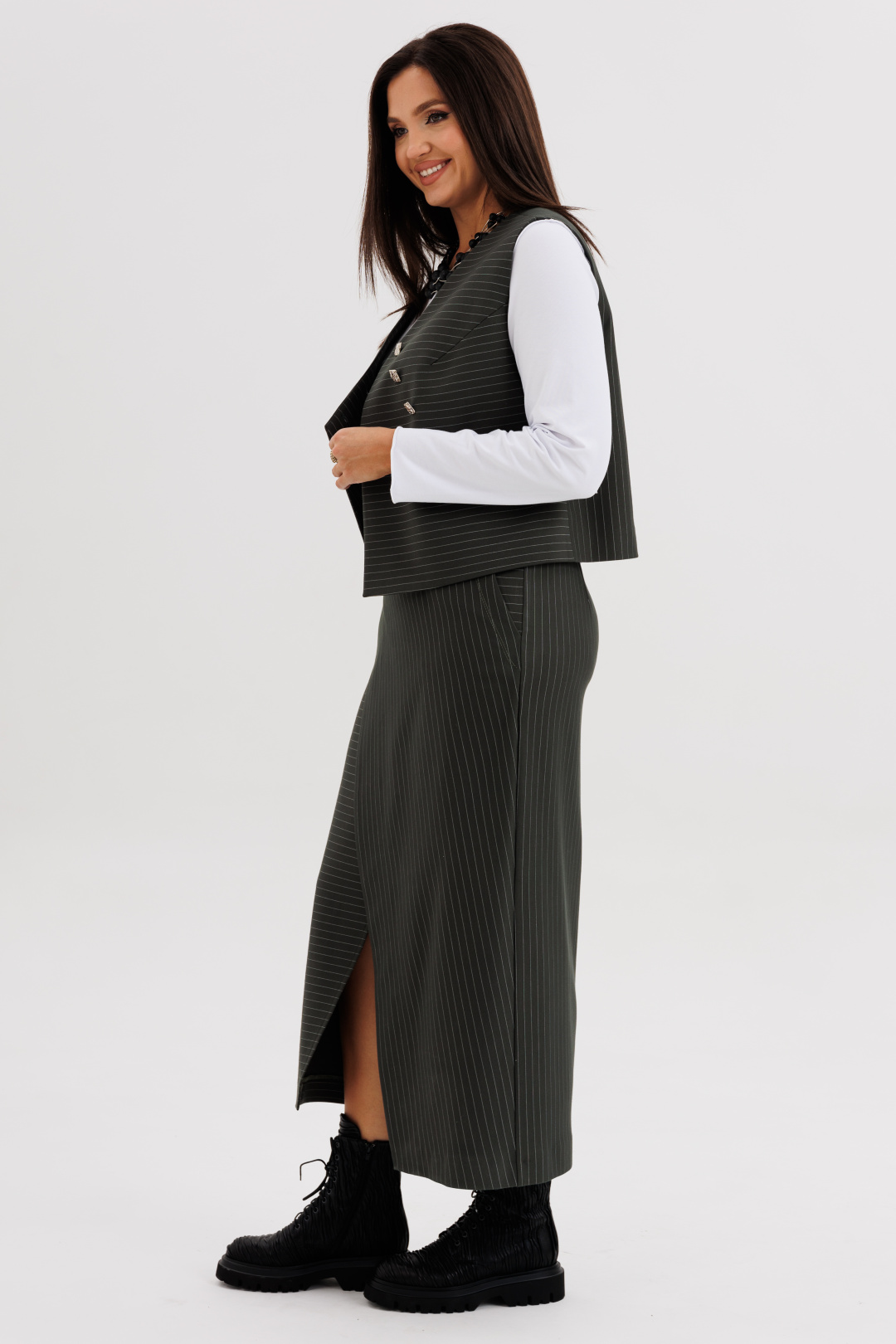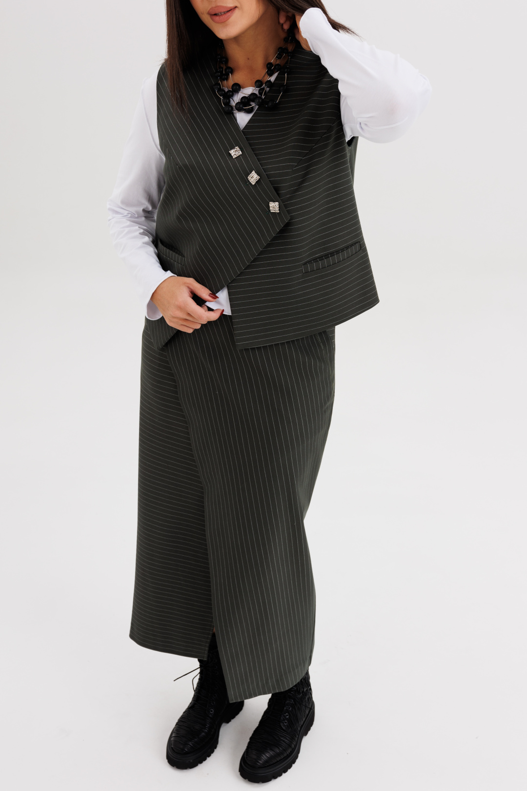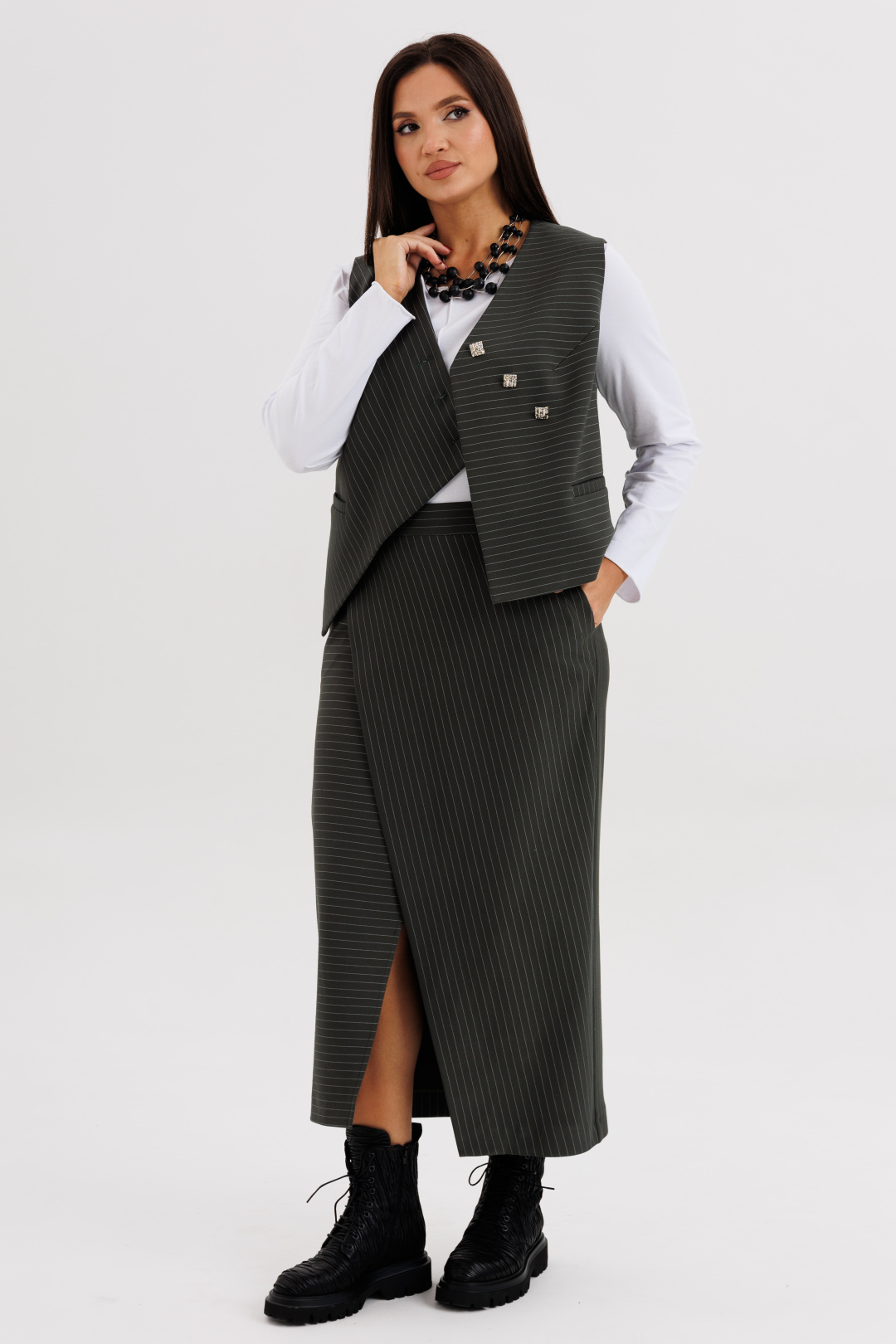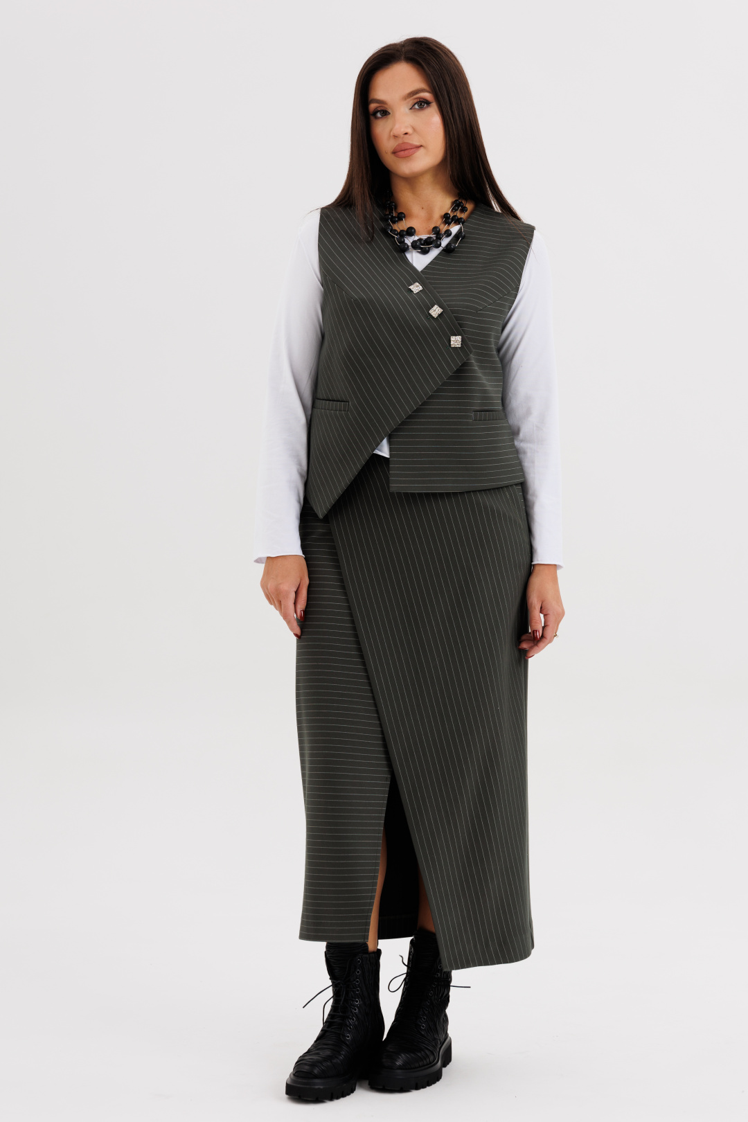 Стильный женский костюм в полоску — идеальное сочетание элегантности и современного минимализма. Комплект состоит из жилета оригинального кроя с асимметричной застёжкой, прямой юбки миди с мягким запахом и джемпера с длинным рукавом. Модель выполнена из плотной трикотажной ткани с тонкой вертикальной полоской, которая визуально вытягивает силуэт и подчёркивает стройность. Жилет без рукавов застёгивается на декоративные пуговицы, создавая выразительный акцент в образе. Юбка миди с запахом добавляет женственности и комфорта при движении. Джемпер трикотажный, с длинным рукавом, полуприлегающего силуэта.