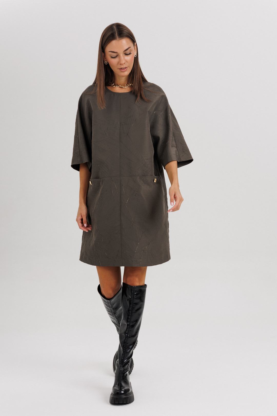 Платье имеет декоративные металлические элементы у линии карманов, что придает образу современный акцент. Универсальная длина до колена позволяет сочетать модель как с высокими сапогами, так и с ботильонами или обувью на плоской подошве.
