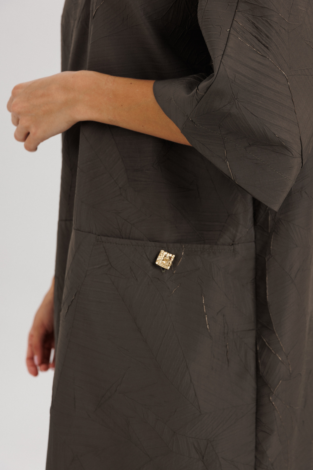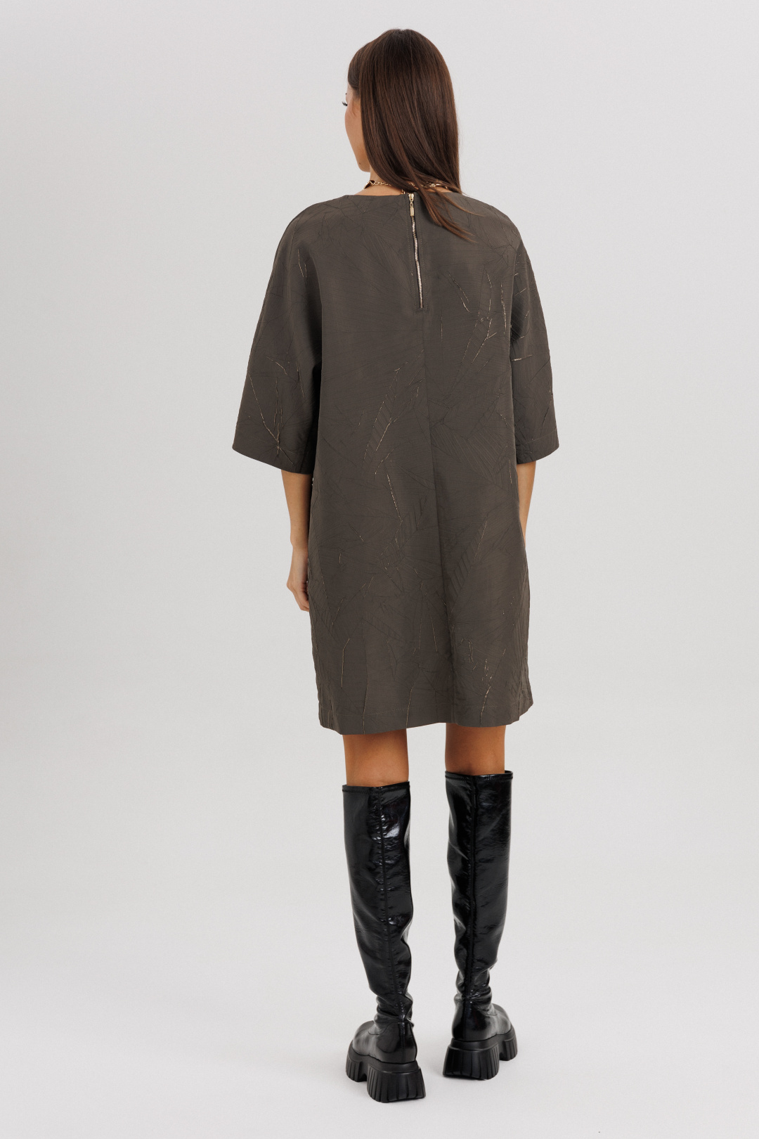Цельнокроенный покрой и свободная посадка создают лаконичный и элегантный образ, подходящий для любого типа фигуры. Рукава длиной до локтя добавляют лёгкости и делают силуэт визуально утончённым. Округлый вырез горловины подчеркивает женственность и универсальность модели.