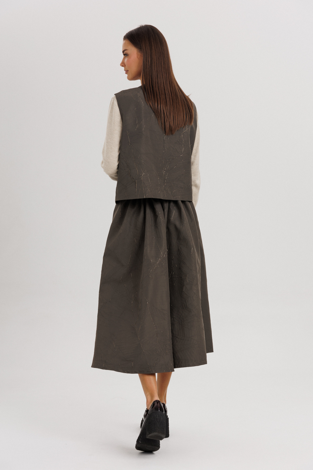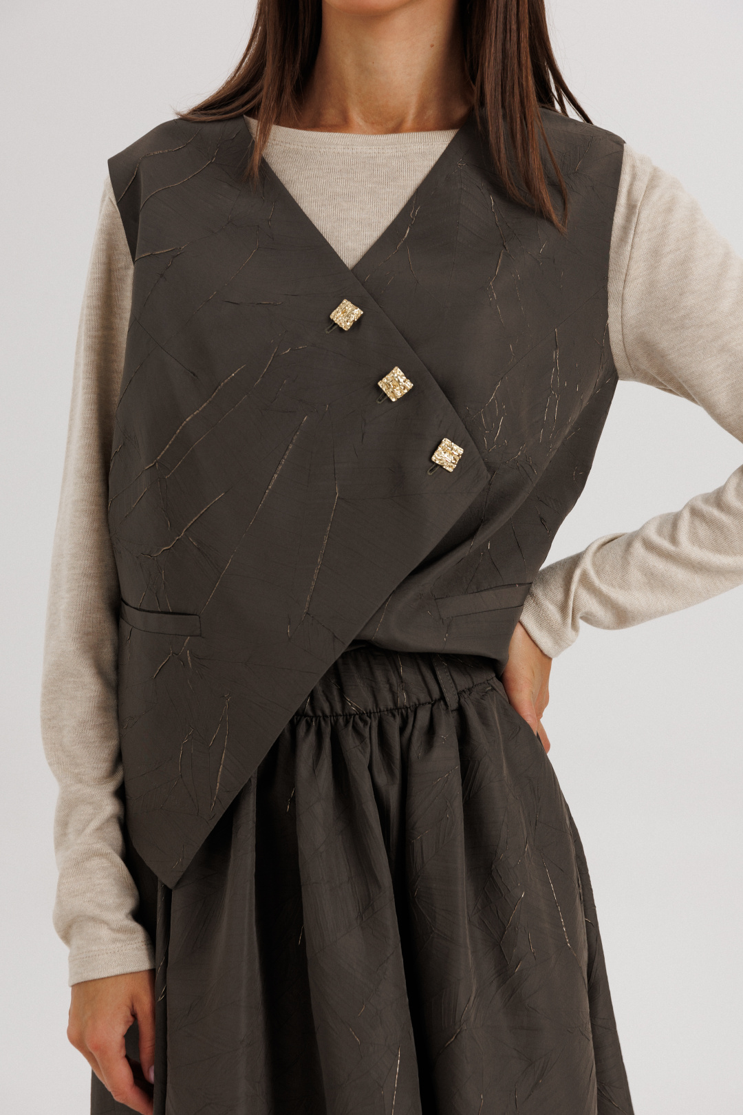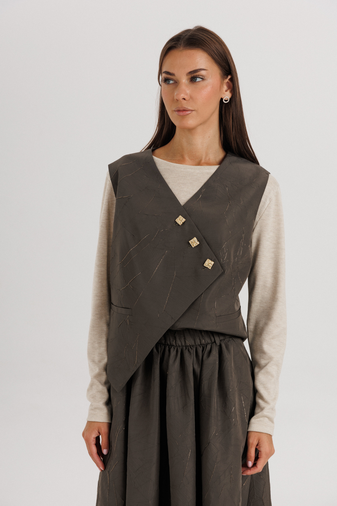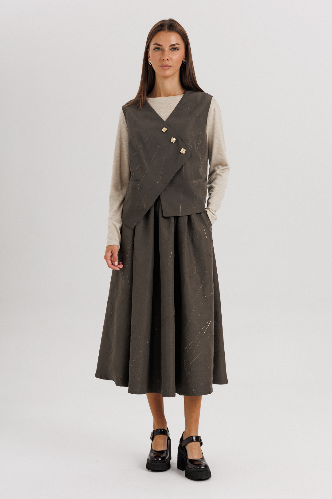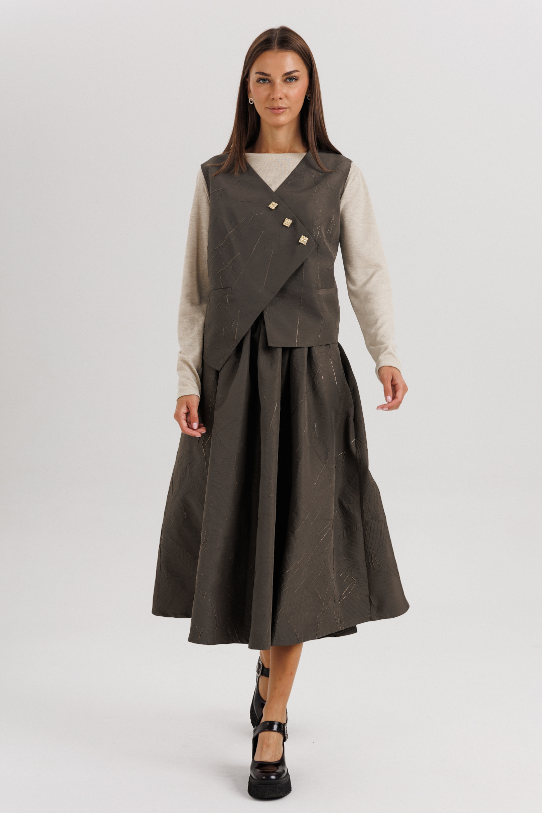 Жилет выполнен из плотной фактурной ткани с декоративной асимметричной застёжкой на пуговицы — этот элемент придаёт образу динамичность и оригинальность. Юбка длиной миди с мягкими складками красиво драпируется и подчеркивает женственность силуэта. Лонгслив из мягкого трикотажа обеспечивает комфорт и добавляет легкости всему ансамблю.