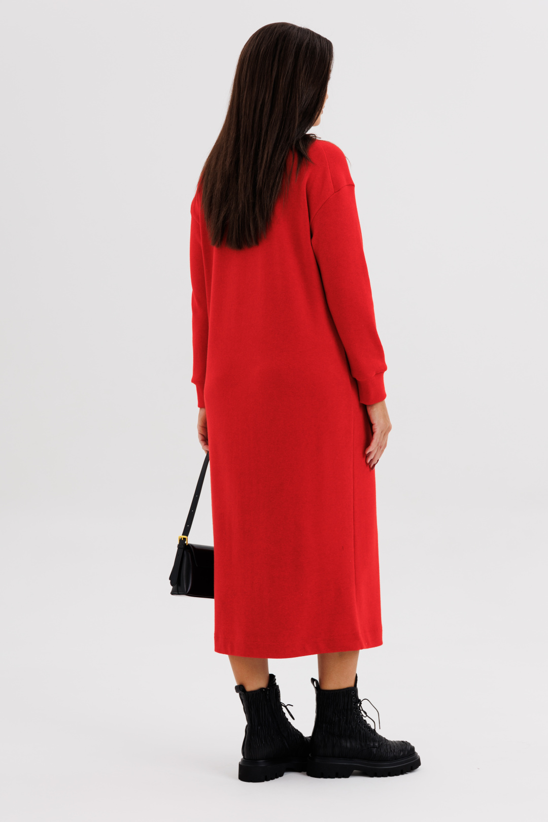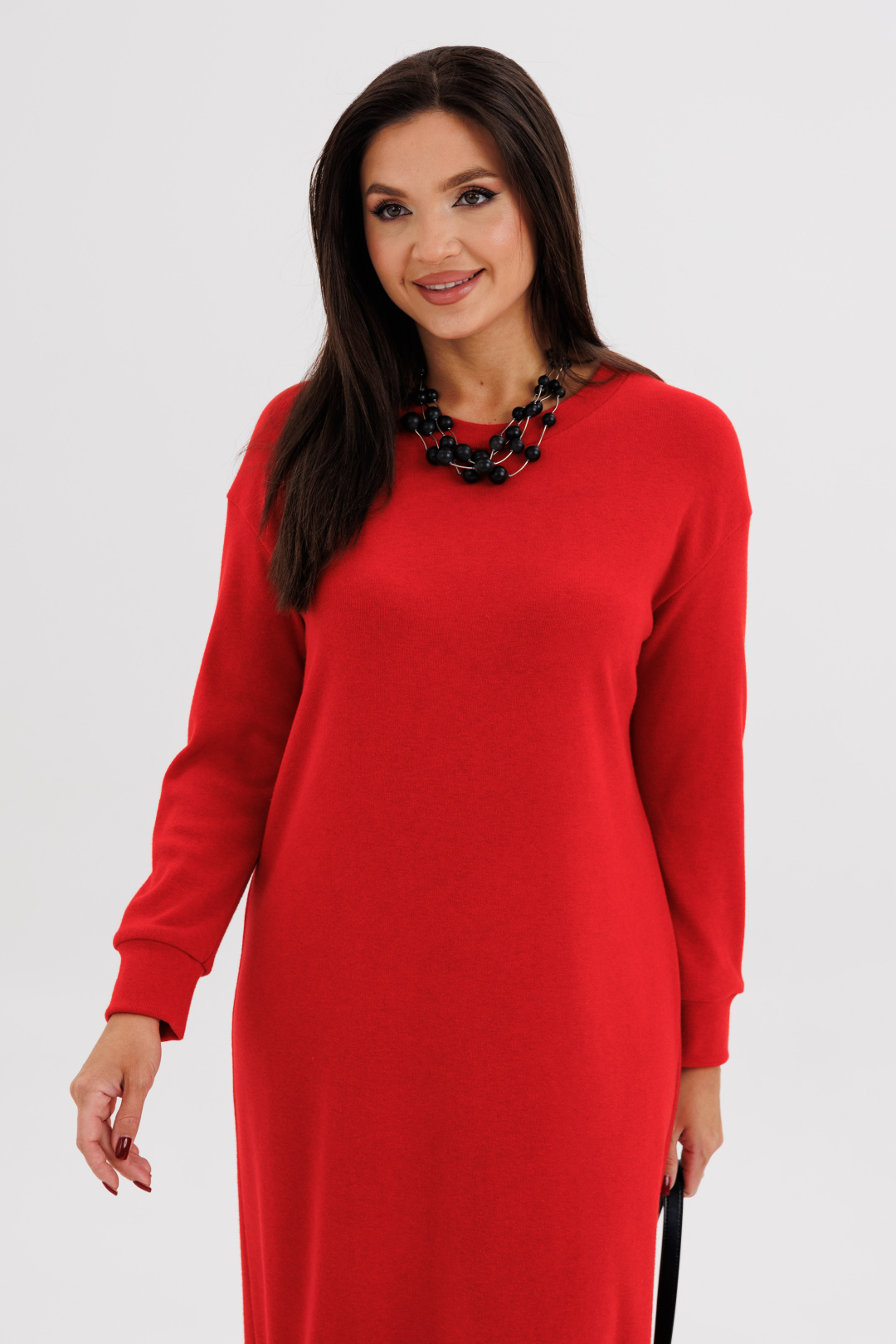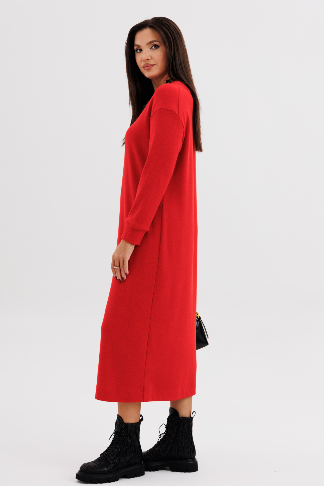Мягкая фактура ткани приятна к телу и подходит для любого сезона. Насыщенный красный цвет подчёркивает женственность и уверенность, а минималистичный стиль позволяет комбинировать платье с различными аксессуарами и обувью — от классических туфель до ботильонов.