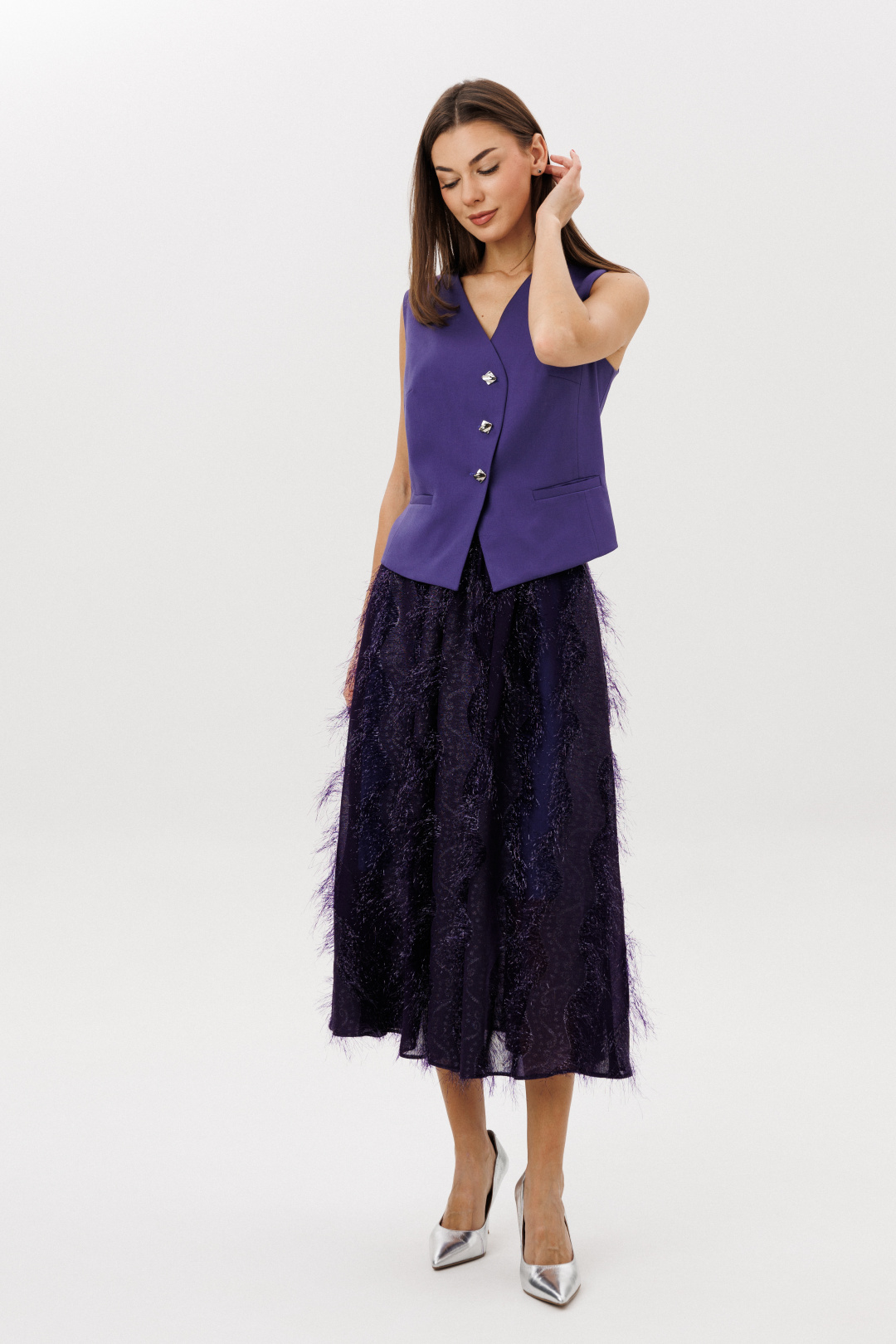 Актуальный комплект, в котором строгая геометрия жилета гармонично сочетается с романтичной женственностью многослойной юбки. Лёгкий шифон с фактурным переливом делает образ выразительным и праздничным, а продуманная посадка юбки обеспечивает красивую линию талии и динамику силуэта.