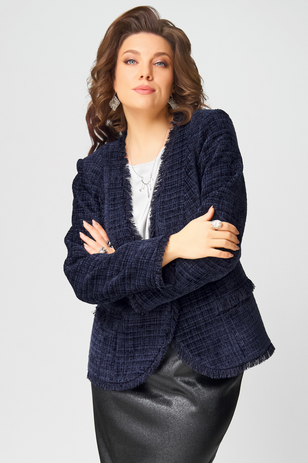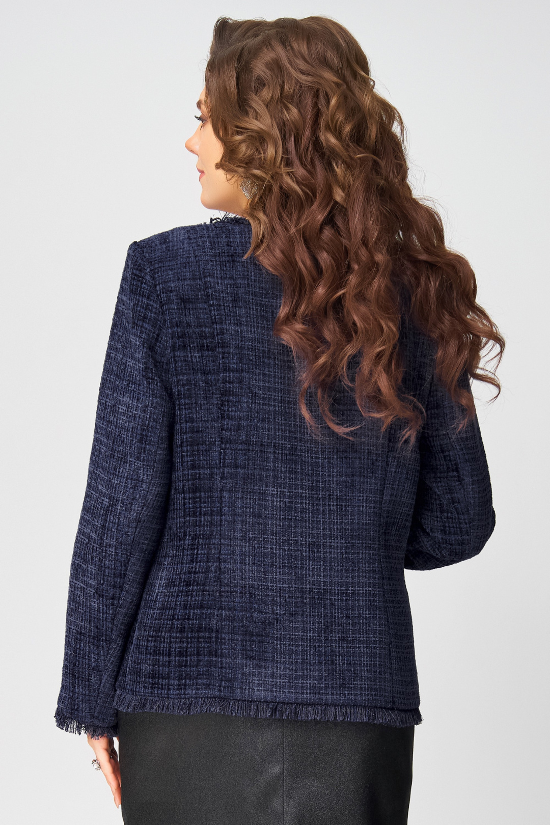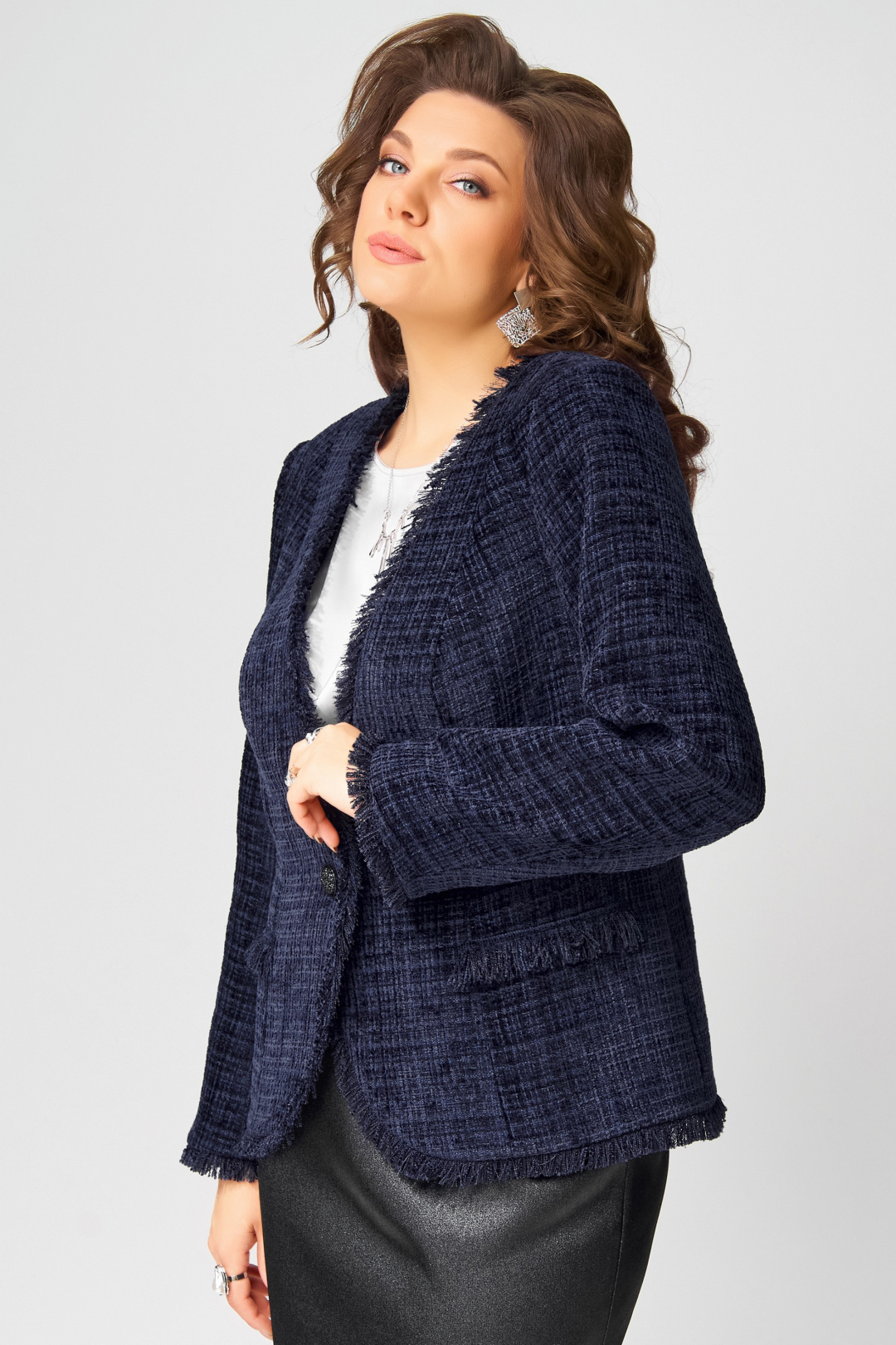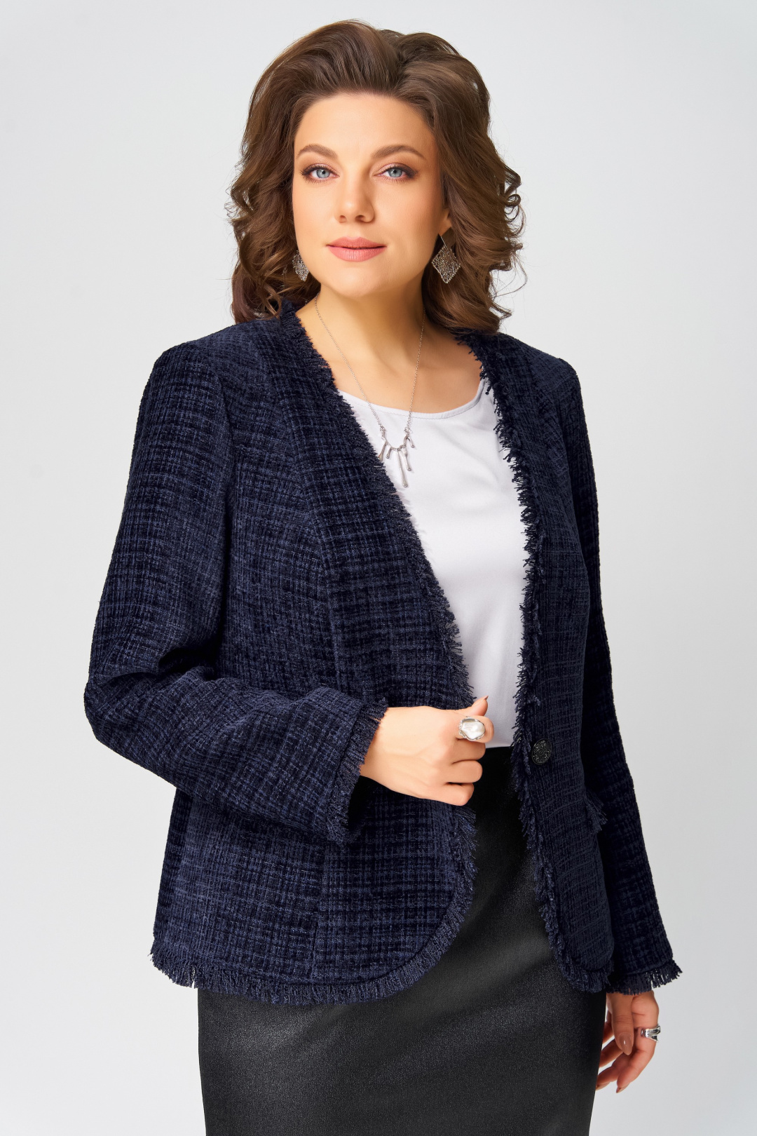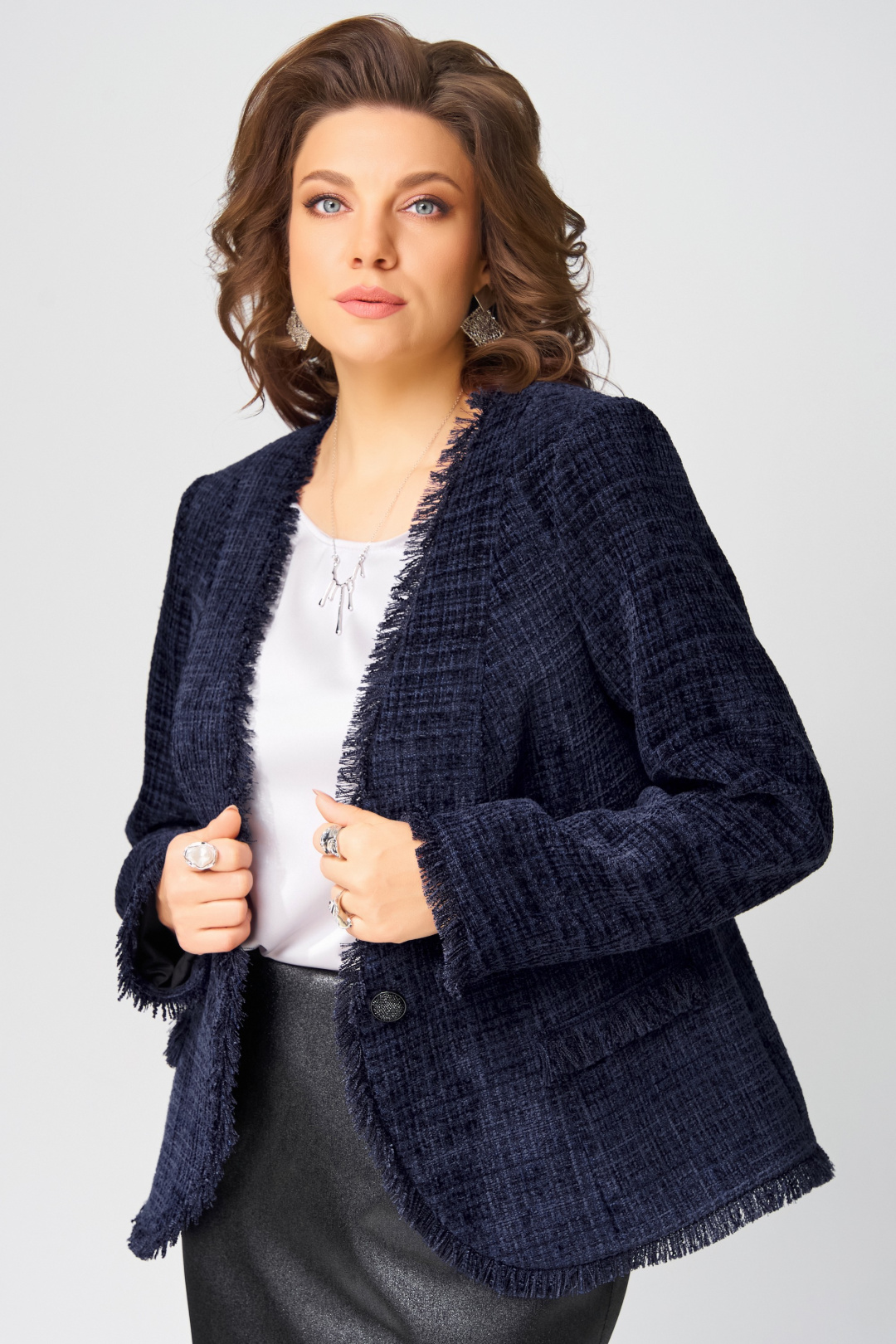 Однобортная застёжка на пуговицу, рельефные линии по полочке и спинке подчёркивают фигуру. Декоративная трепка по краю борта, низу изделия и рукавам добавляет фактурности и оригинальности.
