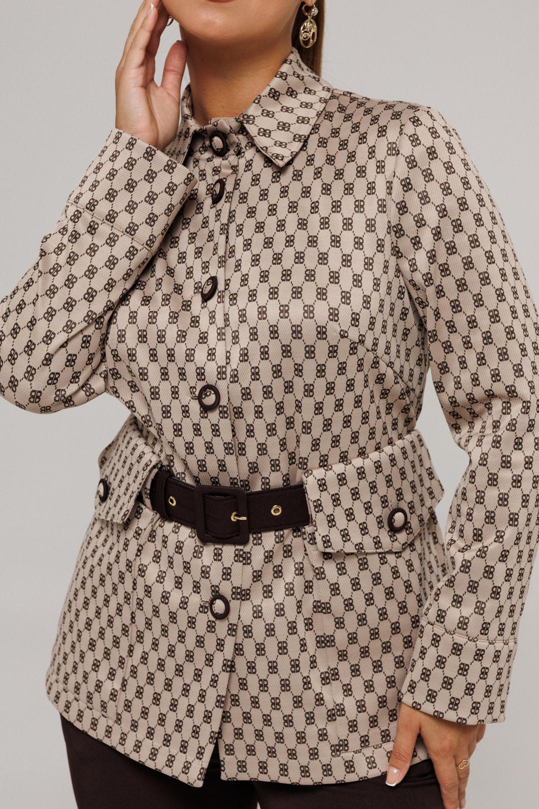 Жакет прямого силуэта, длиной немного ниже линии бедер, рукав длинный, втачной, с широкой бейкой по низу, в которой рисунок ткани расположен по косой. Застежка жакета-до верха, на петли и пуговицы. Воротник со стойкой, отложной. По переду расположены накладные карманы с клапанами. Под клапанами дополнительно имеется частичная кулиска, в которую протягивается ремень, изготовленный из ткани что и боюки. Отделочными строчками дополнены воротник, манжеты, клапаны и карманы жакета.