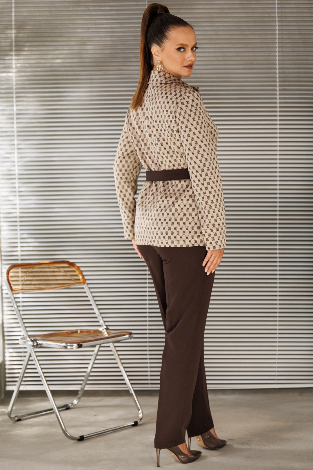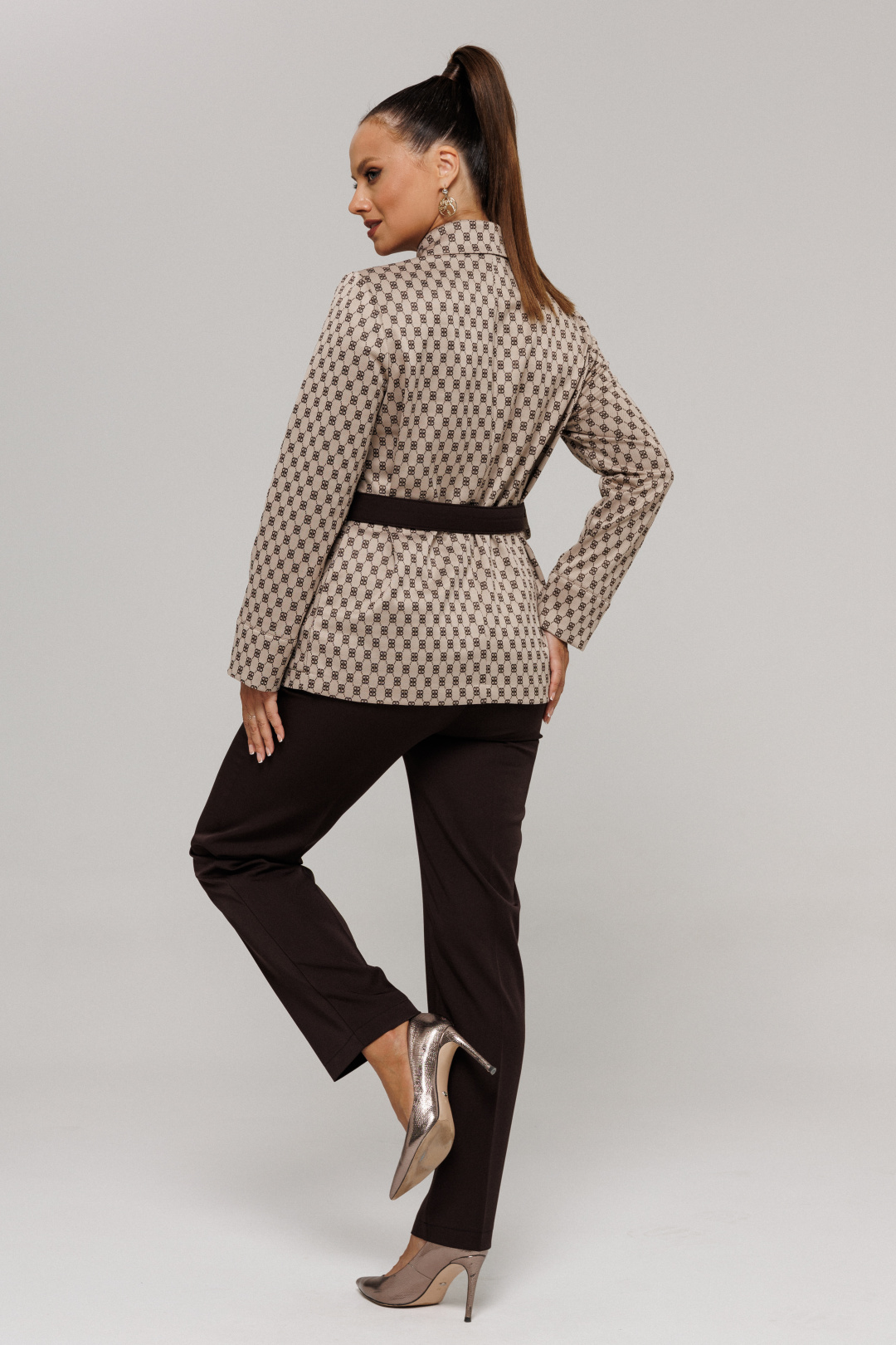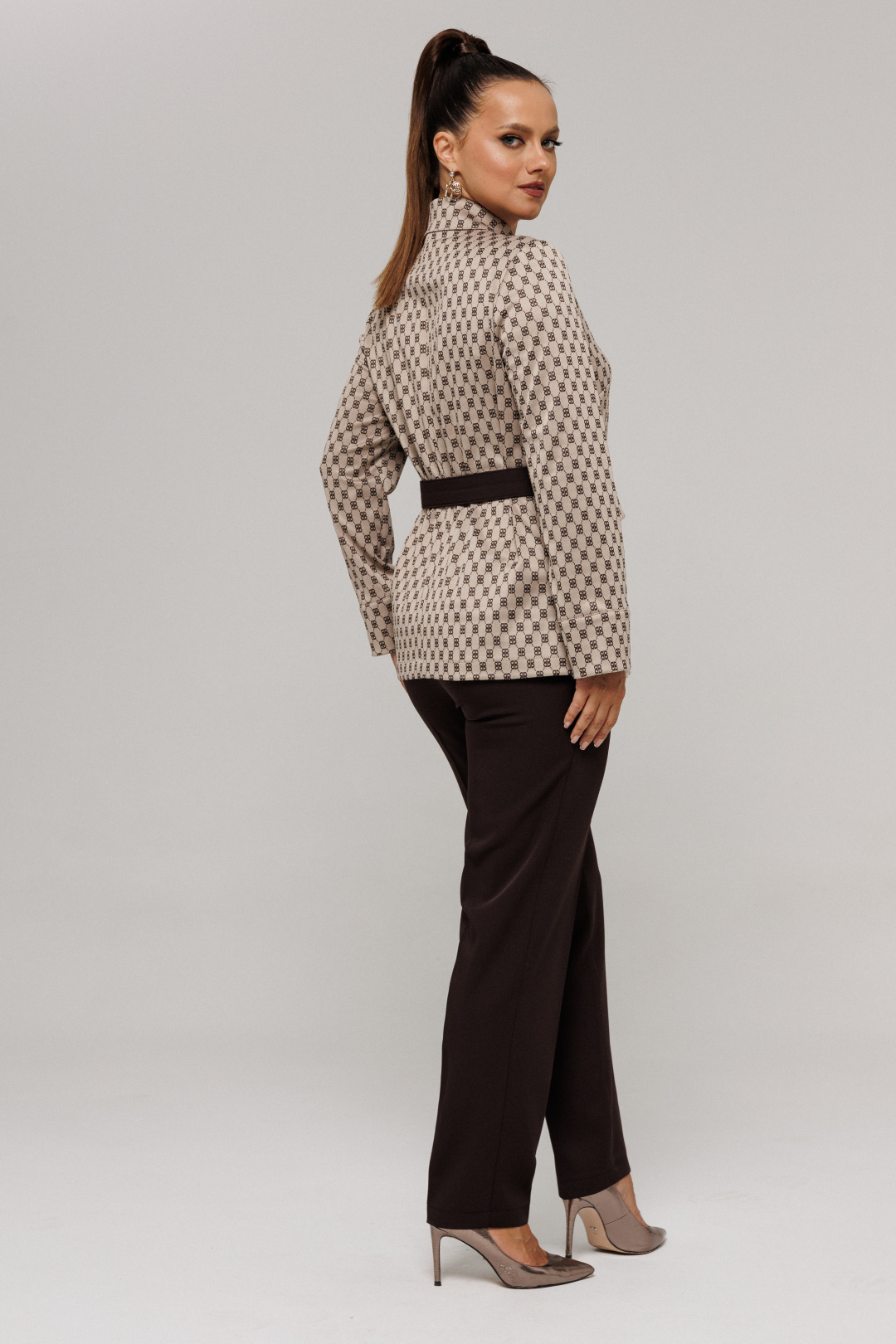 Комплект женский, состоящий из жакета и брюк. Комплект выполнен из двух видов текстильной ткани костюмно-плательной группы. Жакет с рисунком, выполненым текстильным переплетением. Брюки однотонные.