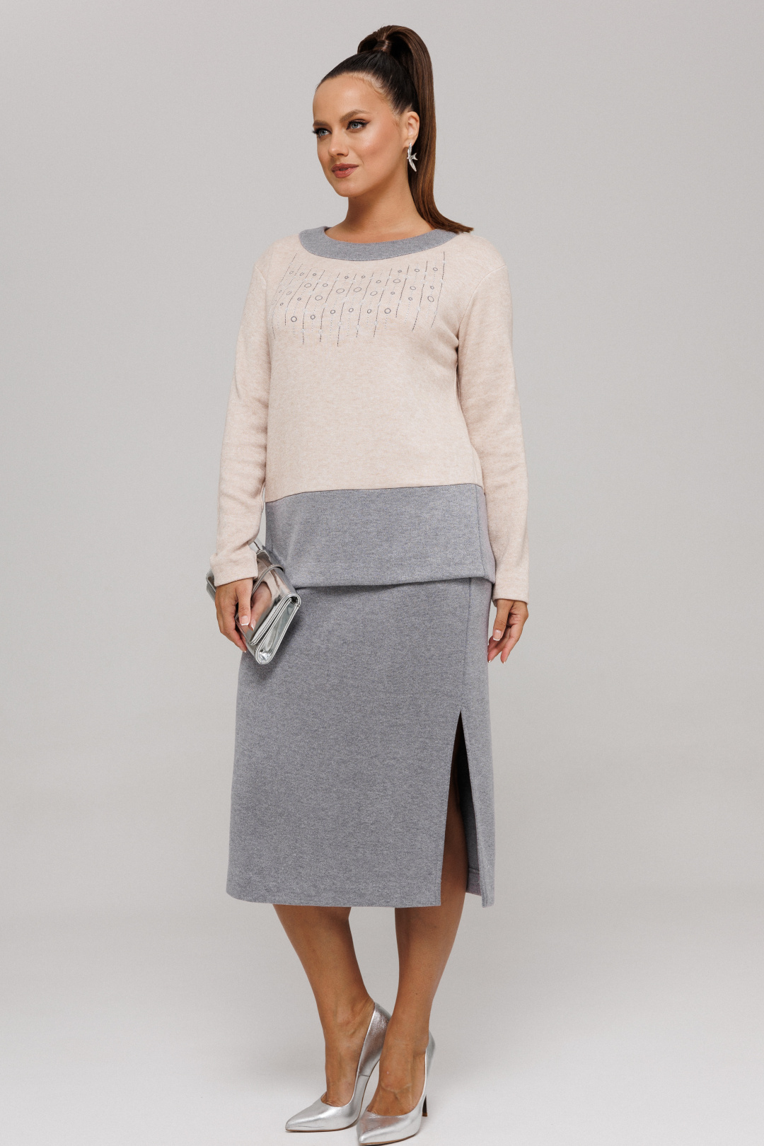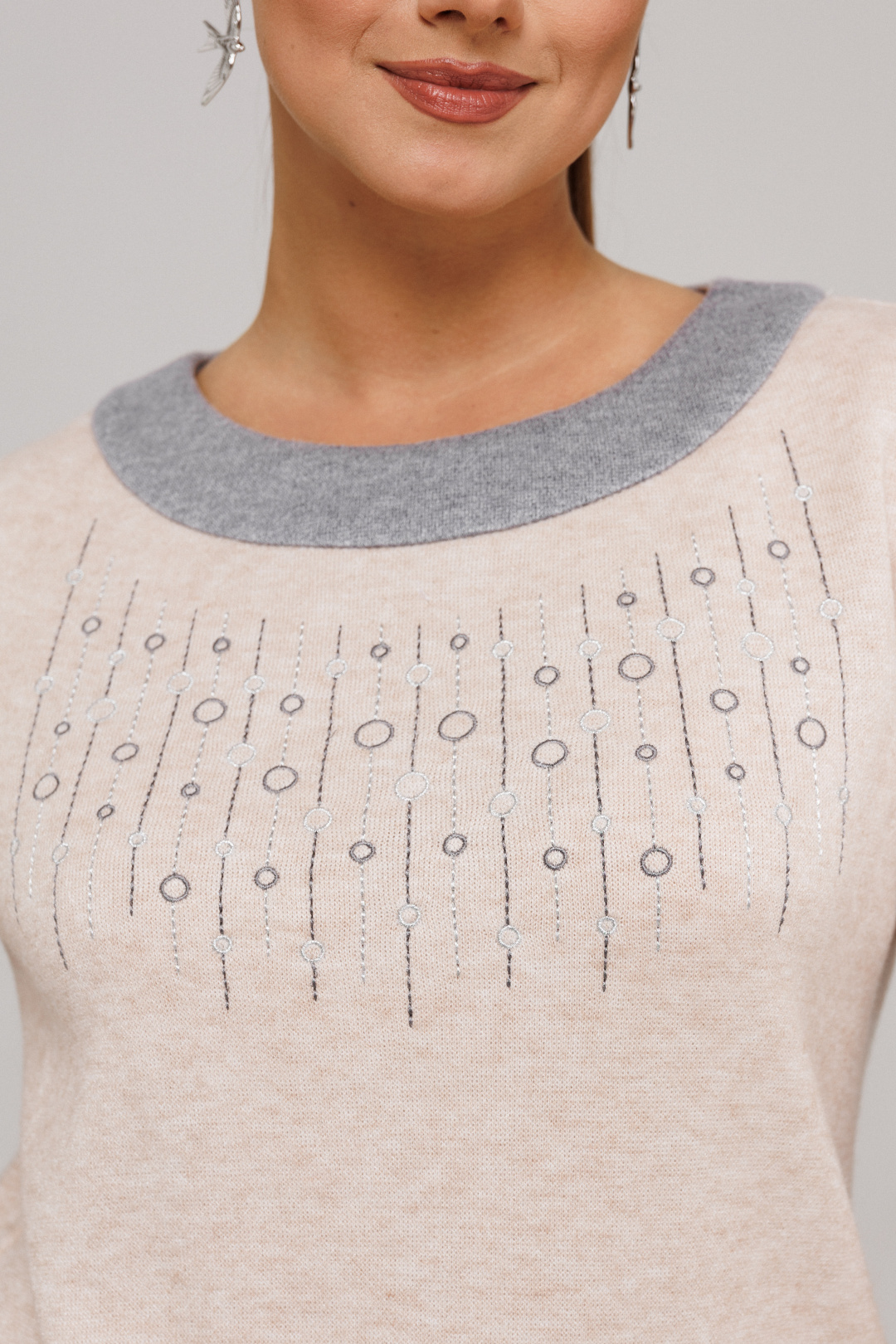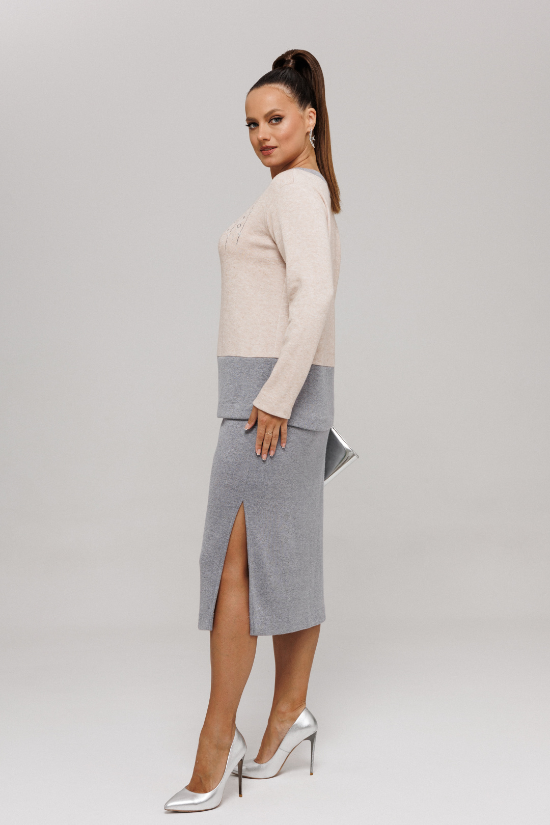 Джемпер данного комплекта прямого силуэта со спущенными рукавом, с планкой по горловине и подрезом ниже линия талии, выполненным из отделочной ткани. Декором данного джемпера служит дизайнерская вышивка