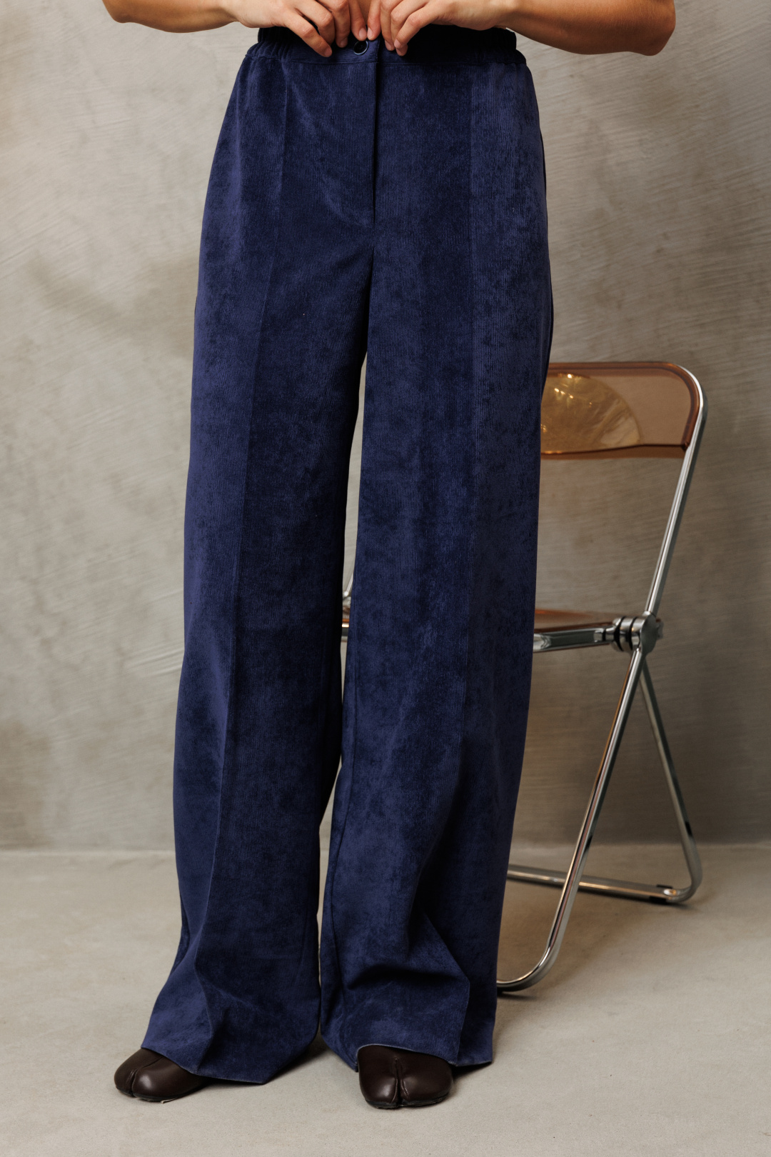 Брюки палаццо с притачным поясом из мягкой вельветовой ткани. Спереди застежка гульфик на молнии и петлей и пуговицей по поясу. По задней частям брюк вытачки. Пояс с резинкой в боковых частях. Брюки с заутюженными стрелками. Длина брюк с учетом пояса - 109 см.