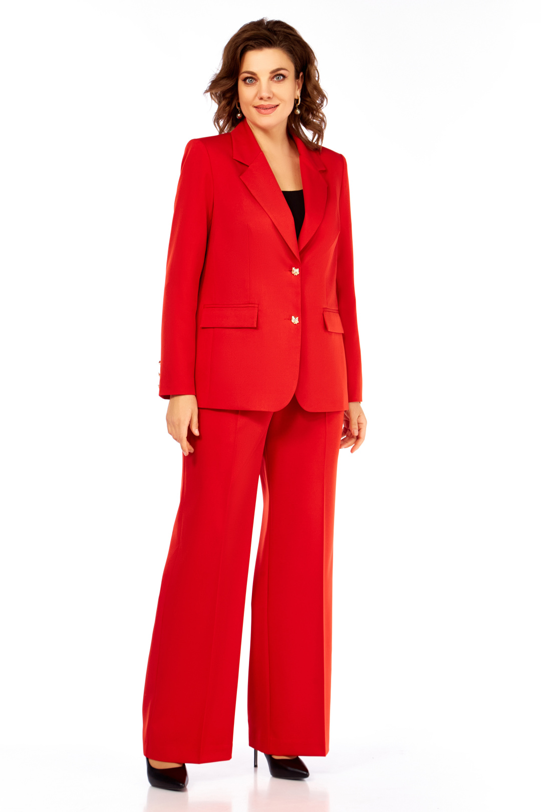 Шикарный костюм, состоит из жакета и брюк. Жакет на подкладке, приталенного силуэта с центральной бортовой застежкой на петли и пуговицы, с отрезным бочком . По переду прорезные карманы с клапаном, спинка со средним швом и вытачками. Рукав втачной двухшовный со шлицами-обманками на петли и пуговицы. Брюки прямые на притачном поясе и боковыми карманами, застежка брюк на тесьму молнию и пуговицу.