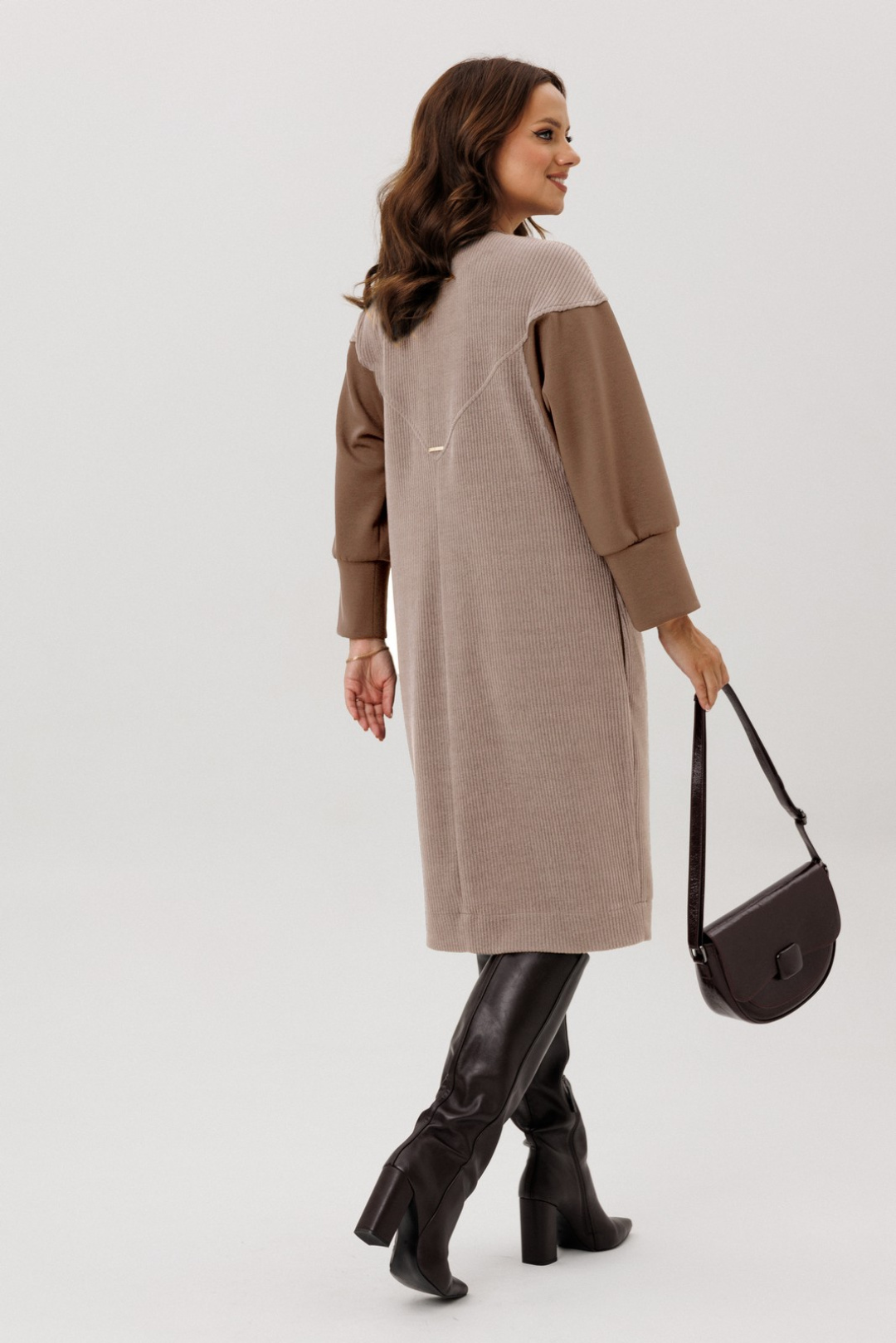 Платье полуприлегающего силуэта, вырез горловины V – образный, рукав цельнокроеный спущенный со вставками из кожи и на манжете внизу. По спинке кокетка, в боковых швах функциональные карманы. Застежка на тесьму-молнию. В комплекте ремень из экокожи.