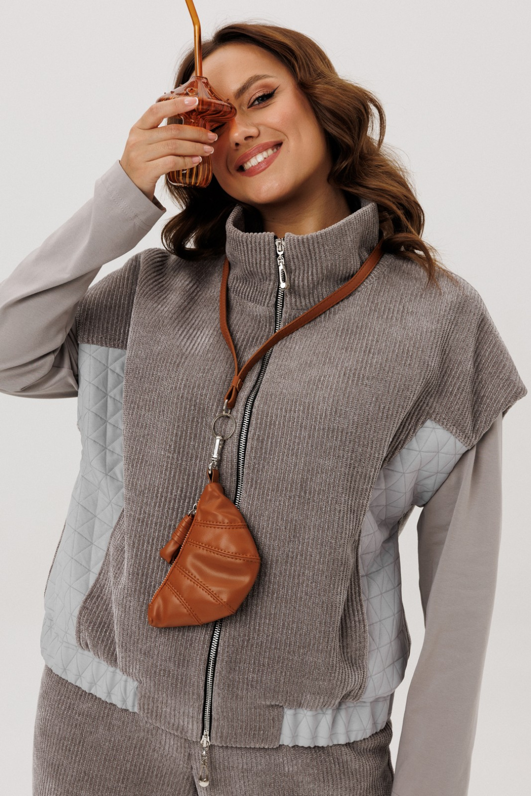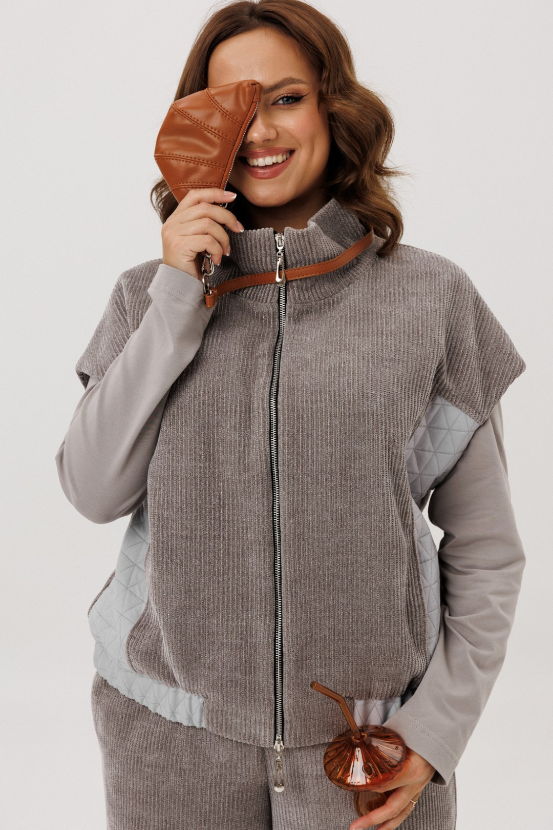 Жилет свободного силуэта, вырез горловины на стойке. Изделие без рукавов. По бокам бочки из отделочной ткани и карманы в шве. По низу изделие на резинке, застежка на тесьму-молнию по переду.