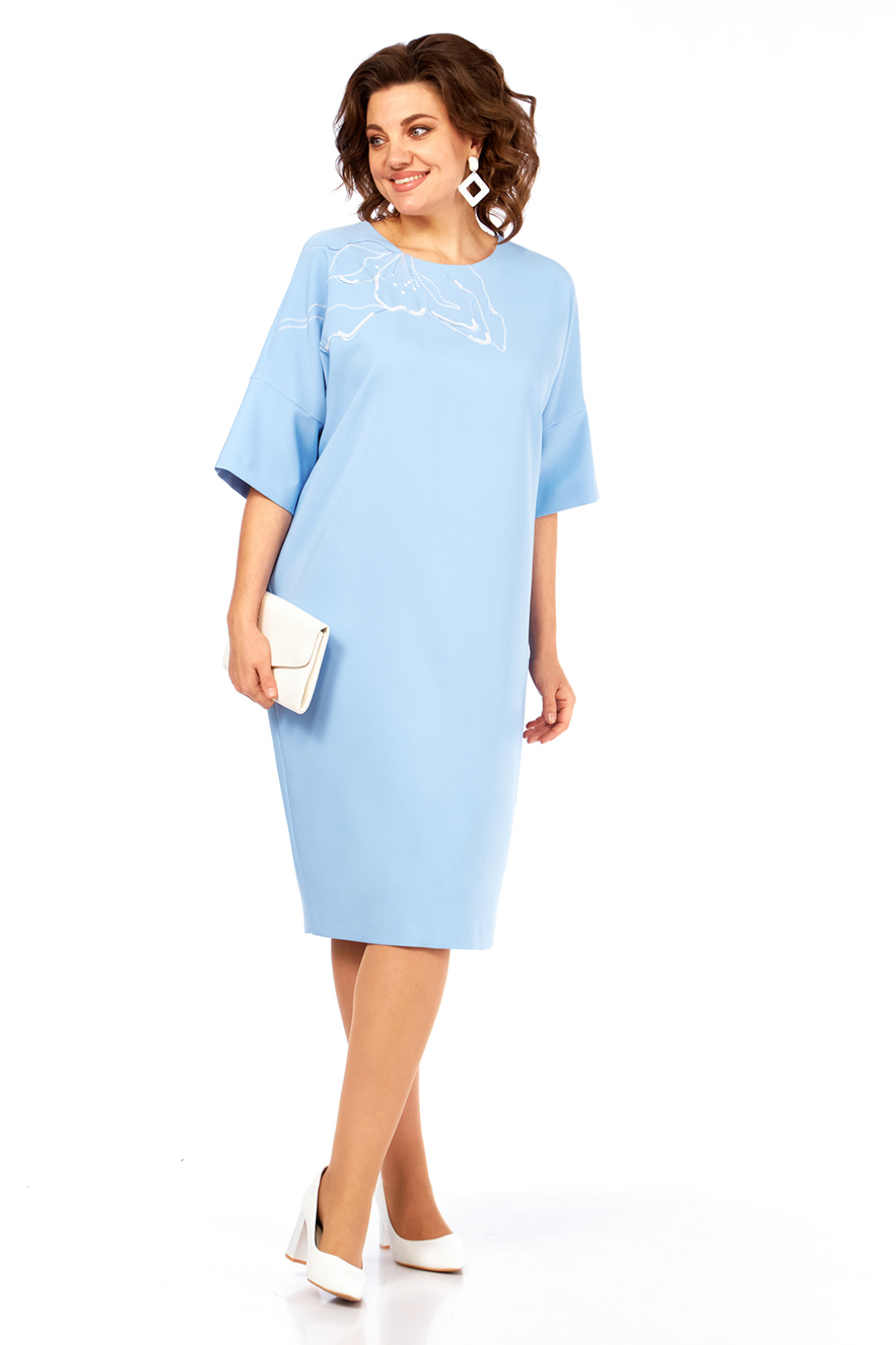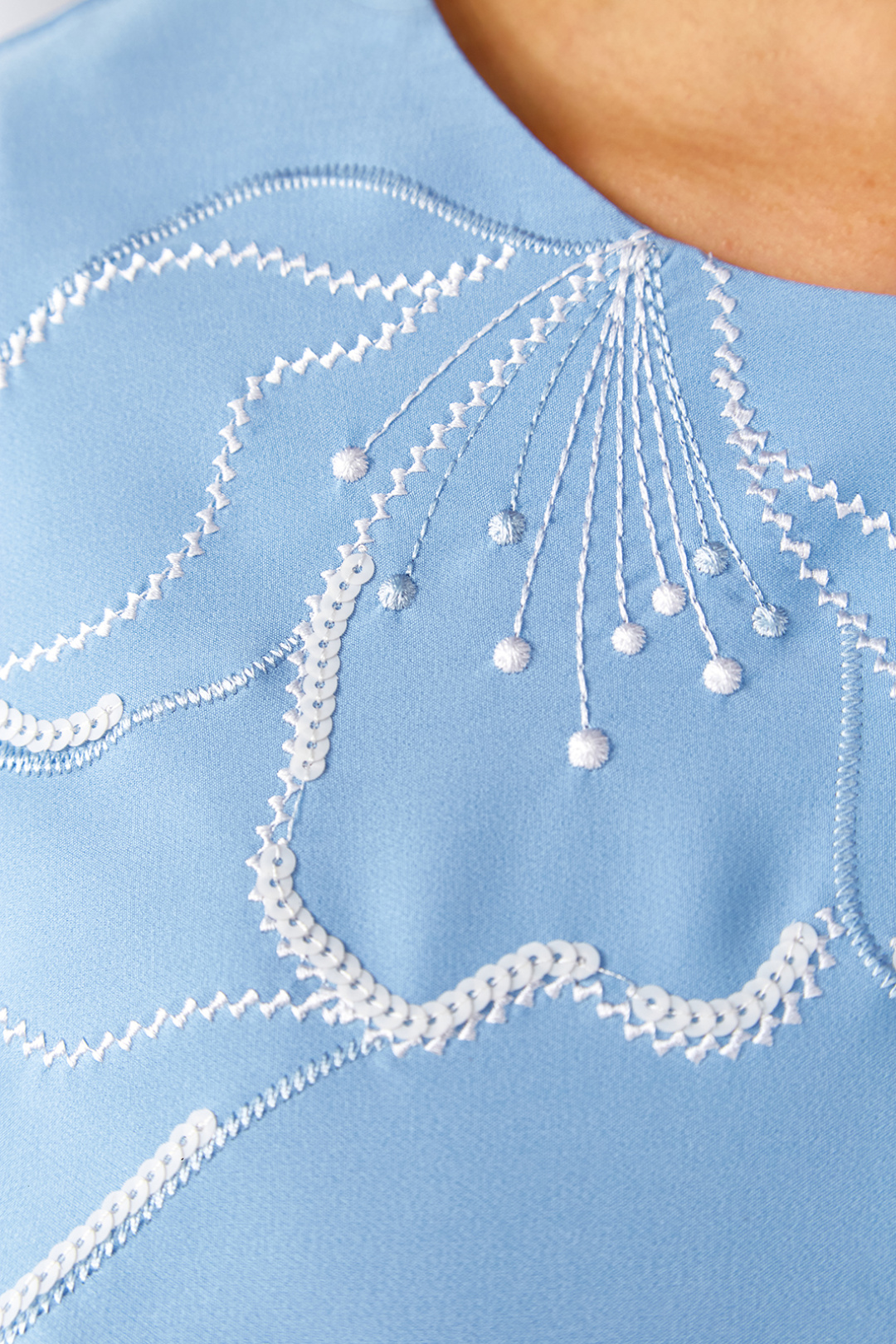 Платье женское, нарядное свободного силуэта. Выполнено из ткани костюмно-плательного ассортимента. Горловина округлой формы. Перед цельнокроеный дополнен дизайнерской вышивкой. Спинка со средним швом в котором обработана застежка на навесную петлю и пуговицу. Рукав спущенный.