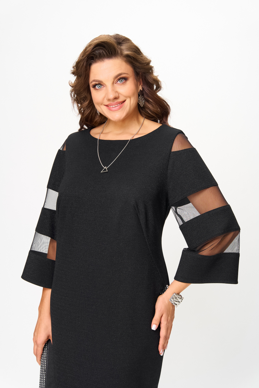 Элегантное нарядное платье черного цвета, идеально подходит для торжественных мероприятий. Платье выполнено из высококачественного трикотажного полотна с легким блеском, что добавляет изделию роскошный вид. Дизайн дополнен вставками из прозрачной сетки на рукавах, придающими образу изысканность и оригинальность. Силуэт платья прямой, обеспечивающий удобство и комфорт при носке. Рукава длинные, втачные, слегка расширены к низу, что добавляет изящества. Платье без застёжек и подкладки, спина оформлена средним швом с шлицей для удобства передвижения. Это платье станет идеальным выбором для создания элегантного вечернего образа.