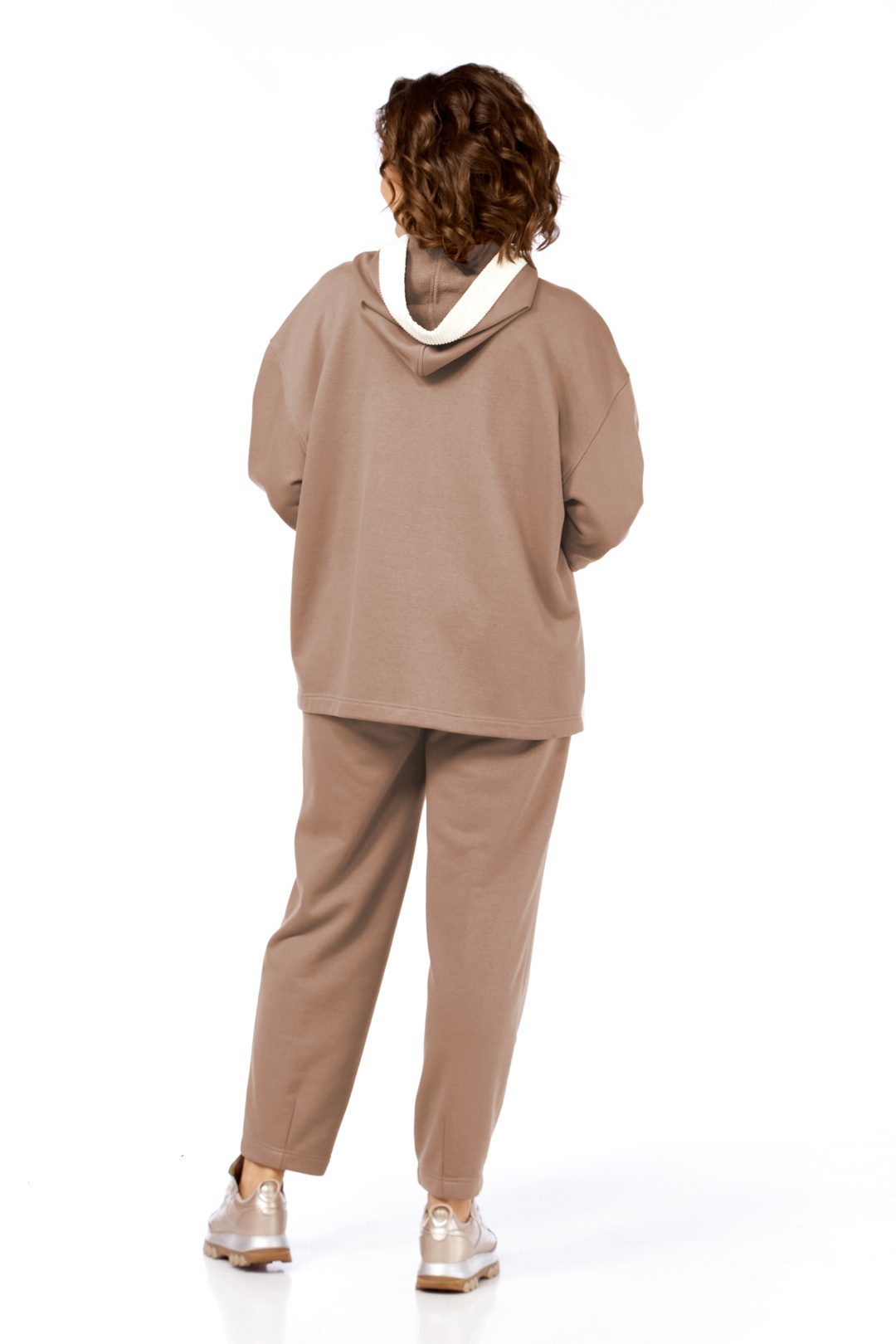 Брюки слегка зауженные к низу, силуэт " банан". пояс на резинке, карманы в боковых швах. Низ брюк с декоративной вытачкой. По задней половине брюк отрезная кокетка.