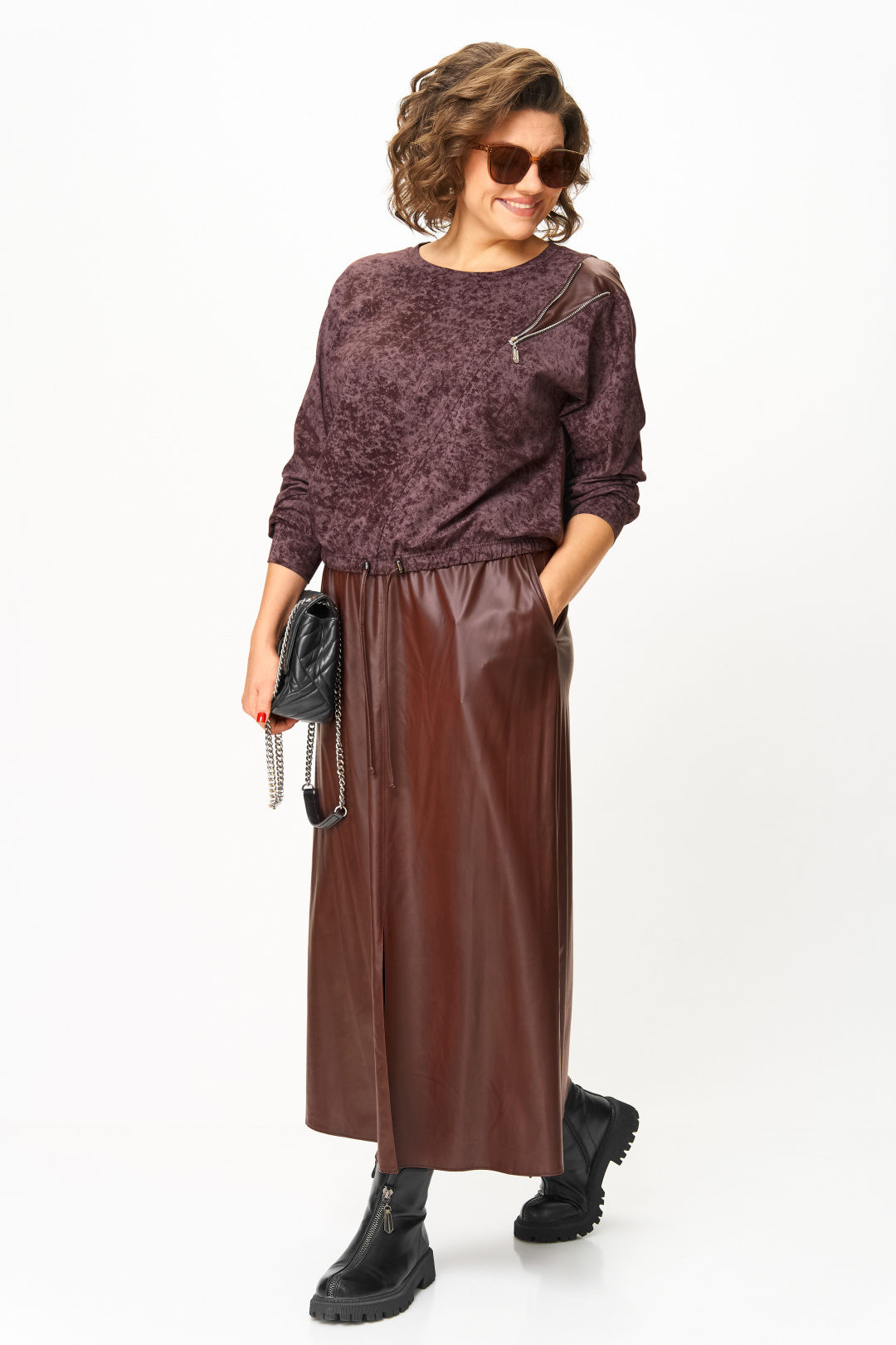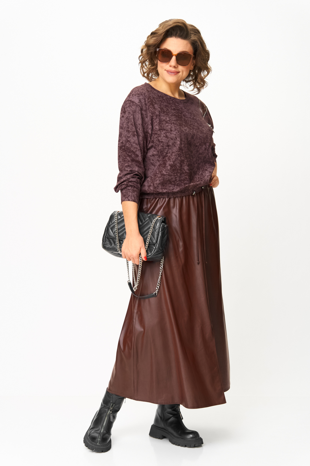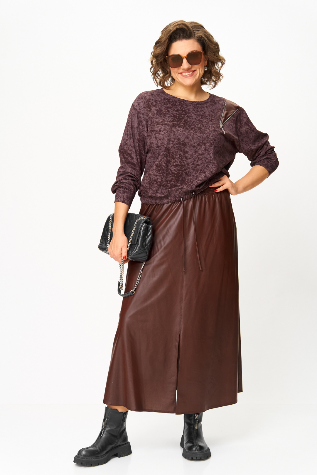 Юбка выполнена из трикотажного полотна с эффектом " кожи". Длина макси. Силуэт свободный , трапециевидный. Пояс юбки на резинке. Карманы в боковых швах. По центру юбки средний шов с отделкой. Заднее половина юбки аналогична передней.