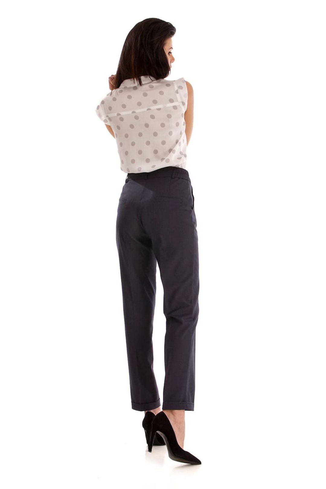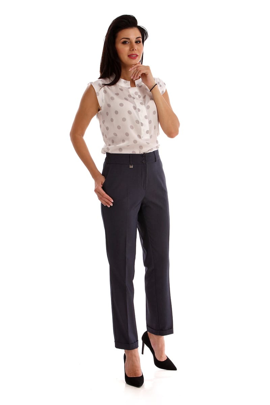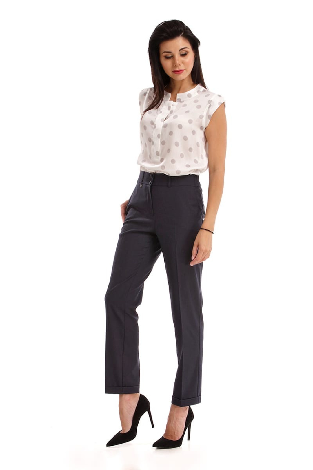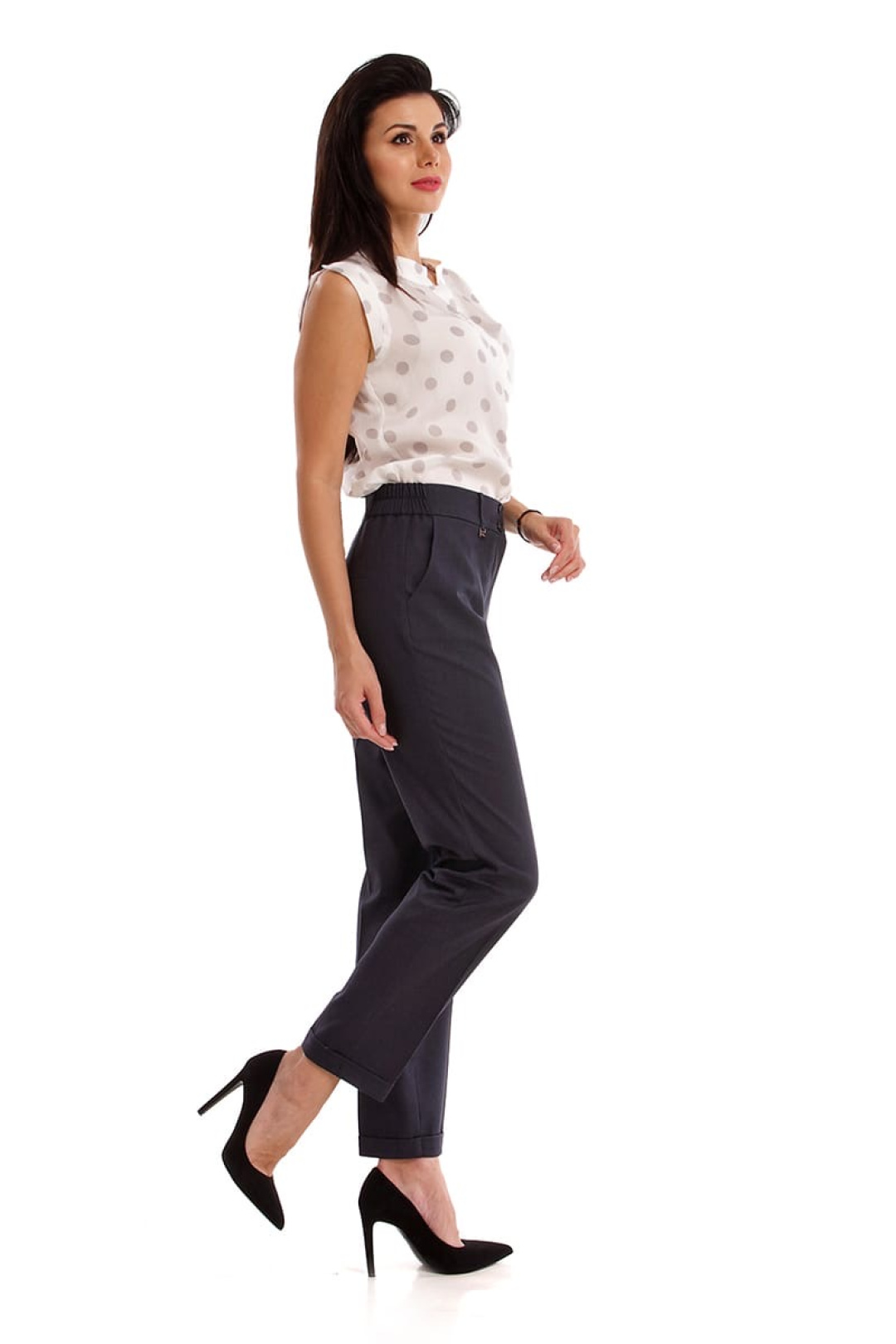 Брюки женские, заужены к низу. Посадка брюк высокая, пояс обработан с резинкой по бокам, низ брюк заканчивается манжетами. Застежка петля, пуговица, молния. По передним частям выполнены боковые карманы с прорезными бочками, по спинке талиевые вытачки с карманами имитацией и планками. Ткань достаточно хорошо тянется. Длина брюк по боковому шву 80 см.