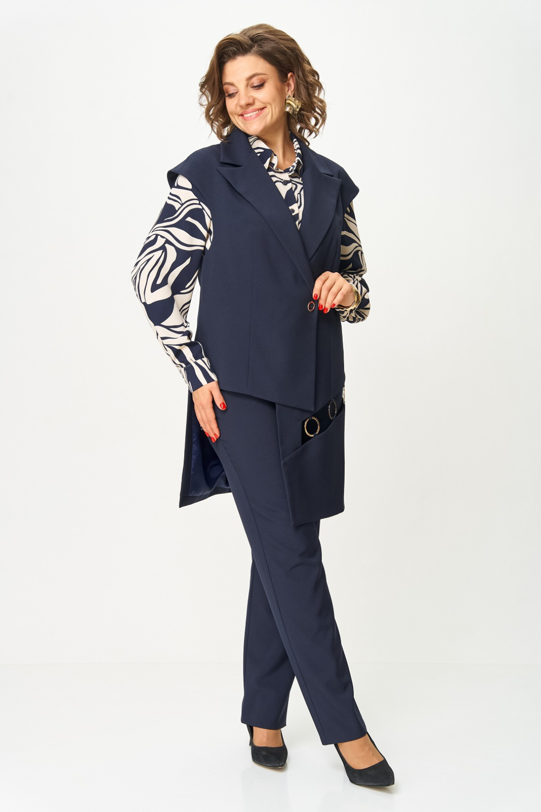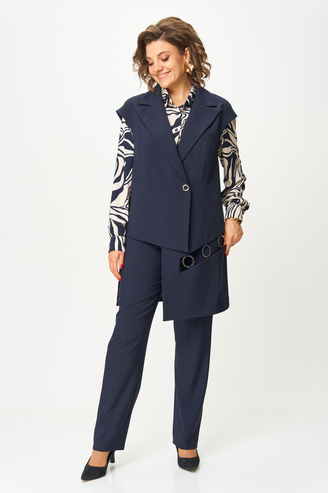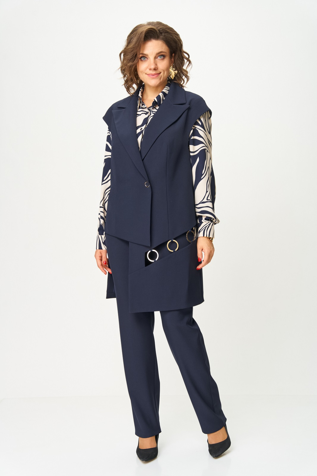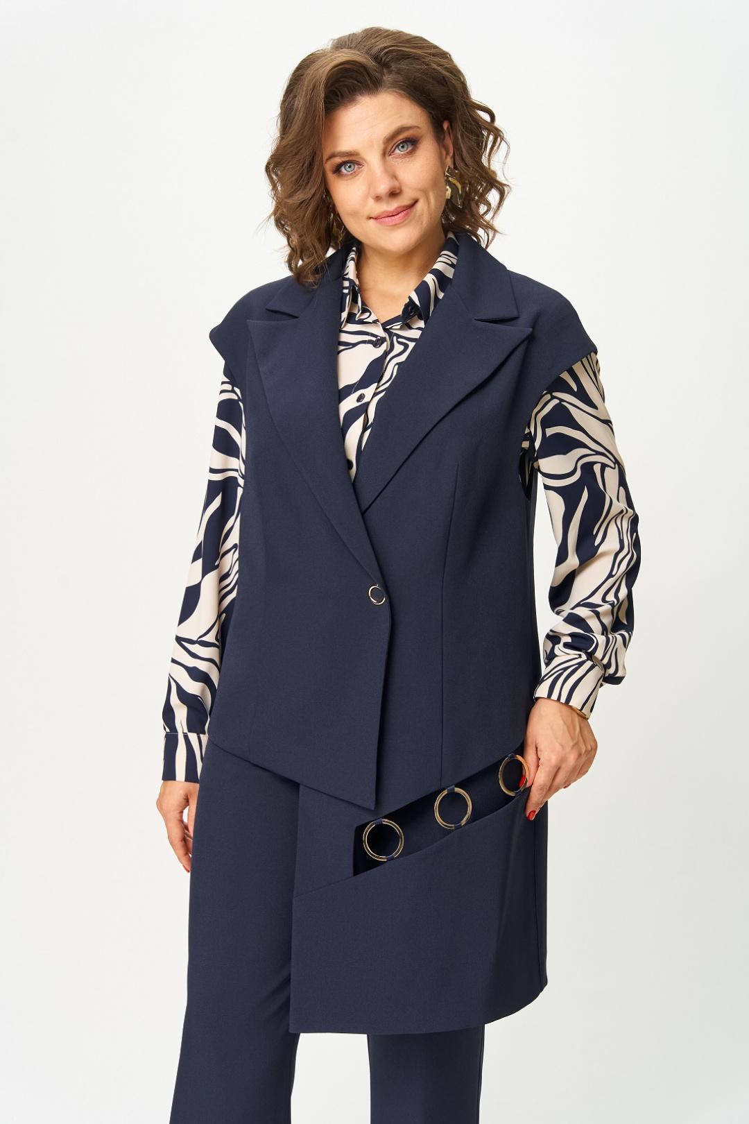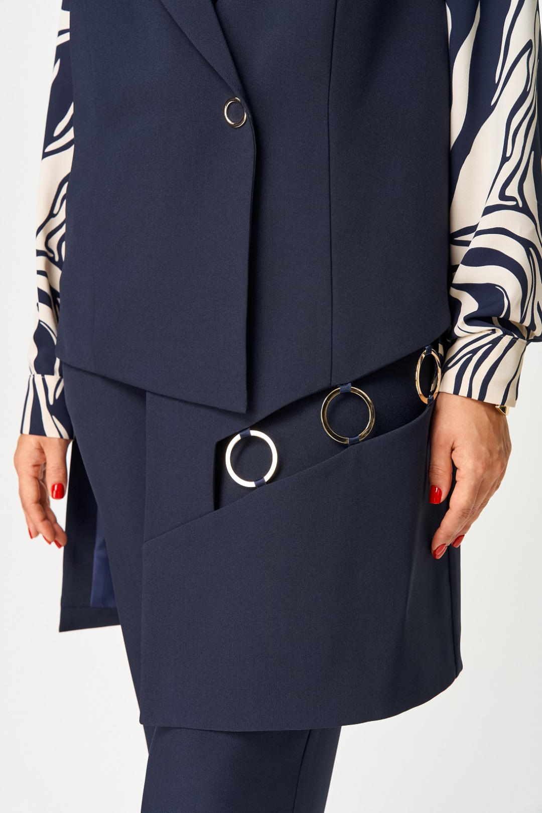 Нарядный женский комплект, состоящий из жилета, брюк и блузки. Брюки и жилет из ткани средней плотности с добавлением вискозы. Жилет на подкладке, с воротником пиджачного типа, ассиметричным низом и застежкой по талии на одну декоративную кнопку, рукав длинный. Нарядность и оригинальность жилету придают металлические кольца. Брюки длинные, прямые, с карманами в боковых швах, гульфиком и отрезным поясом с резинкой.