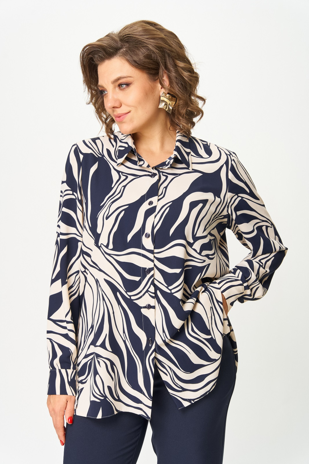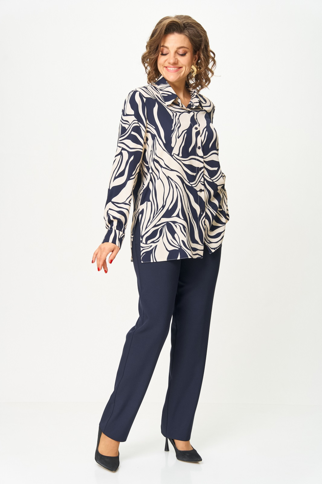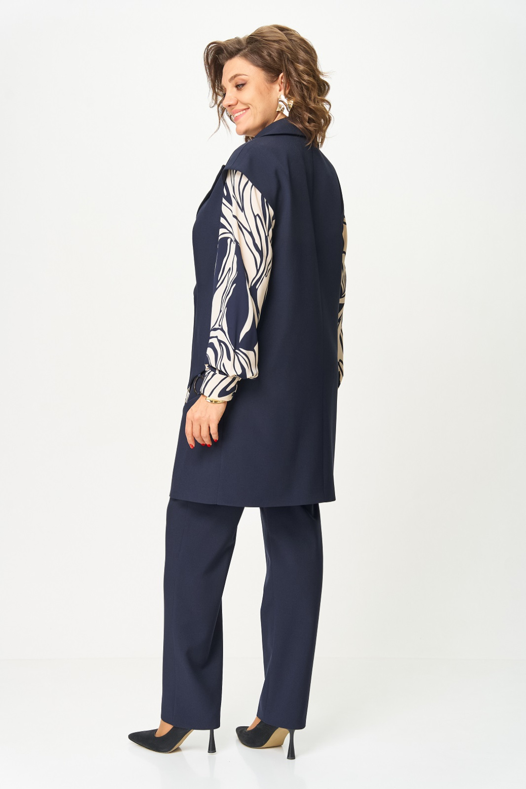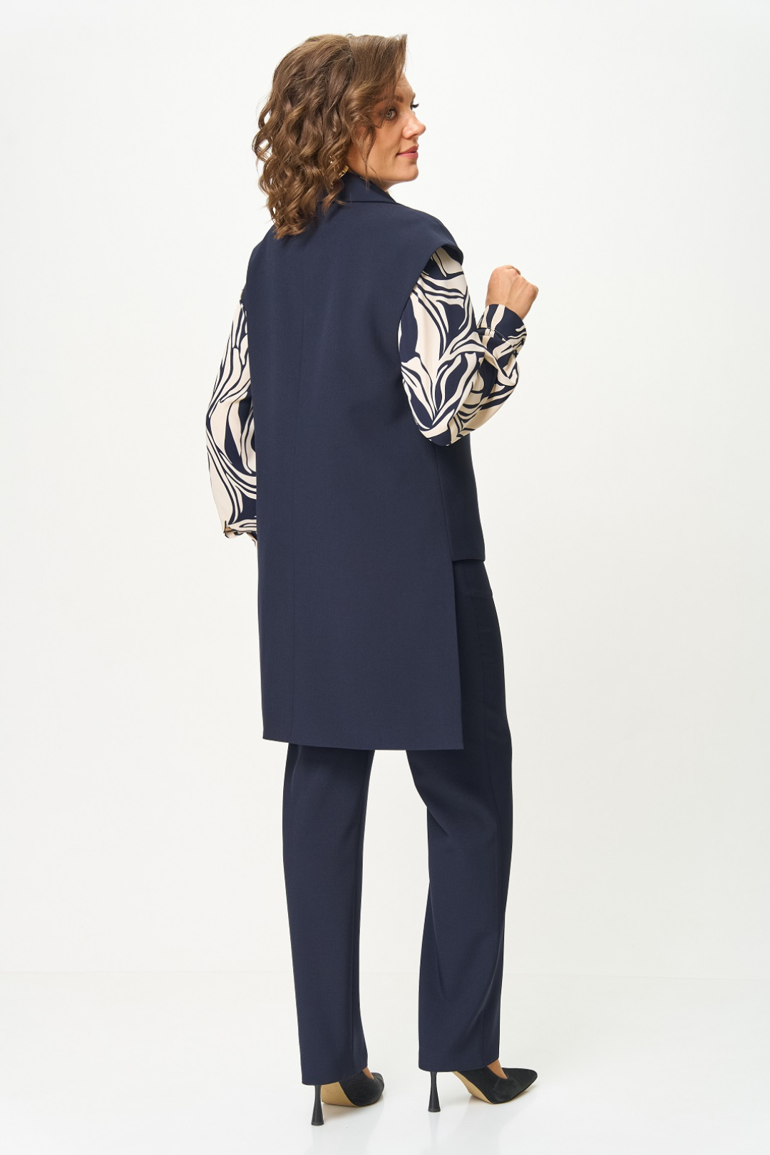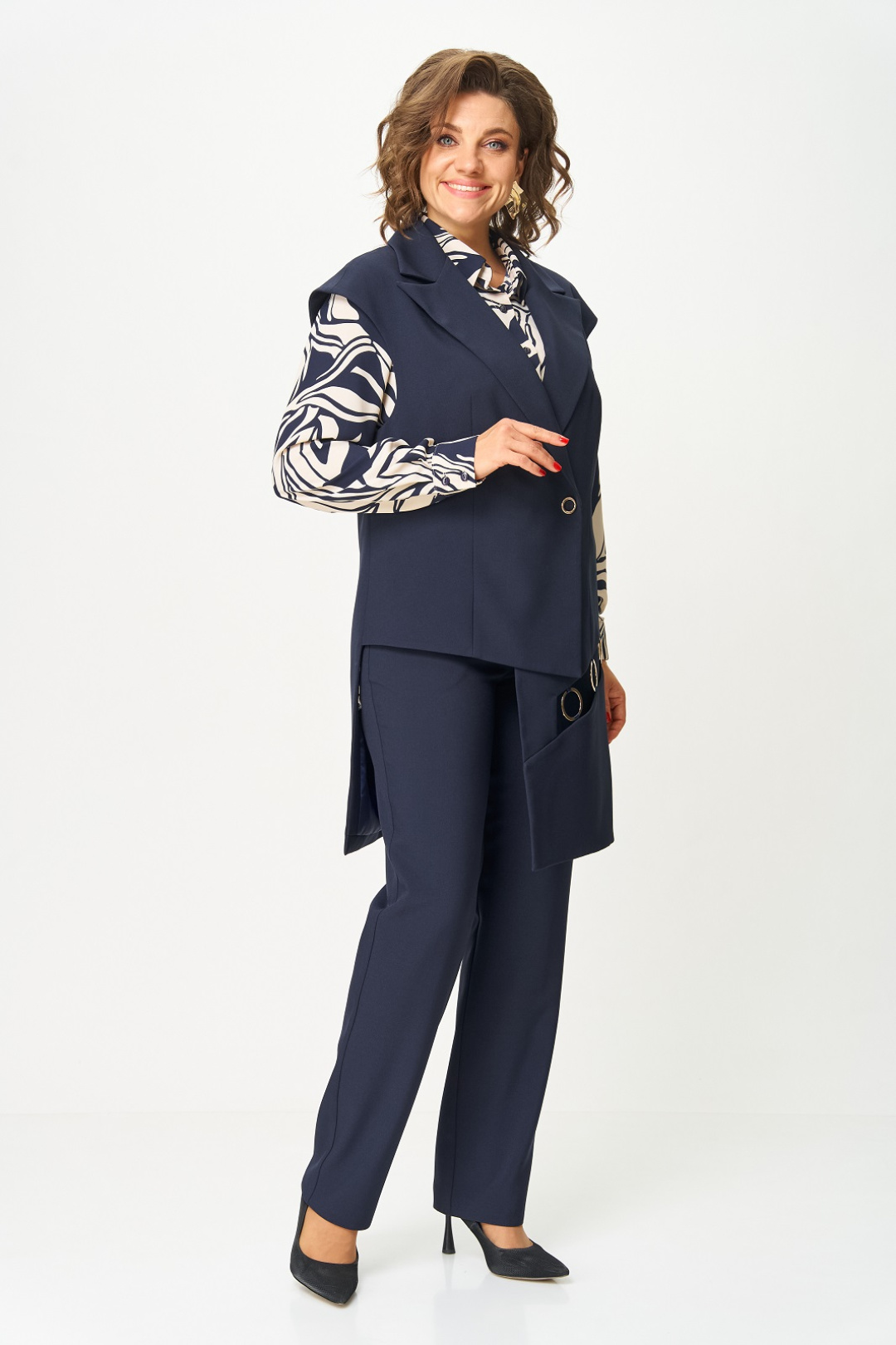 Нарядный женский комплект, состоящий из жилета, брюк и блузки. Брюки и жилет из ткани средней плотности с добавлением вискозы. Жилет на подкладке, с воротником пиджачного типа, ассиметричным низом и застежкой по талии на одну декоративную кнопку, рукав длинный. Нарядность и оригинальность жилету придают металлические кольца. Брюки длинные, прямые, с карманами в боковых швах, гульфиком и отрезным поясом с резинкой.