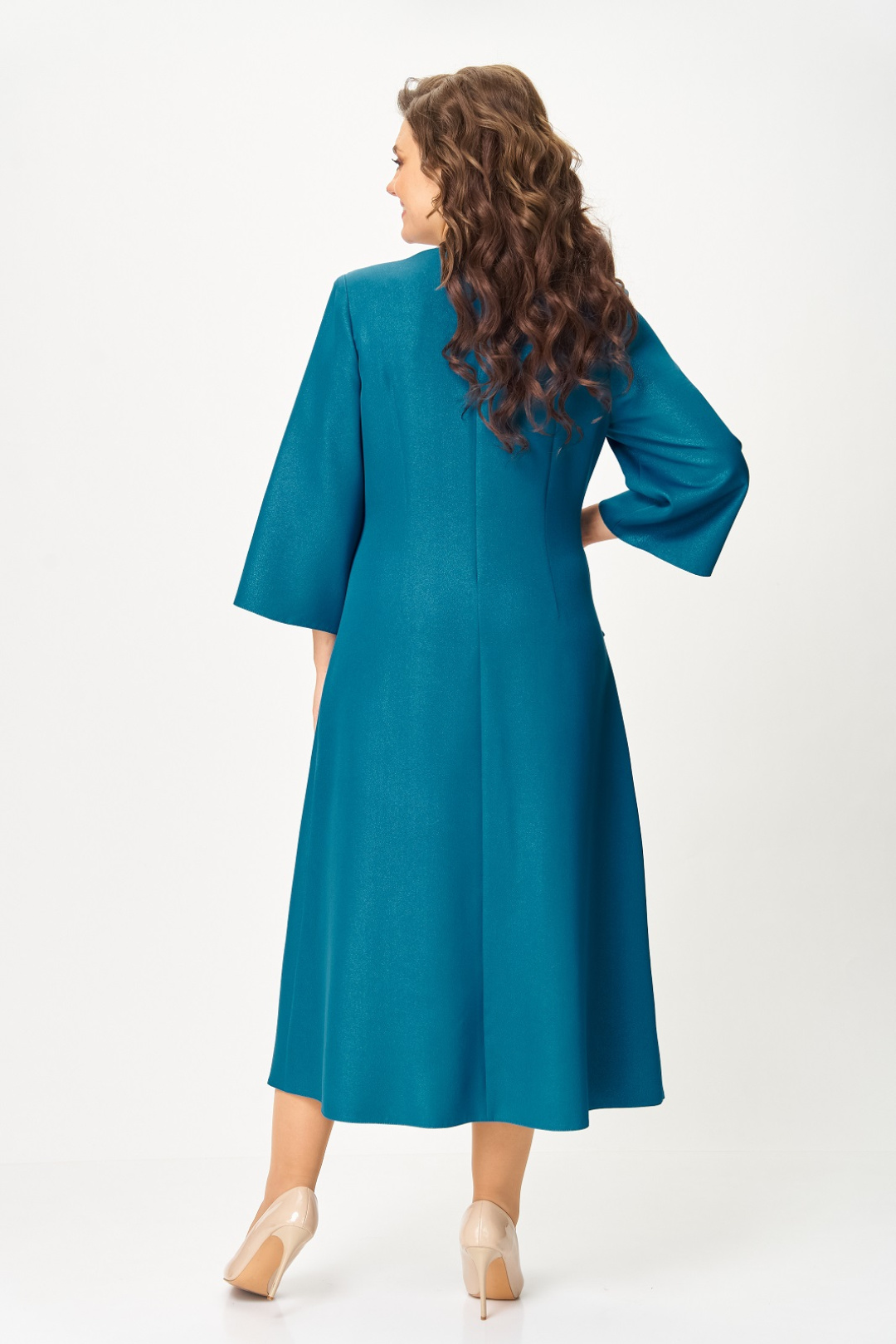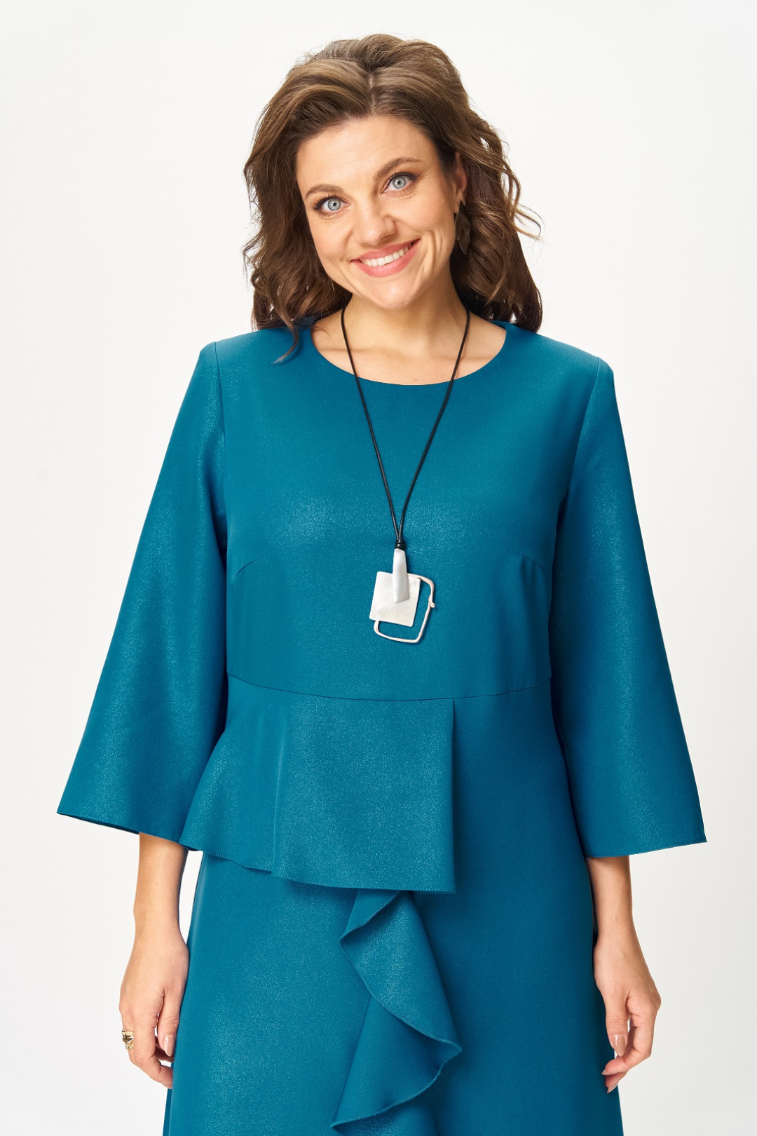 Нарядное женское платье из плательной ткани с легким блеском. Удлиненное, силуэт полуприлегающий, по переду отрезное по линии талии, с баской, воланом в шве и высоким разрезом по низу, вырез горловины круглый, с застежкой на потайную молнию в среднем шве по спинке, рукав 3/4 расширенный к низу.