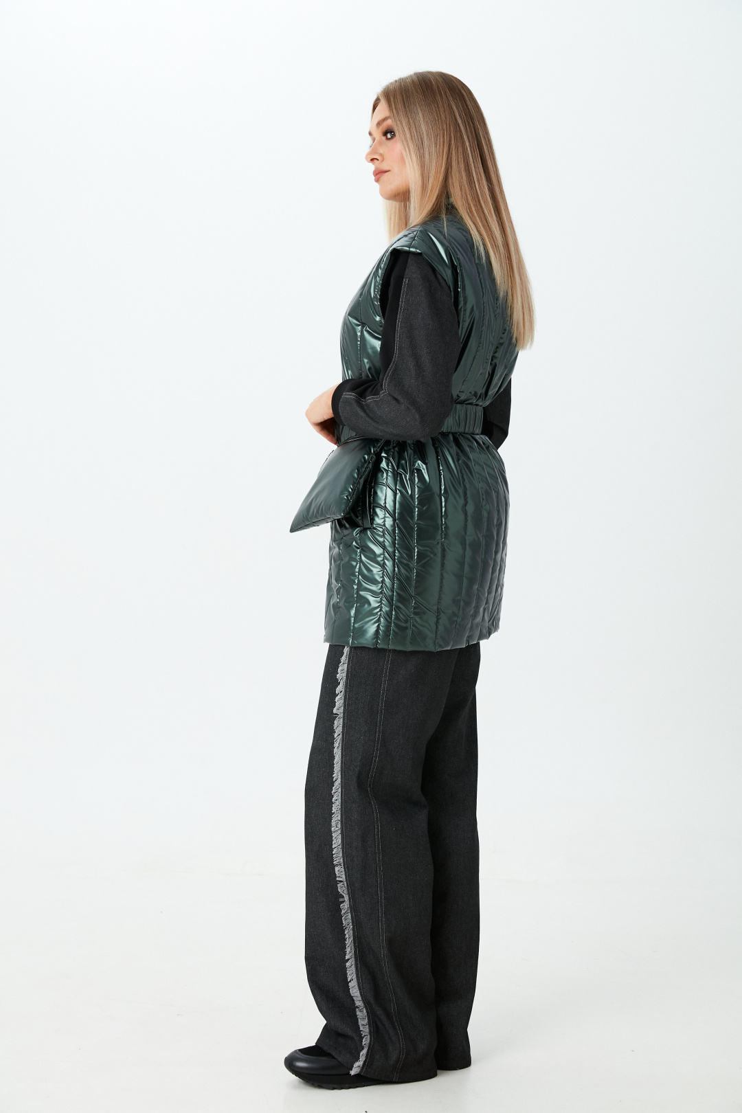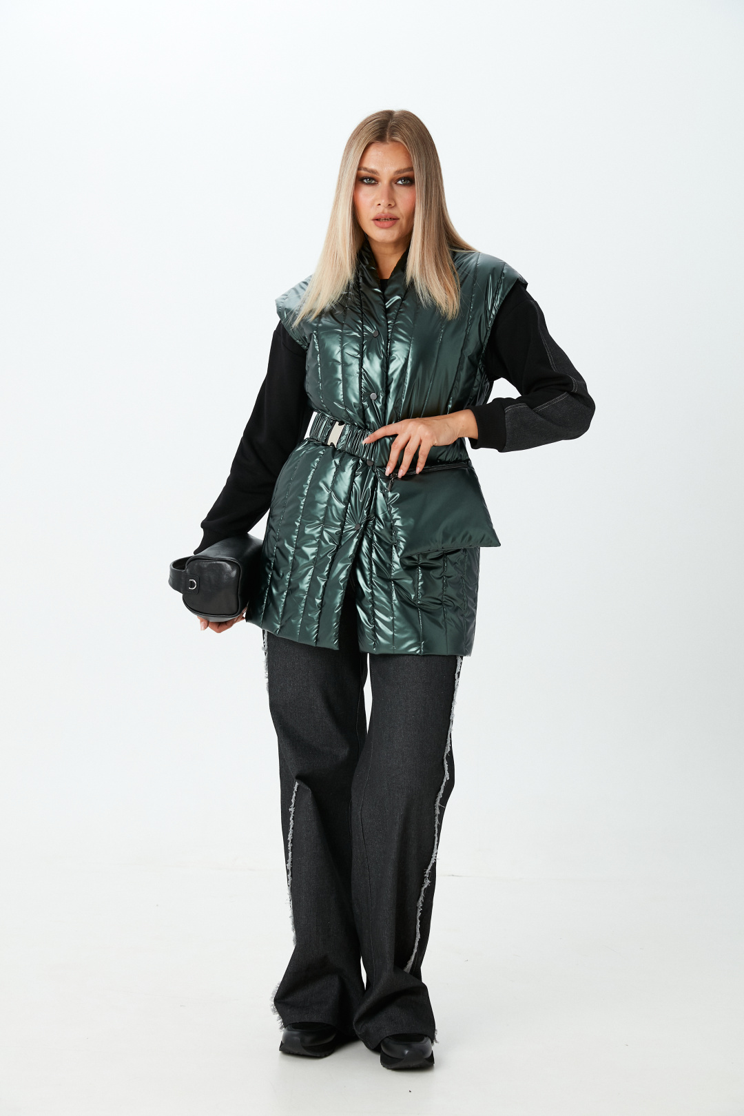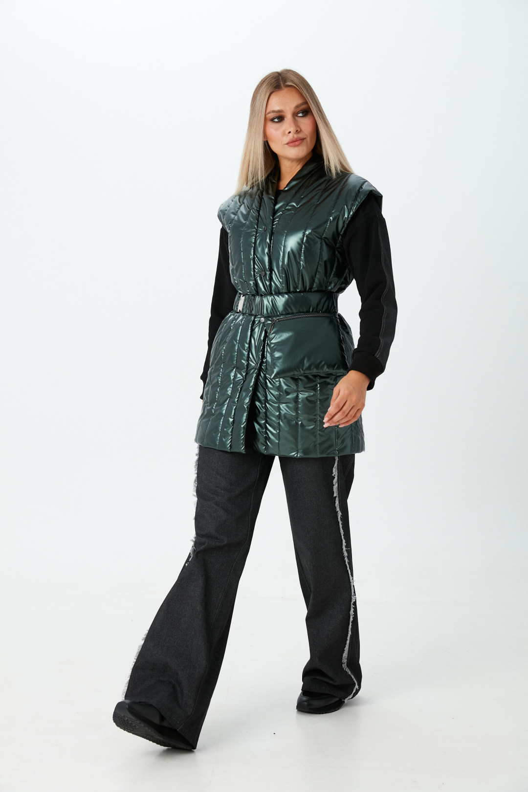 Утеплённый жилет из стёганой ткани. Застёжка на кнопки, по бокам расположены карманы. В комплекте идёт эластичный ремень, который дополняется съёмным карманом-сумкой. Жилет на подкладке.