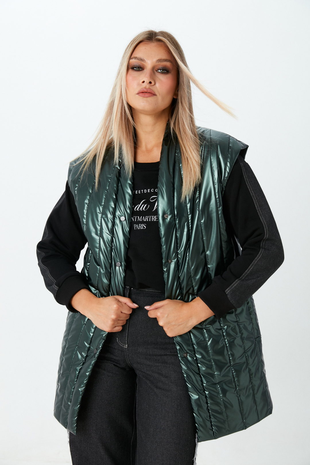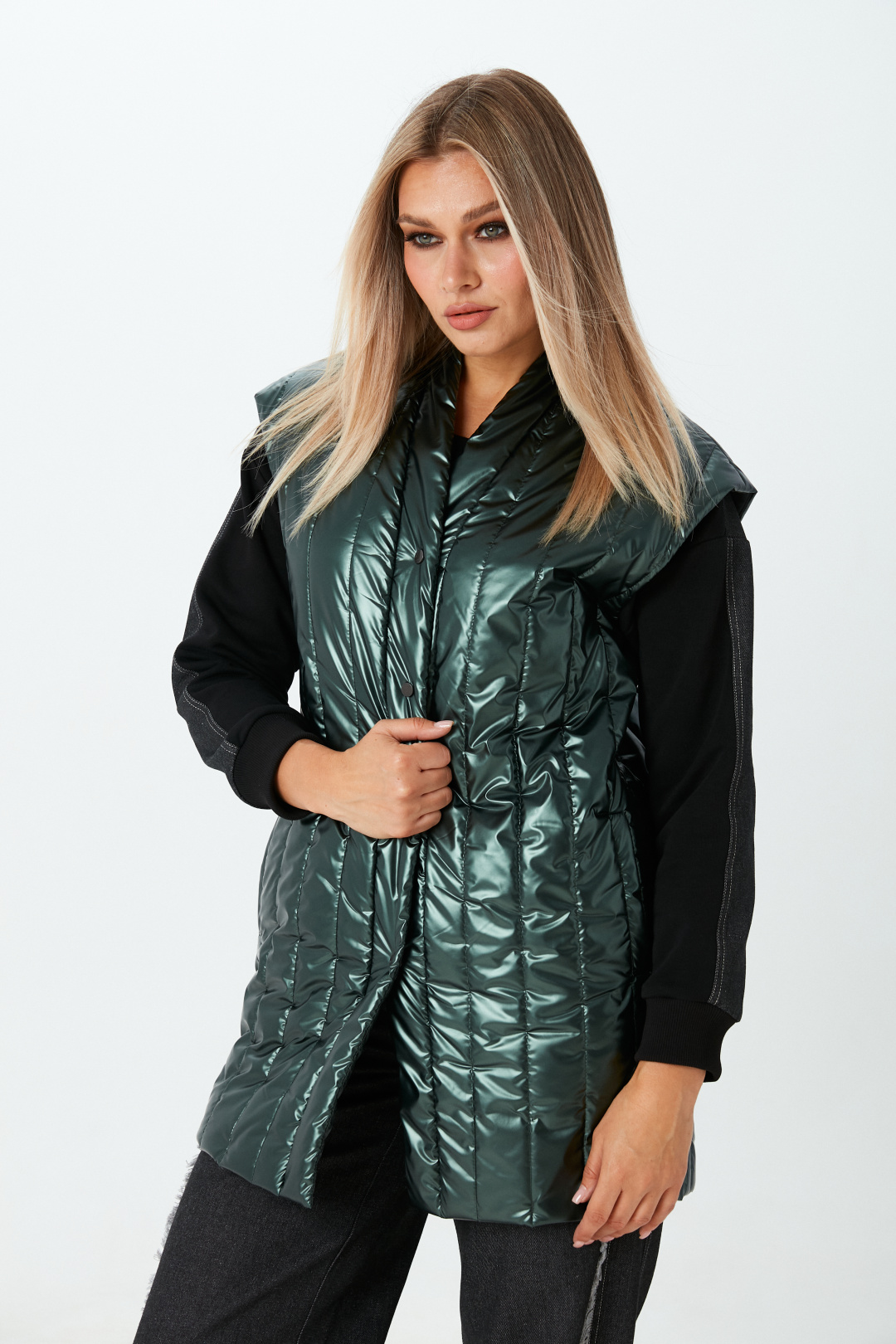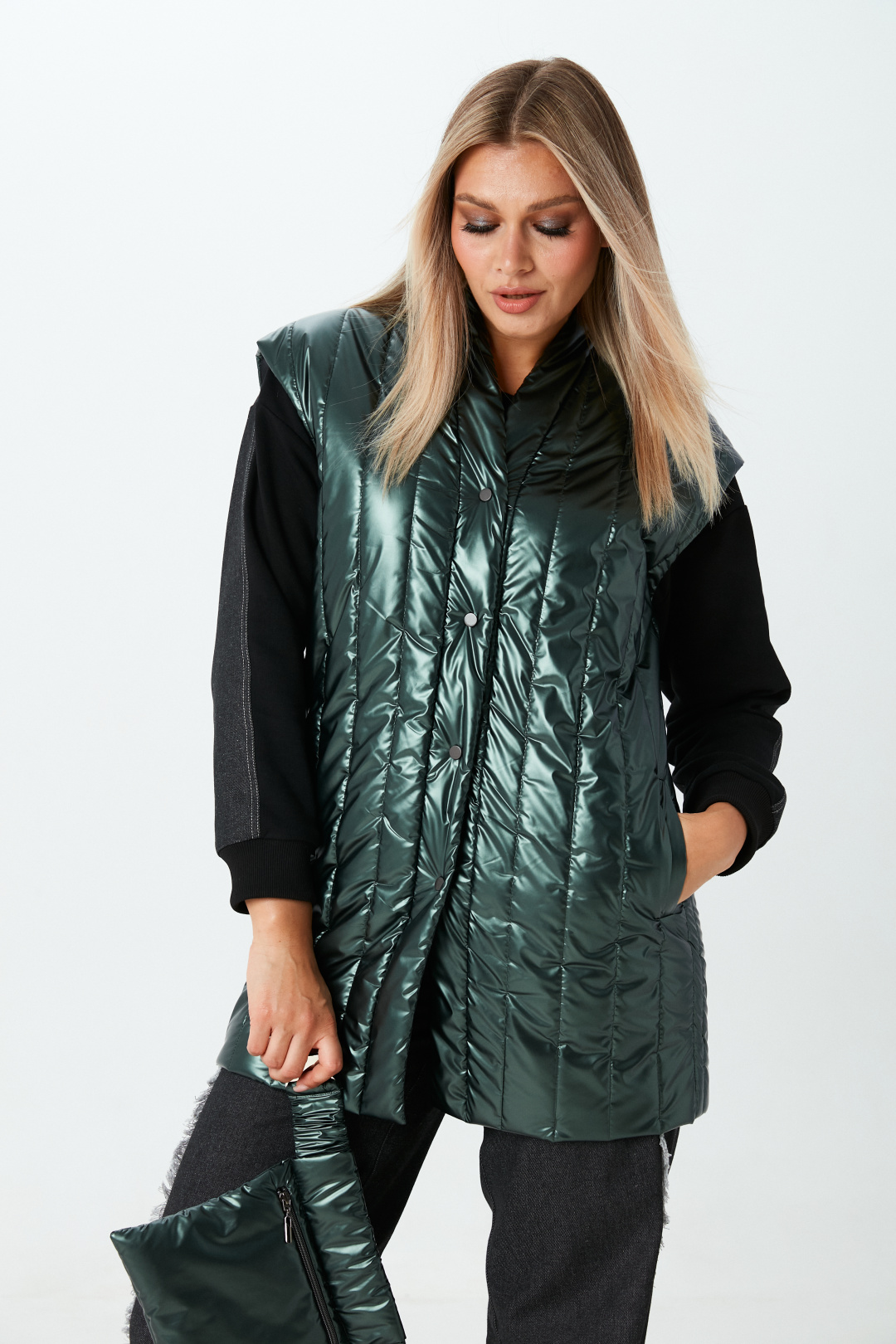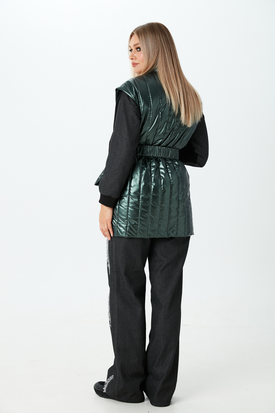 Утеплённый жилет из стёганой ткани. Застёжка на кнопки, по бокам расположены карманы. В комплекте идёт эластичный ремень, который дополняется съёмным карманом-сумкой. Жилет на подкладке.