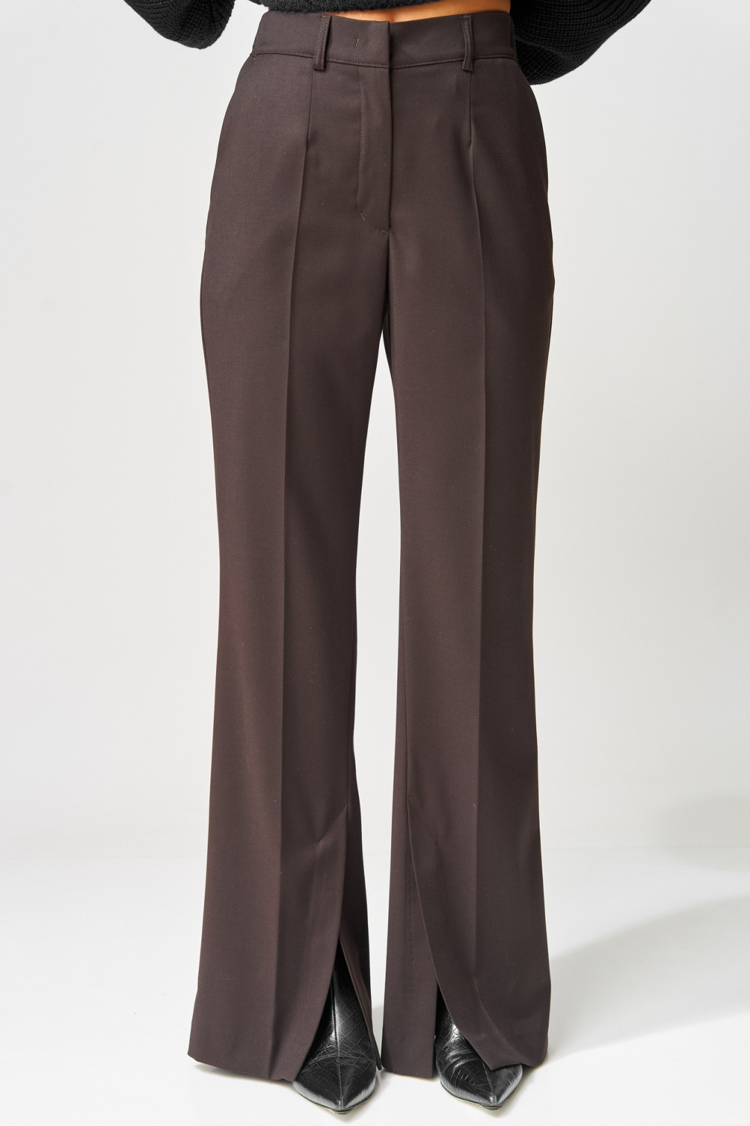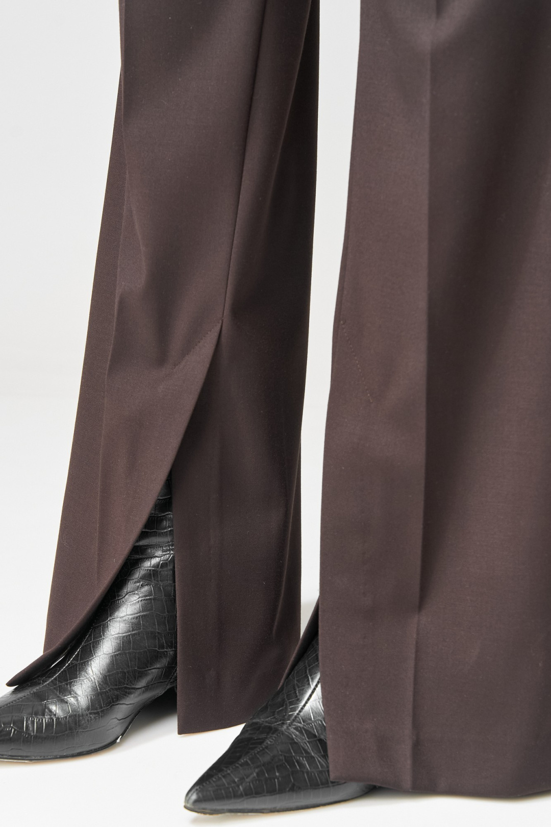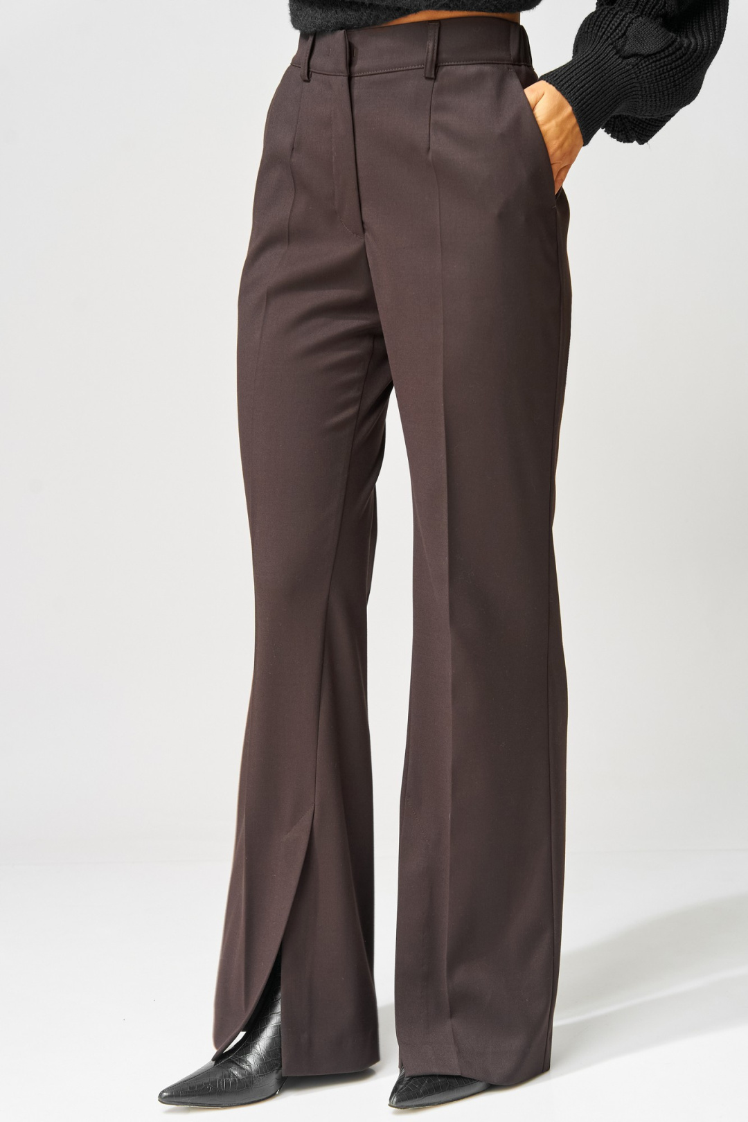 Брюки на бедрах, плотно облегающие вверху и расширенные к низу. Пояс притачной, по спинке пояса вставлена эластичная тесьма. Застежка на тесьму-молнию, 1 потайной крючок и 1 потайную петлю и пуговицу. В боковых швах обработаны наклонные карманы, на передних и задних половинках брюк обработаны вытачки и заутюжены «канты». Внизу шаговых швов обработаны шлицы. На поясе прикреплены 5 шлёвок.