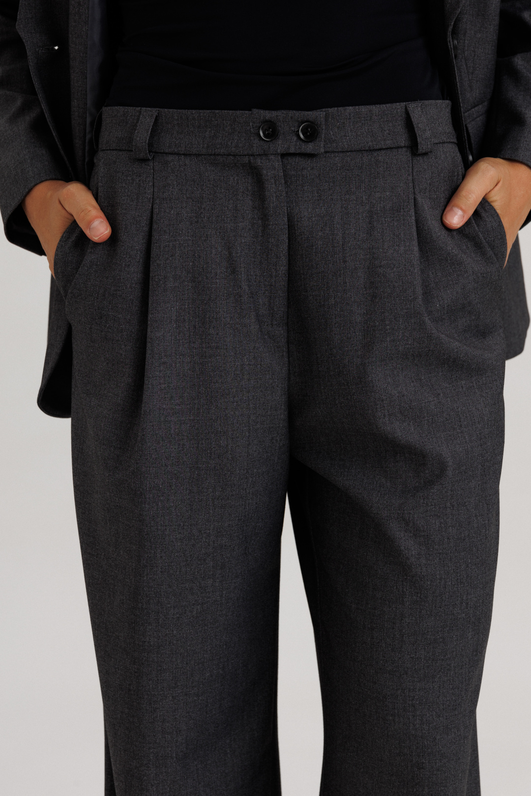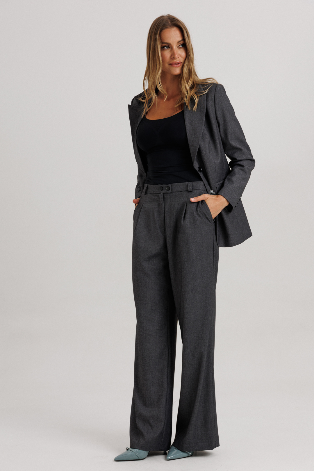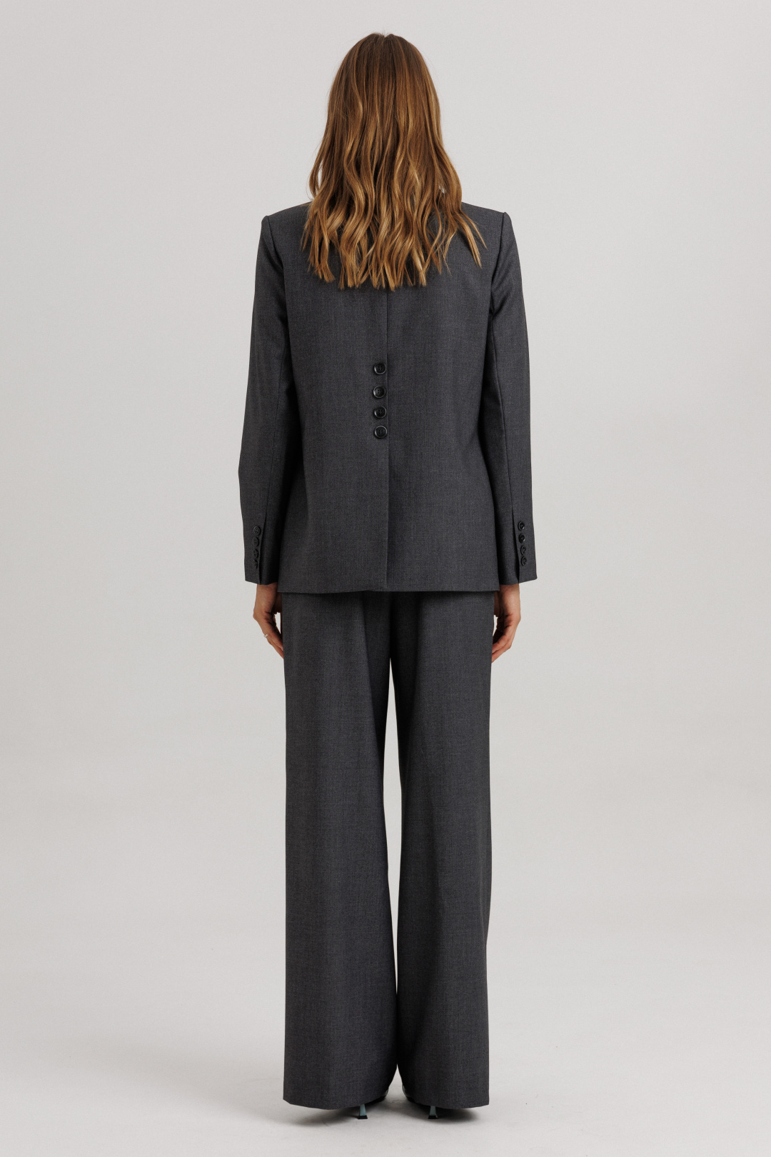 Стильный гармоничный комплект в стиле умеренного оверсайза, состоящий из свободного жакета и широких брюк. Эффектной деталью комплекта выступает высокая открытая шлица на спинке жакета, закрепленная пуговицами.