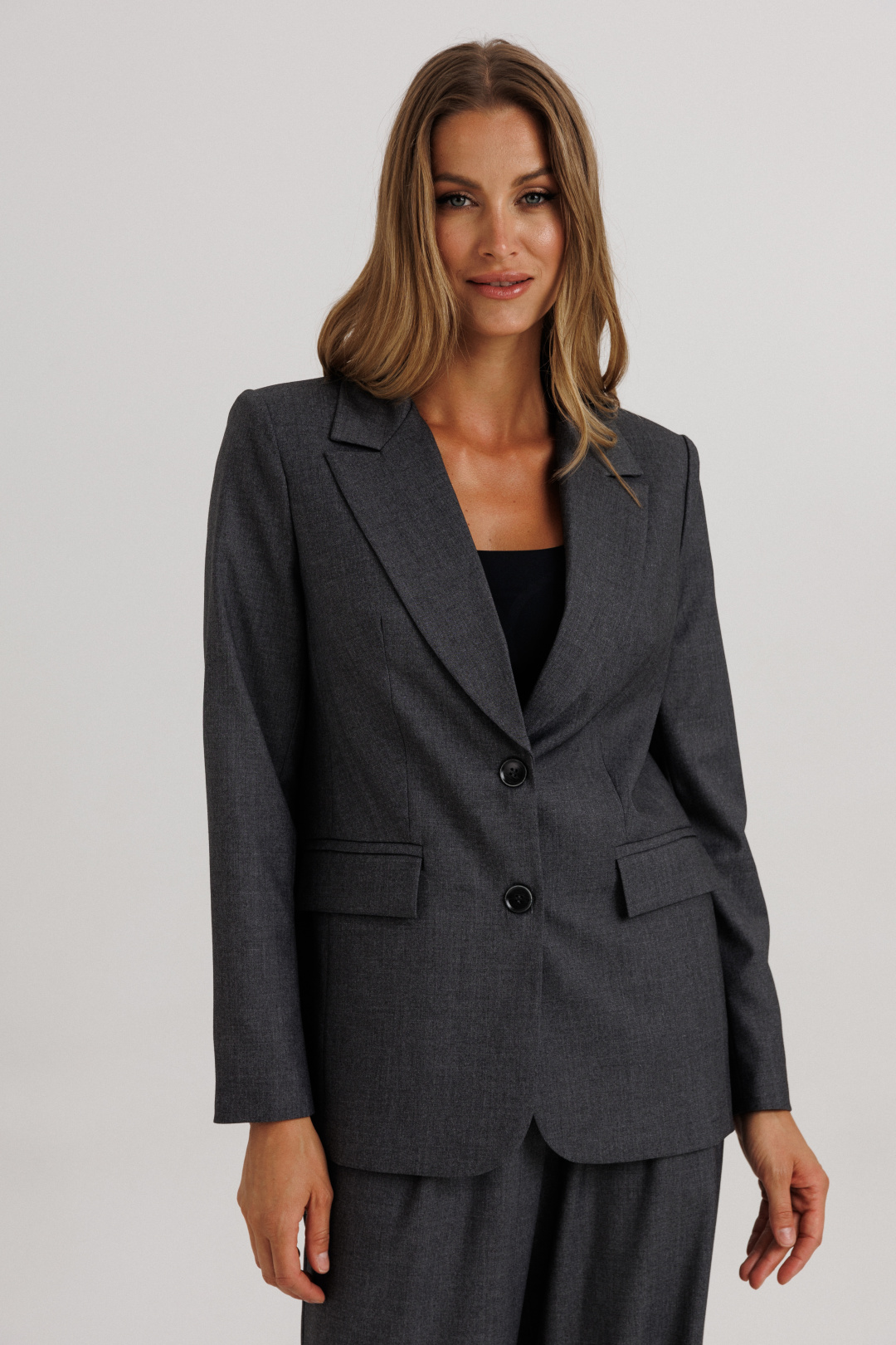 Жакет прямого свободного силуэта на подкладке. На полочке изделия расположены вертикальные выточки и притачные боковые детали. Фронтально горизонтально расположены функциональные прорезные карманы с листочкой и клапаном. Горловина оформлена глубоким английским отложным воротником с лацканами. На спинке жакета расположена открытая высокая шлица (38 см) в среднем шве изделия, которая закреплена нефункциональными пуговицами. Длина изделия жакета по среднему шву жакета 69-71 см (в зависимости от размерного ряда). Рукав двухшовный, длиной 60-61 см.