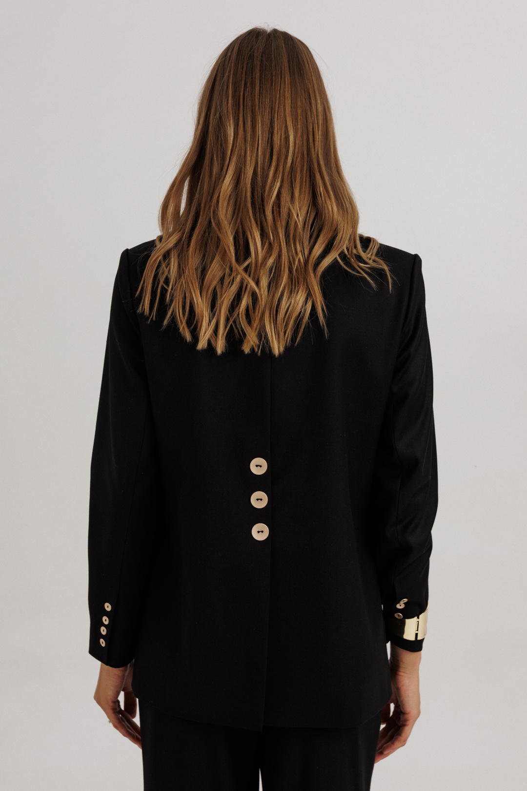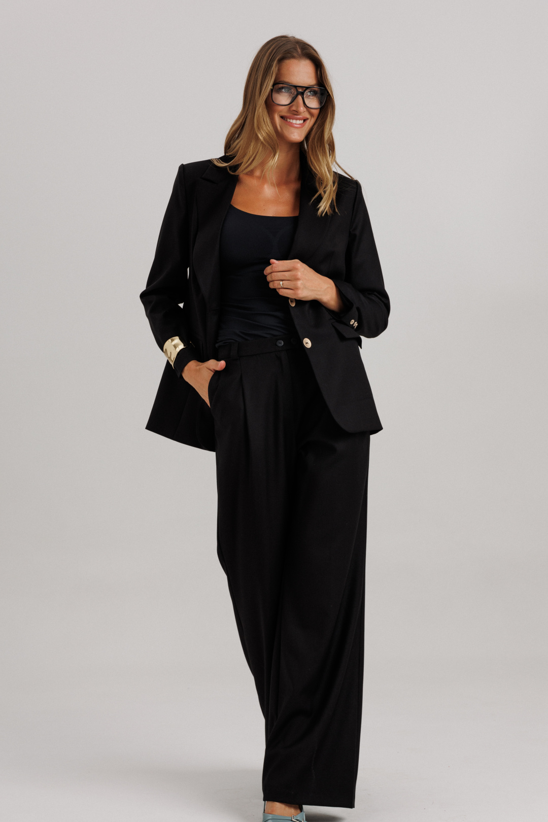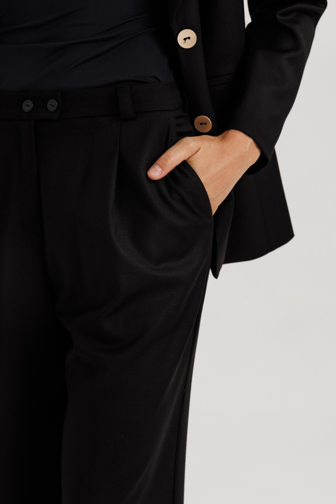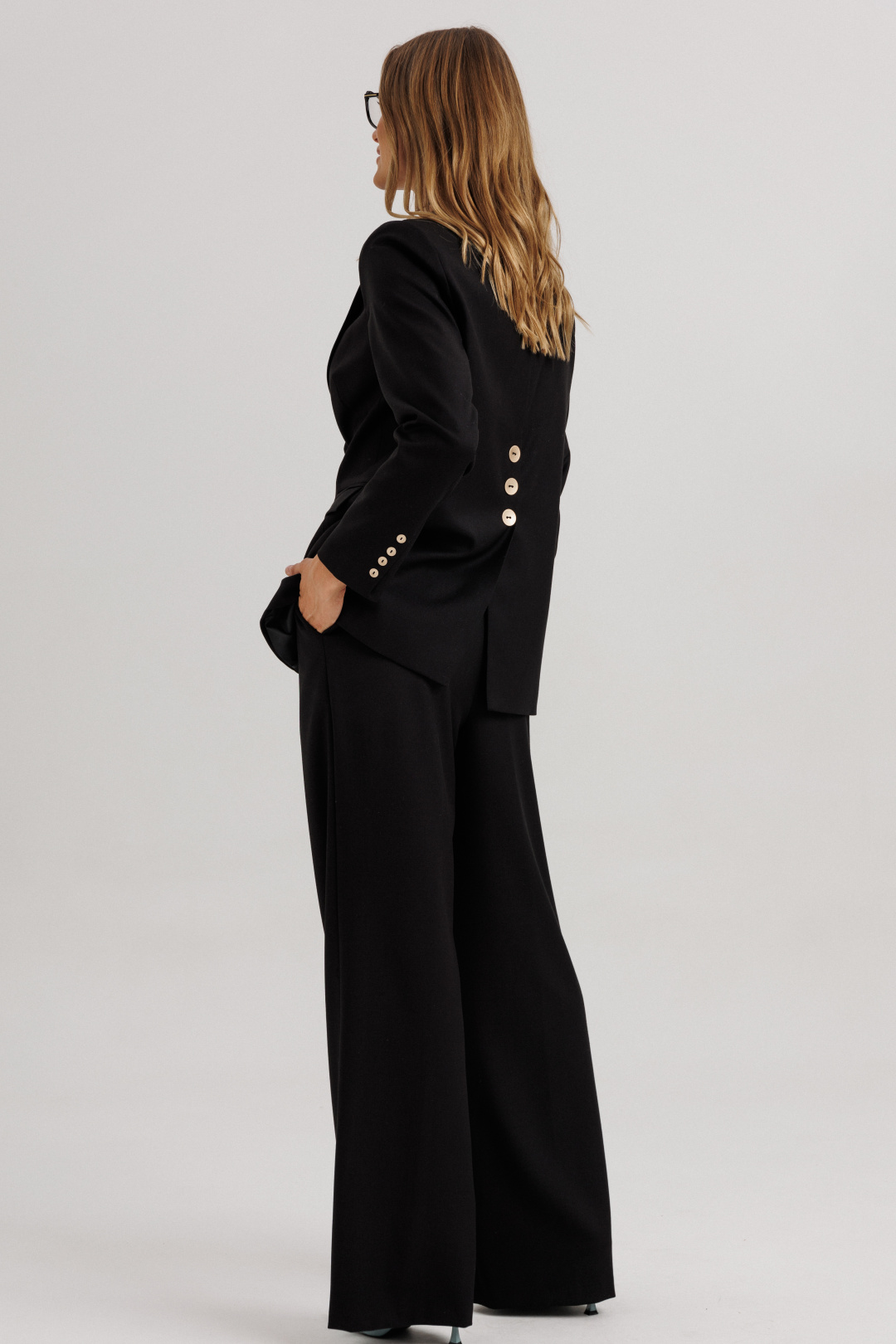 Стильный гармоничный комплект в стиле умеренного оверсайза, состоящий из свободного жакета и широких брюк. Эффектной деталью комплекта выступает высокая открытая шлица на спинке жакета, закрепленная пуговицами.