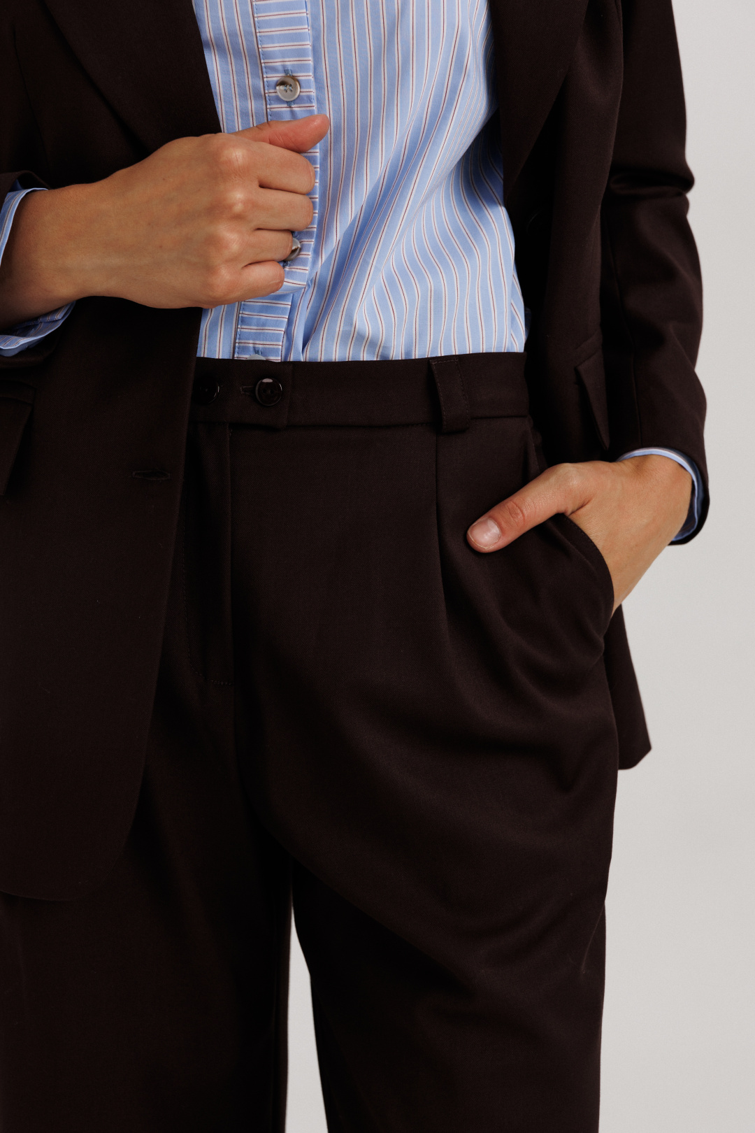 Стильный гармоничный комплект в стиле умеренного оверсайза, состоящий из свободного жакета и широких брюк, а также блузон классического силуэта.