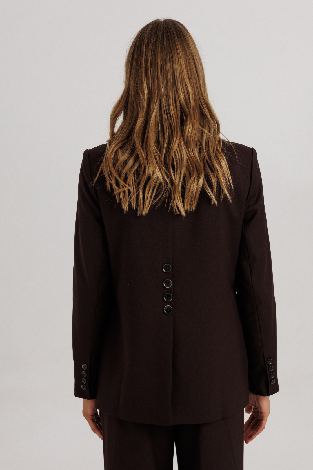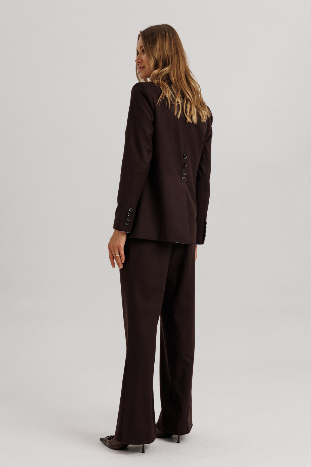 Эффектной деталью комплекта выступает высокая открытая шлица на спинке жакета, закрепленная пуговицами.
