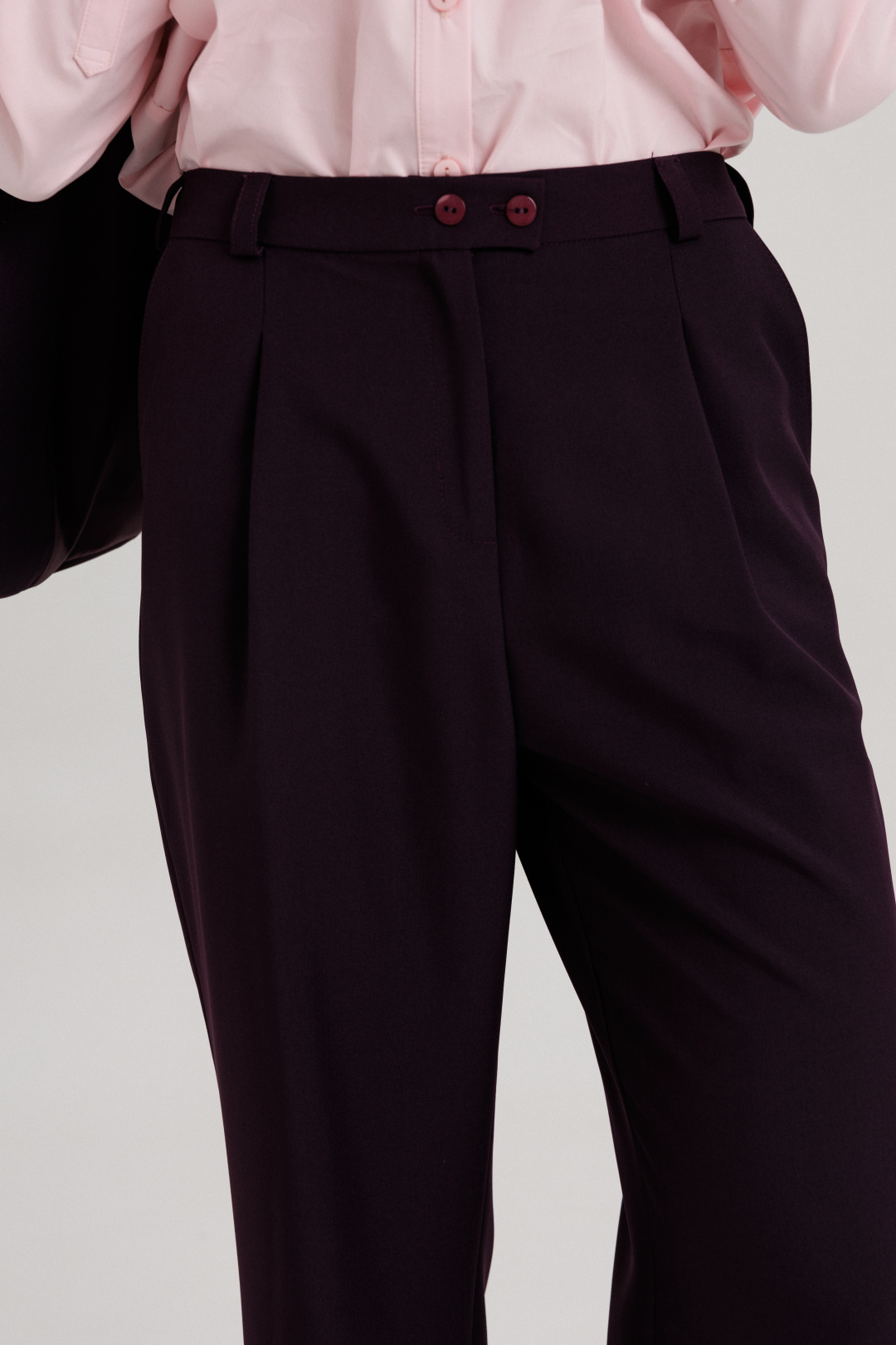 Брюки комплекта созданы в свободном стиле. В пояс брюк по спинке вставлена эластичная тесьма, шириной 3 см. Спереди пояс фиксируется горизонтально на петли/пуговицы и вертикалную закрытую клапан-молнию (гульфик).