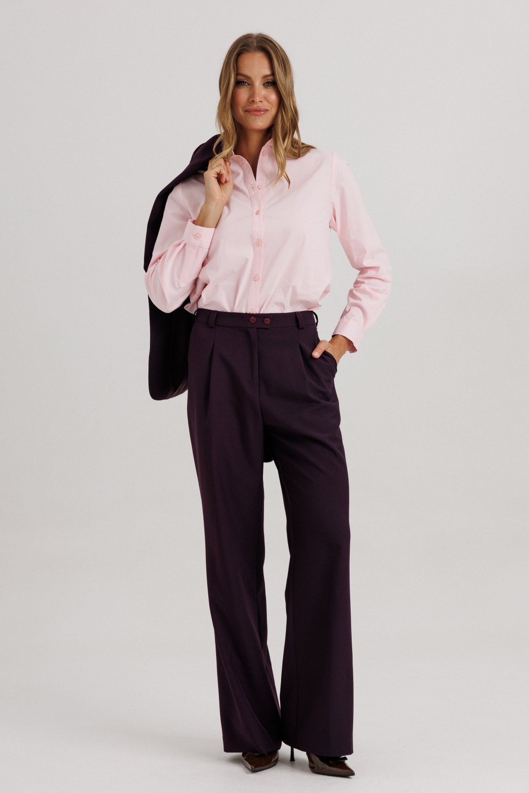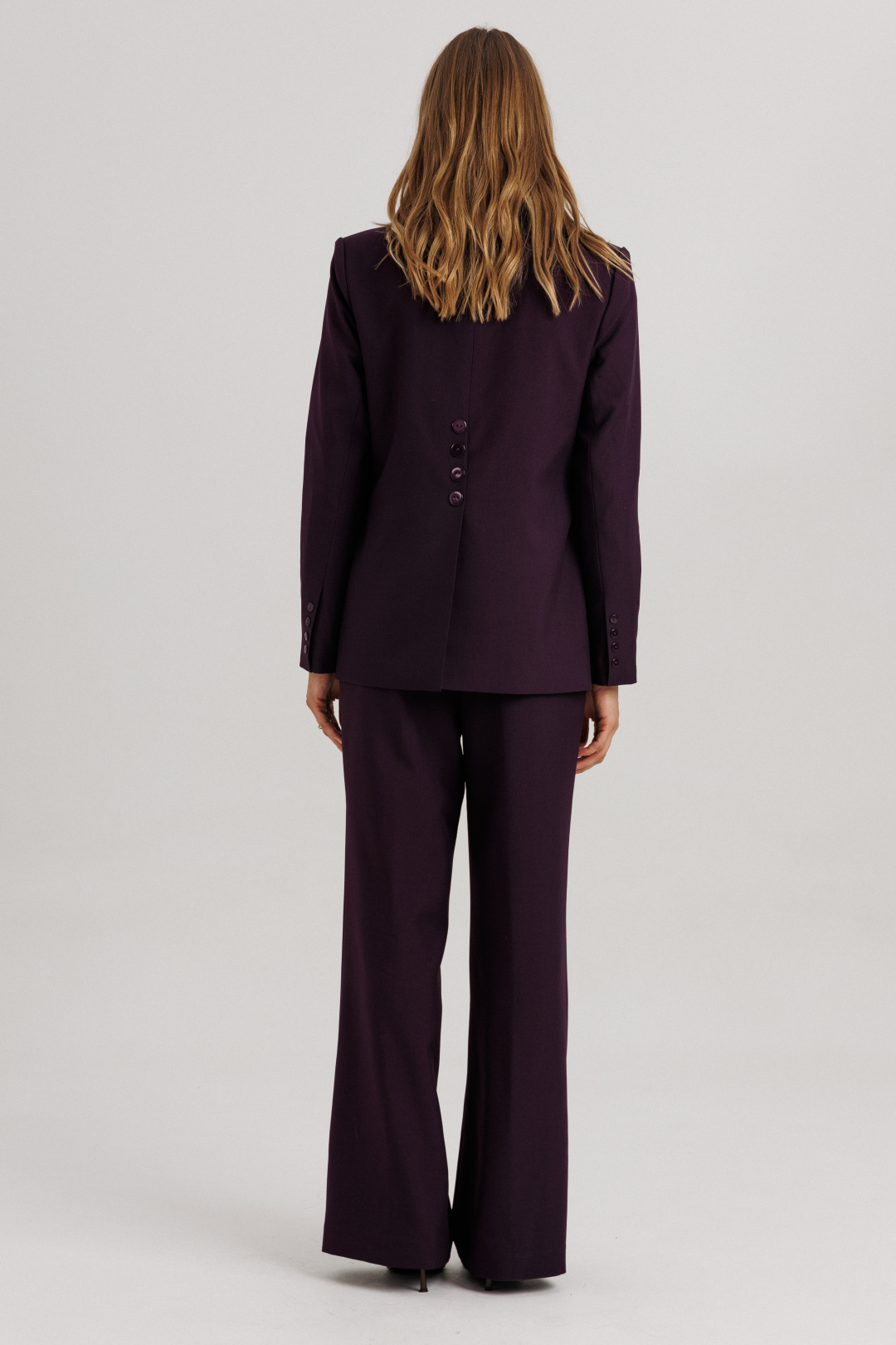 Стильный гармоничный комплект в стиле умеренного оверсайза, состоящий из свободного жакета и широких брюк, а также блузона. Эффектной деталью комплекта выступает высокая открытая шлица на спинке жакета, закрепленная пуговицами.