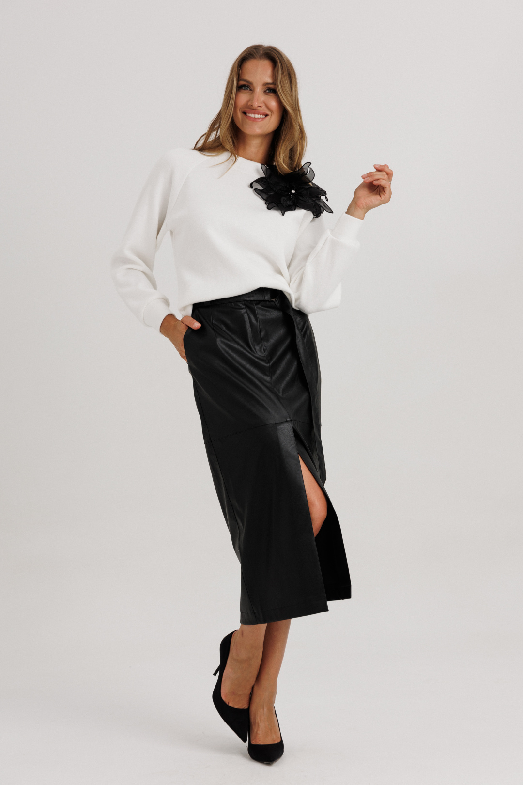 Юбка выполнена из эко-кожи прямого силуэта. Спереди: центральный разрез-шлица, высотой 46 см. Также, в центральном шве расположена застежка на молнию. Также юбка имеет горизонтальные линии с декоративной строчкой, высота кокетки 34 см.