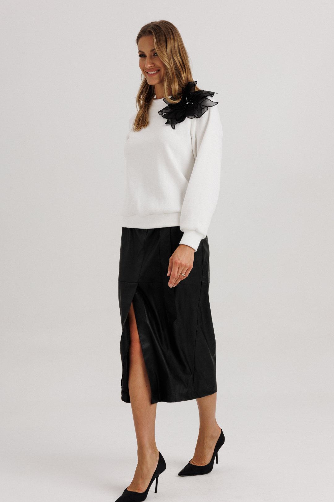 Юбка выполнена из эко-кожи прямого силуэта. Спереди: центральный разрез - шлица высотой 46 см. Также в центральном шве расположена застежка на молнию. Также юбка имеет горизонтальные линии с декоративной строчкой, высота кокетки 34 см.