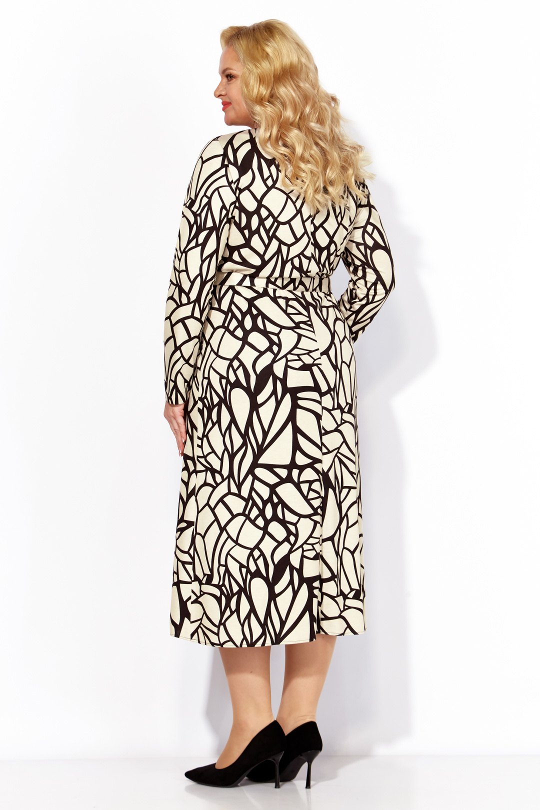 Повседневное трикотажное платье на рост 164 см. По талии горизонтальный подрез спереди и сзади. До талии платье полуприлегающего силуэта, от талии вниз – А силуэт. Рукав втачной длинный. Вырез горловины круглый. Нагрудные вытачки из проймы. Платье с поясом из основной ткани, фиксирующийся на полукольцах. По спинке средний шов.