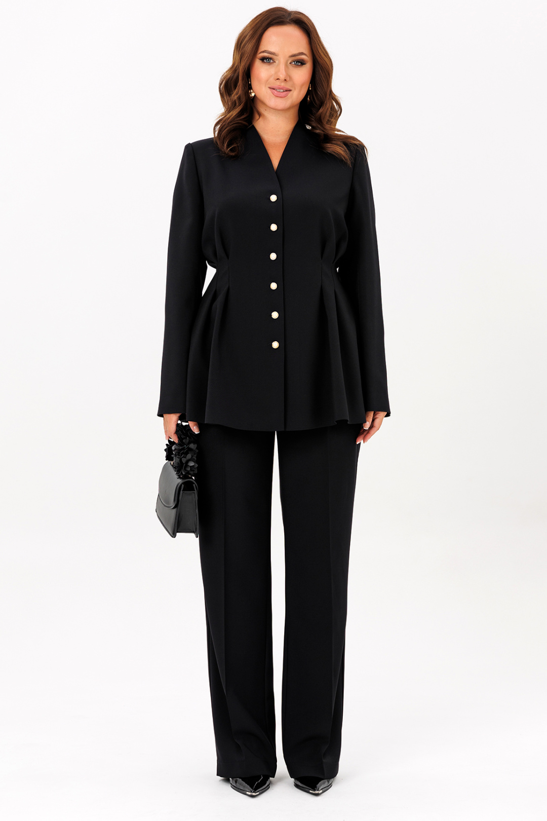 Жакет выполнен из костюмной ткани. Жакет Х-образного силуэта, длиной чуть ниже линии бёдер. Спереди центральная застежка на петли и пуговицы. По переду и спинке в области талии заложены складки. Спинка со средним швом. Воротник - цельнокроеная стойка. Рукав втачной двух шовный. Жакет на подкладке. Брюки прямого кроя. На передних половинках небольшая складка, переходящая в стрелку. Верхний срез брюк обработан притачным поясом, по бокам вставлена резинка, имеются шлёвки под ремень. Застёжка брюк по типу «гульфик». В боковых швах карманы «хулиганы». На задних половинках брюк вытачки.