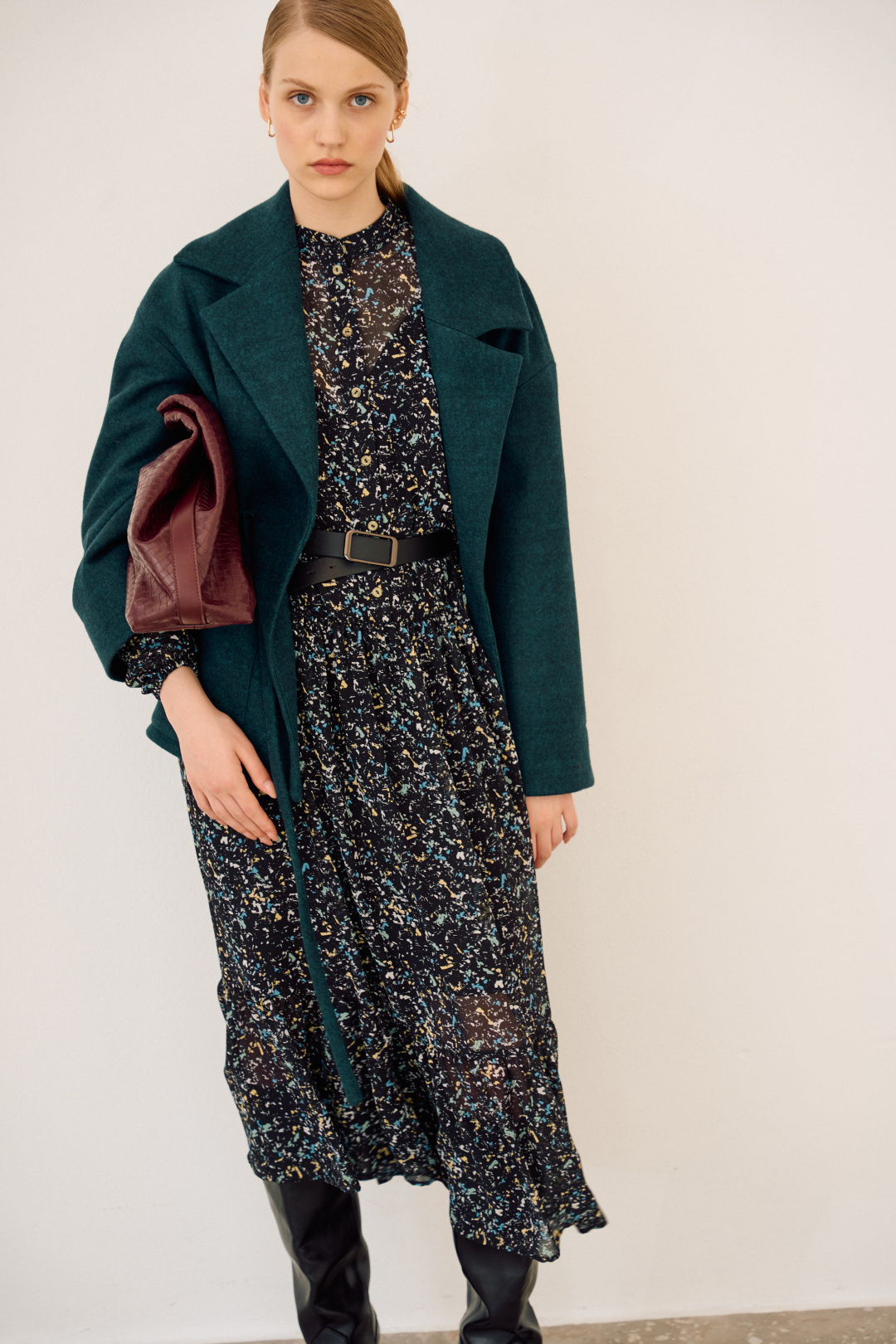 Шифоновое платье, которое идеально подойдёт для создания лёгкого многослойного образа. Платье состоит, из двух слоёв. Верхний слой выполнен из нежного шифона, нижний - это комбинация из трикотажной лёгкой подкладки. Платье свободного кроя «А»-силуэта с втачным длинным рукавом, по низу рукава притачная манжета на застёжку петли и пуговицы. По горловине стойка, по переду притачная планка, застёжка центральная на петли и пуговицы. К нижней части лифа платья ярусами нашиты воланы в сборку. В комплект входит кожаный ремень.