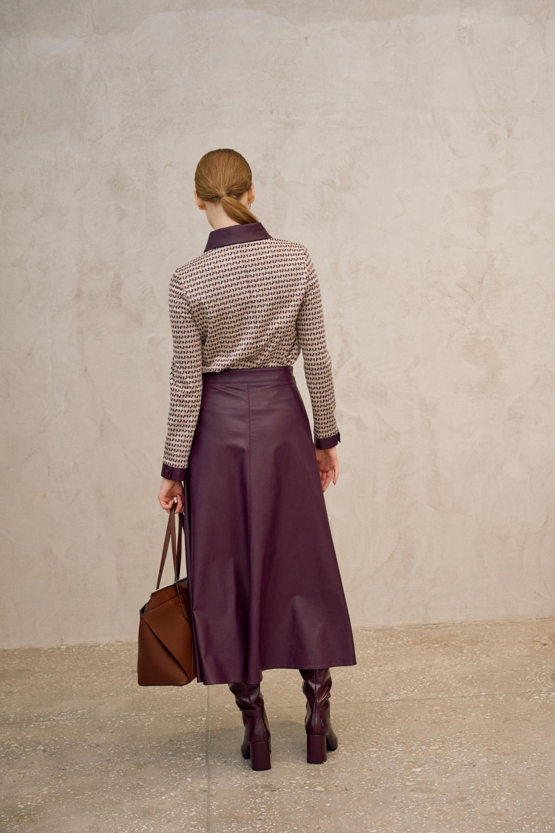 Элегантная юбка А-силуэта из гладкой, благородного винного оттенка ткани представляет собой идеальный выбор для создания роскошного образа. Она выполнена на притачном поясе и укомплектована подкладкой для дополнительного комфорта. Вдоль передней и задней части изделия проходит аккуратный средний шов, придающий строгий и изысканный вид. Застёжка на потайную молнию, расположенная сзади, обеспечивает легкость надевания и идеальную посадку. Эта юбка будет выгодно подчеркивать изящество фигуры и гармонично сочетаться с различными элементами гардероба.